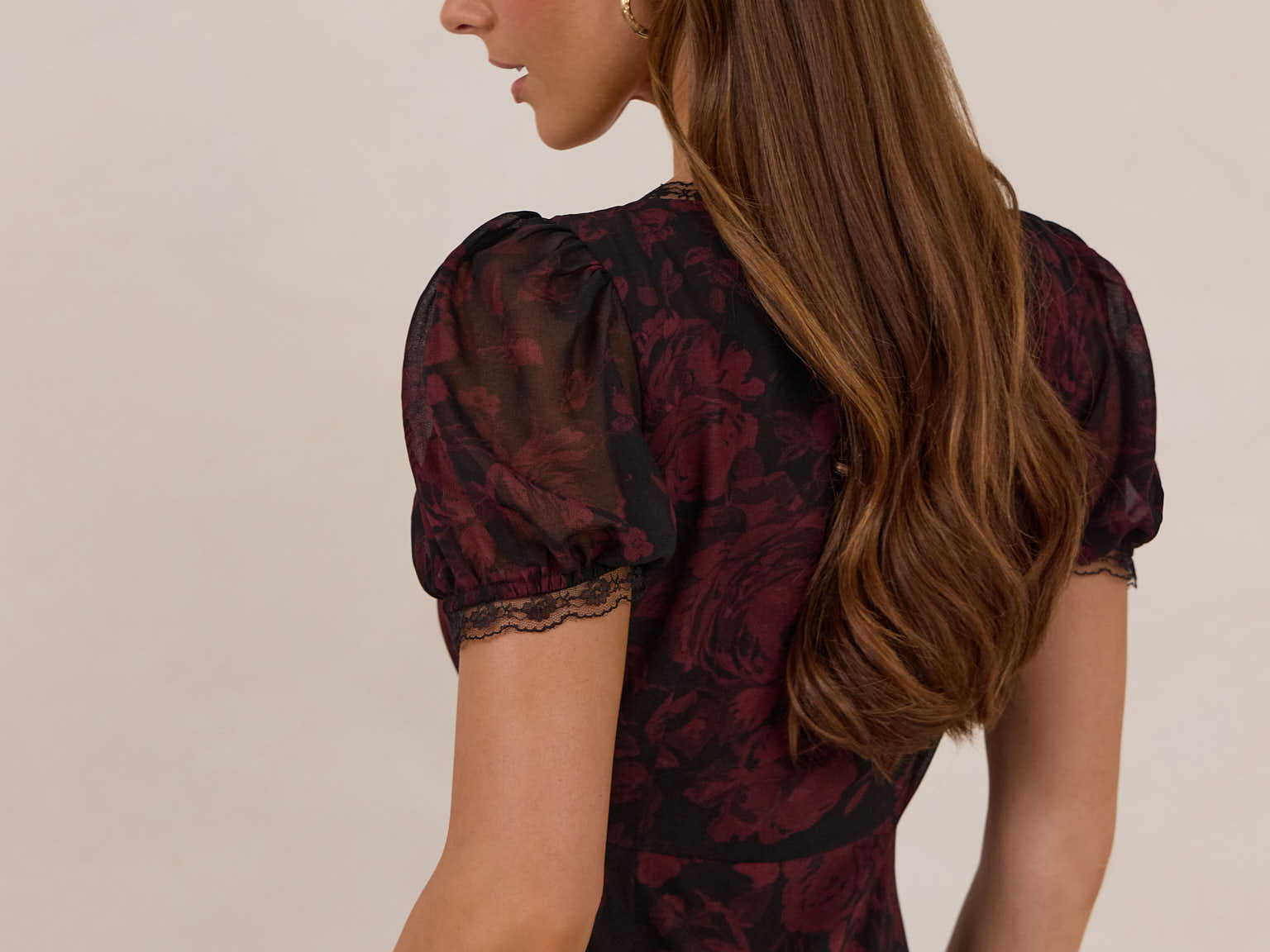 The perfect combination of sexy and cute. Made with chiffon, and a delicate lace lined detail around the neckline and sleeves, The Bowery masters the transition from day to night in this effortless floral dress.
