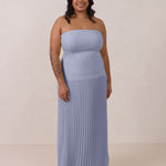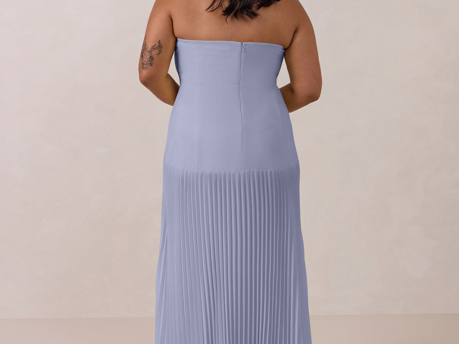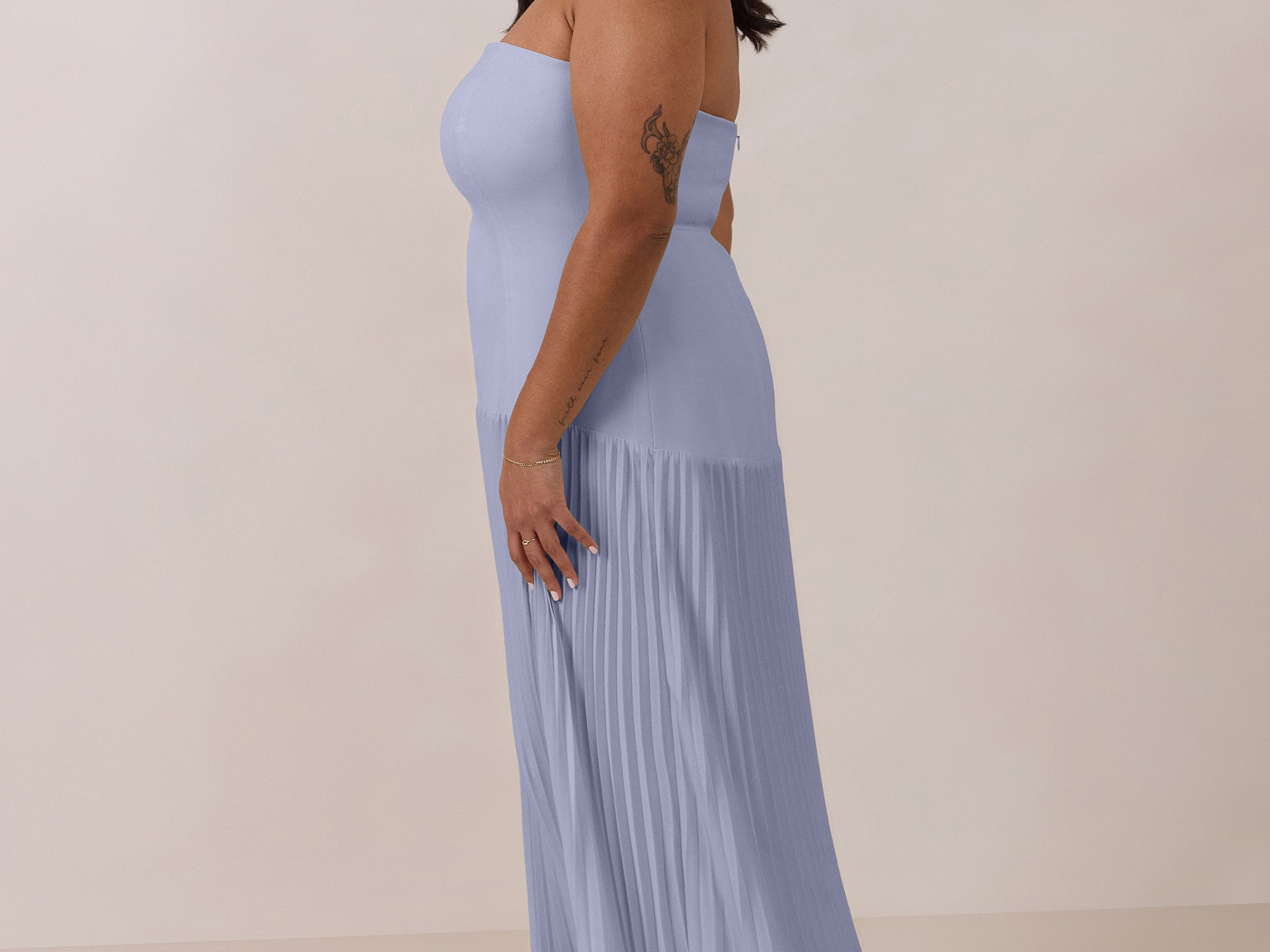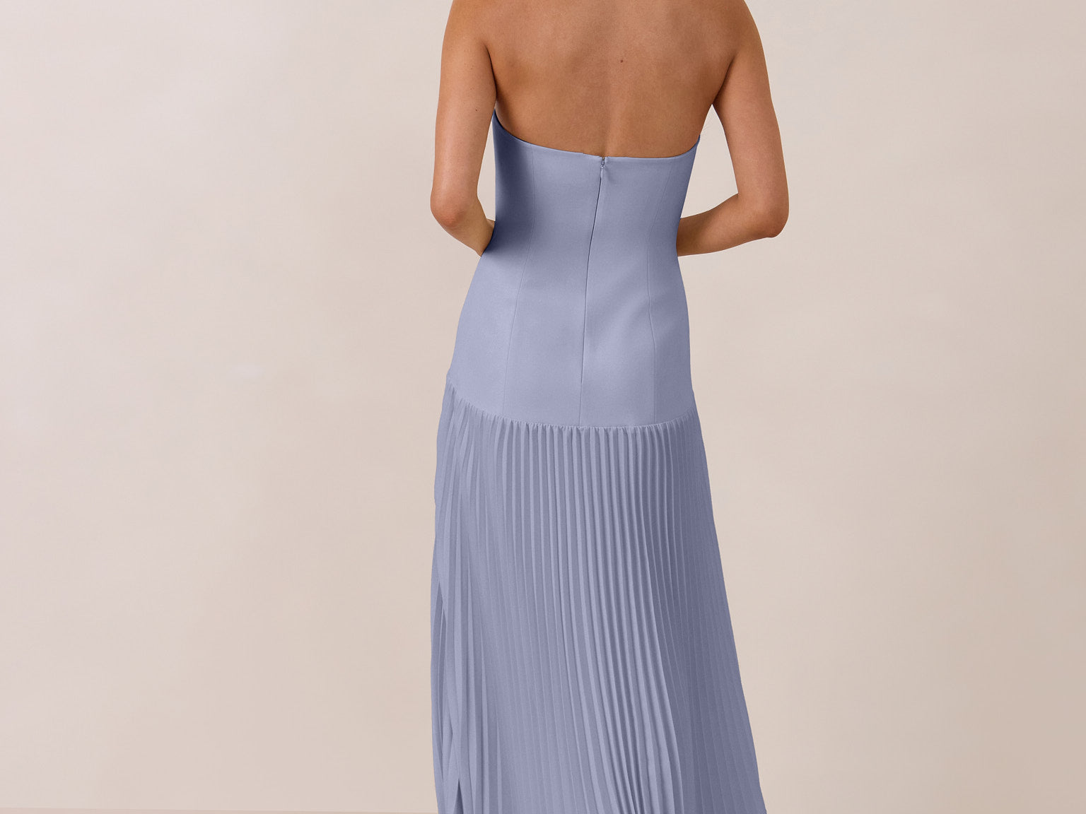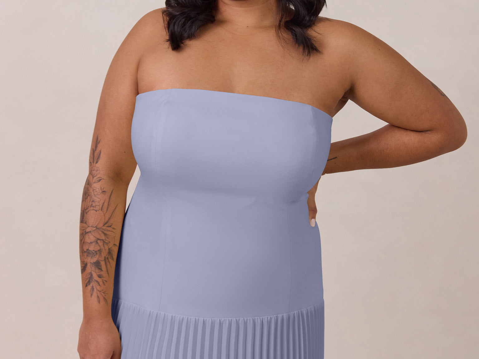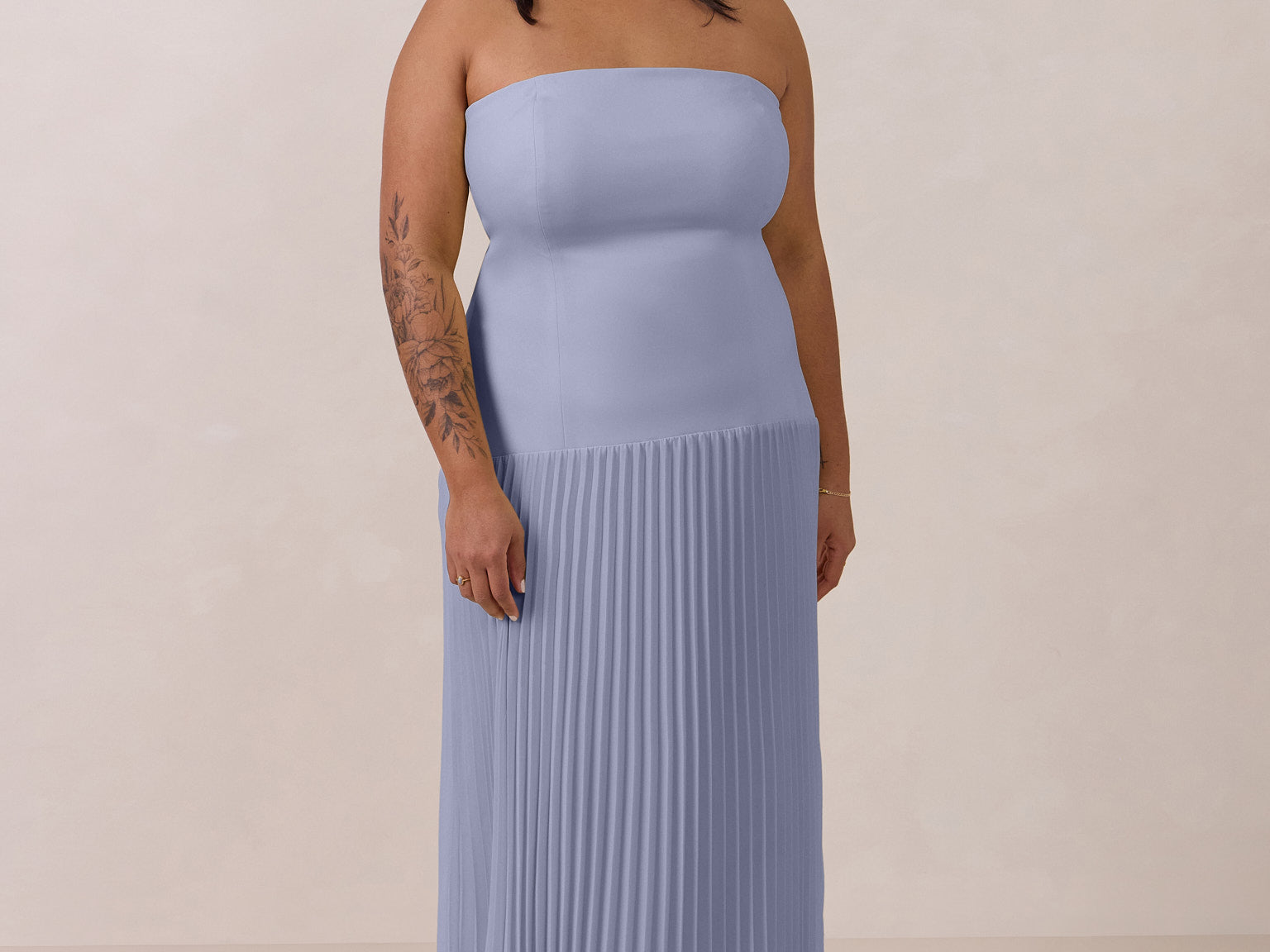 This dress captivates with its sleek stretch-crepe bodice and dreamy pleated skirt. The stretch crepe molds gently to your shape for a comfortable, supportive and flattering fit, while the lightweight skirt offers easy, effortless movement.