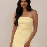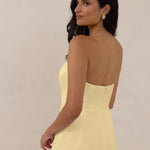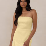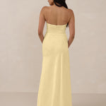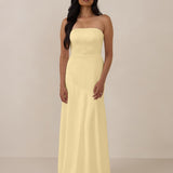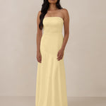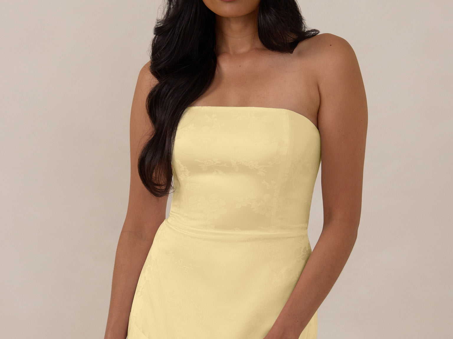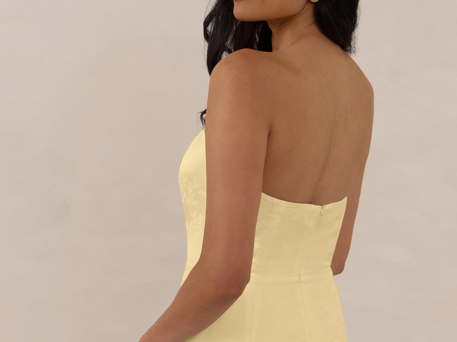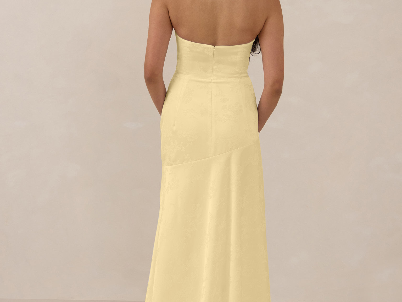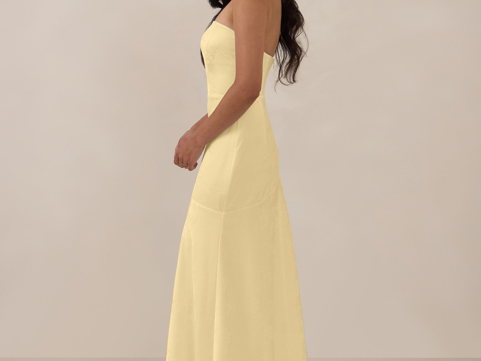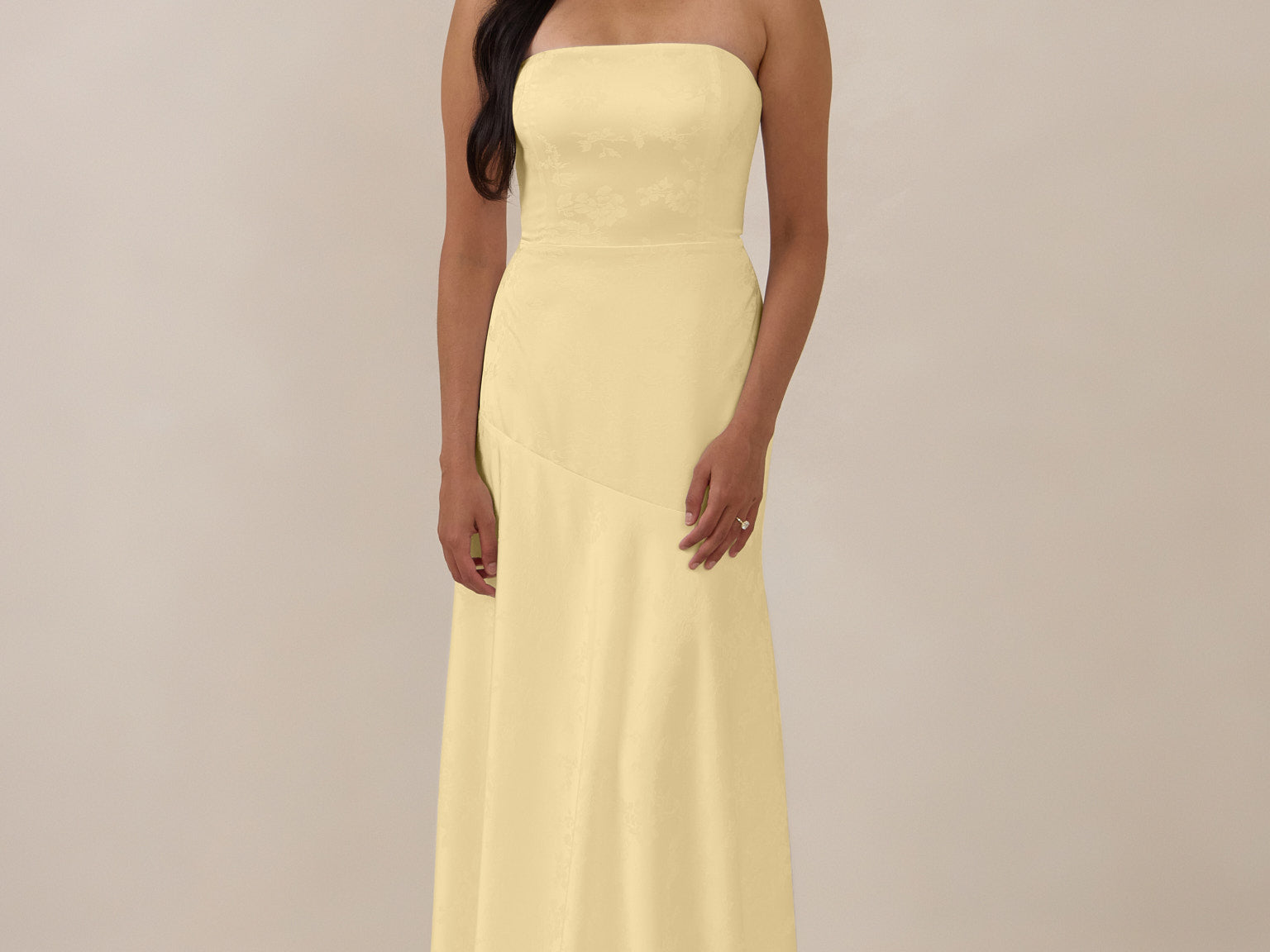The Delaney is a full-length, strapless silhouette crafted from luxurious Jacquard satin. Clean lines and a smooth, sculpted bodice create a timeless look, while the sleek finish makes it an elevated choice for any bridal party.