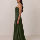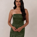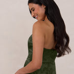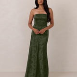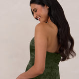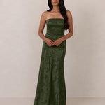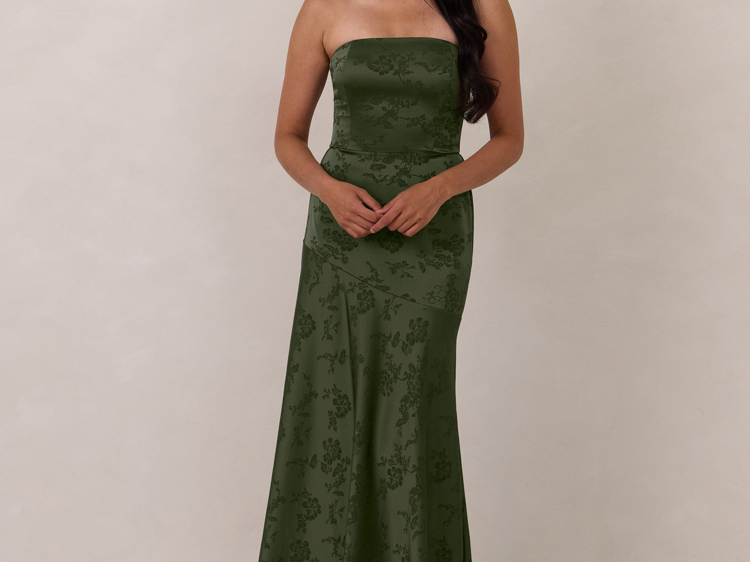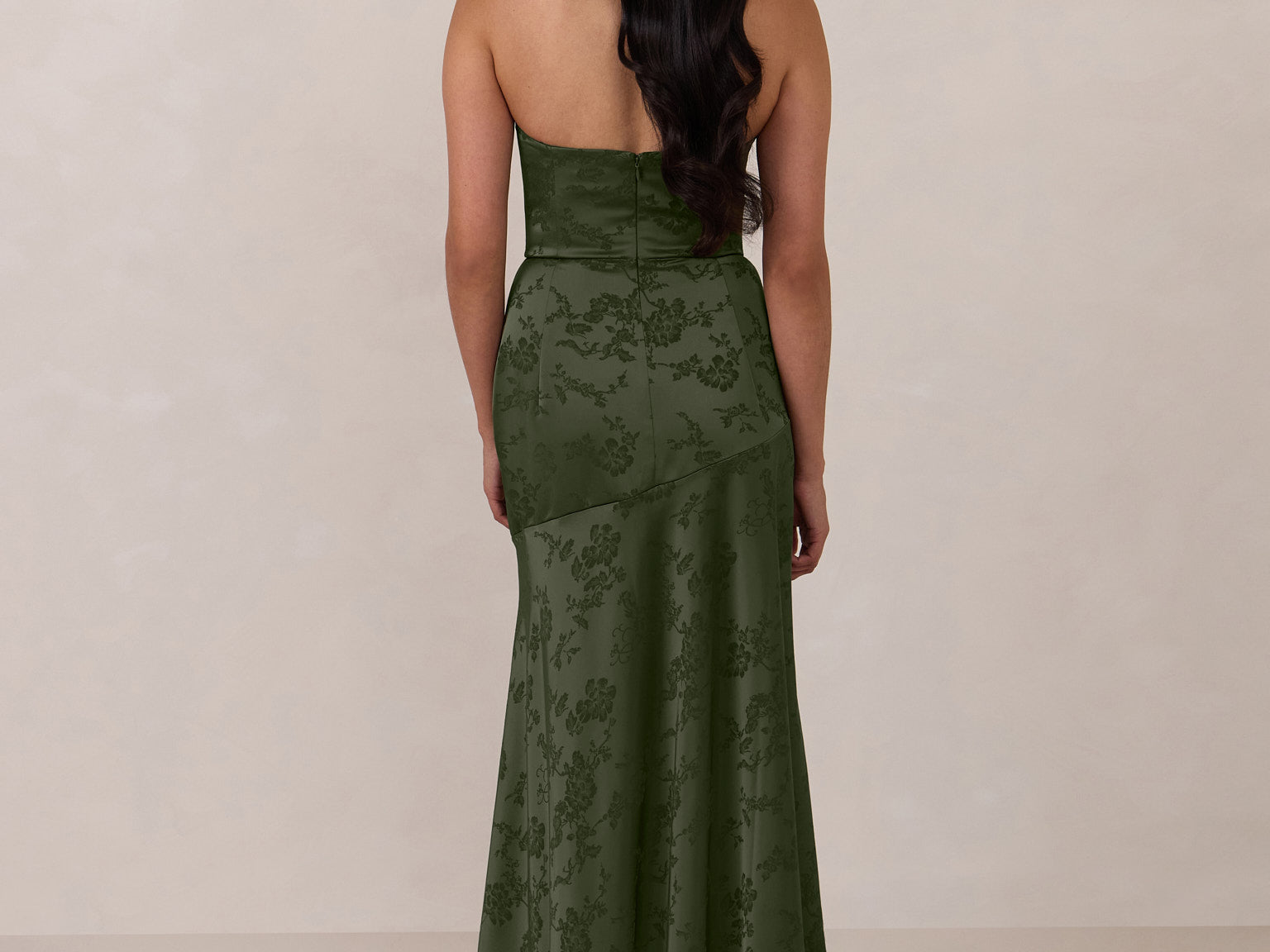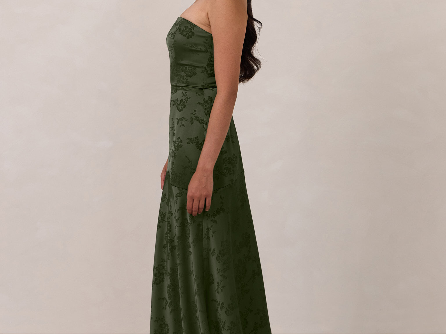 The Delaney is a full-length, strapless silhouette crafted from luxurious Jacquard satin. Clean lines and a smooth, sculpted bodice create a timeless look, while the sleek finish makes it an elevated choice for any bridal party.