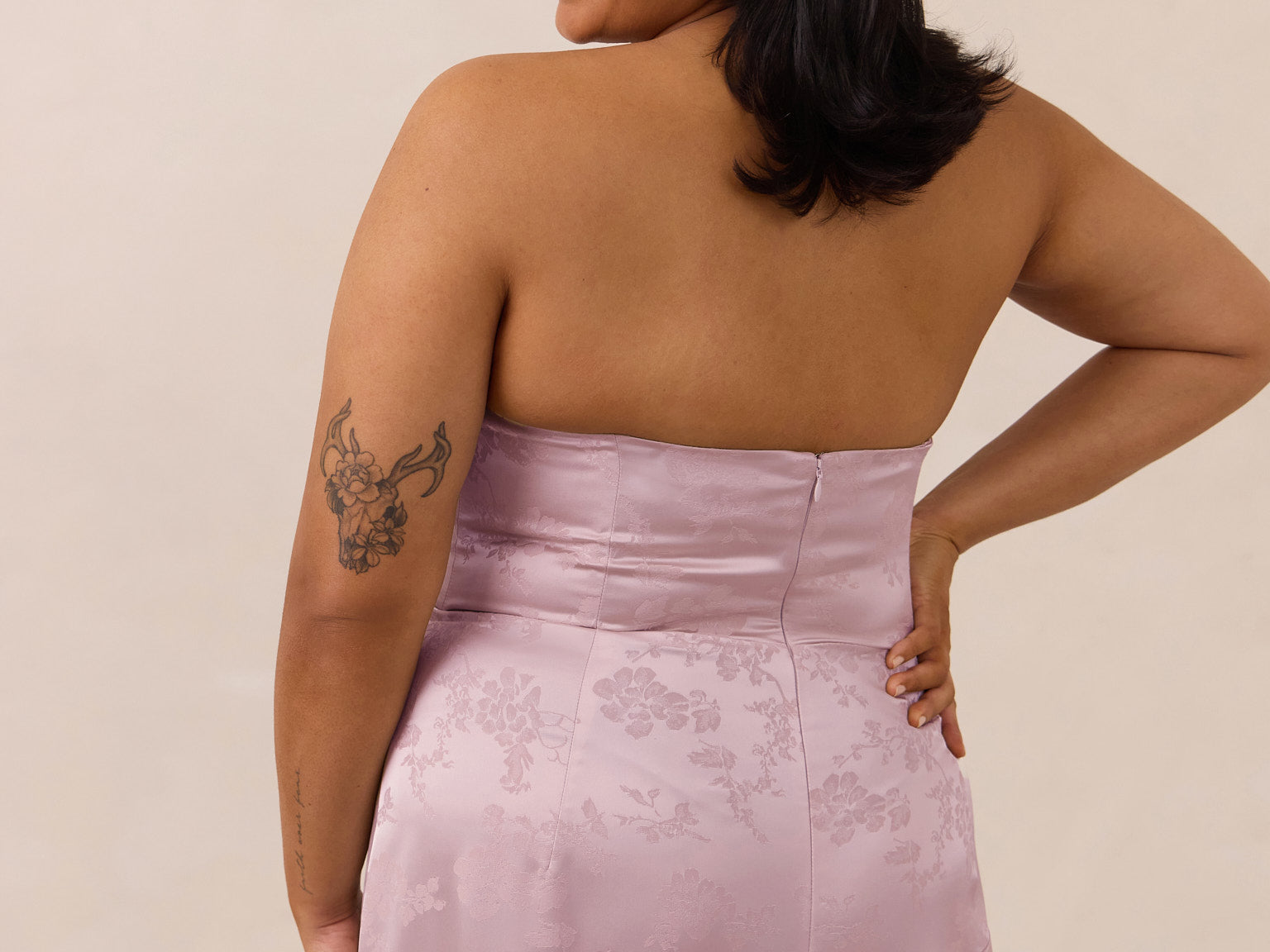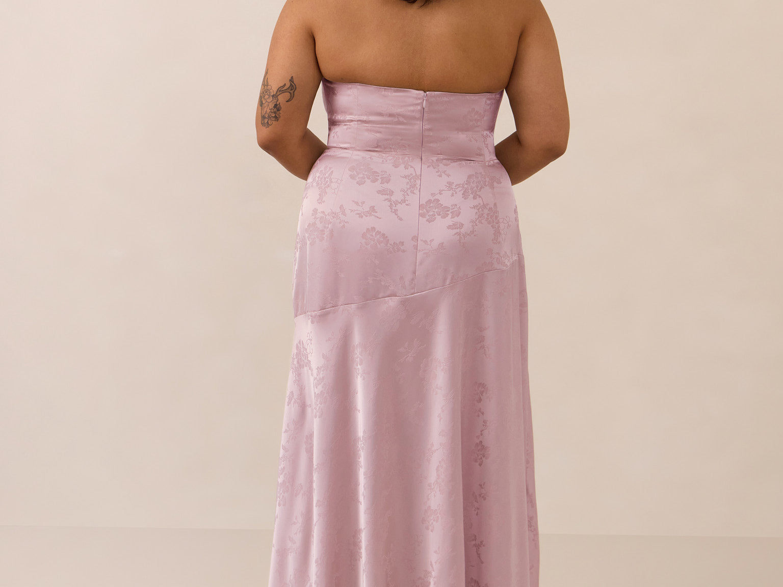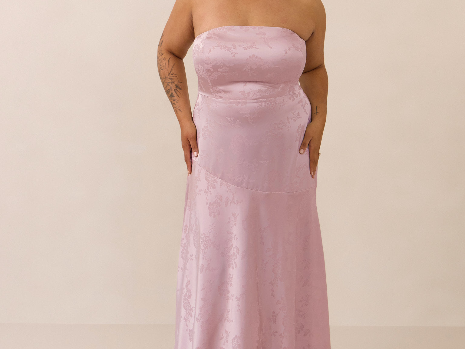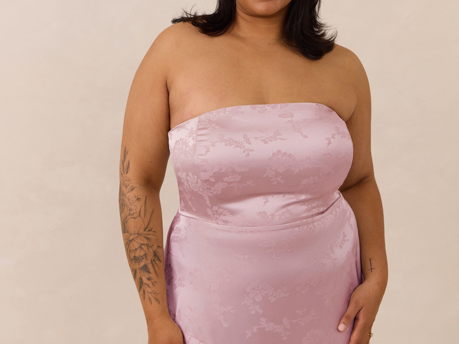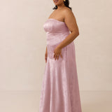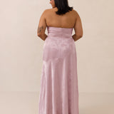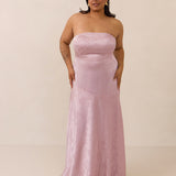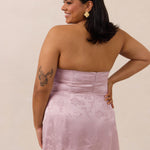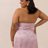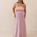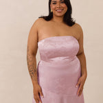 The Delaney is a full-length, strapless silhouette crafted from luxurious Jacquard satin. Clean lines and a smooth, sculpted bodice create a timeless look, while the sleek finish makes it an elevated choice for any bridal party.