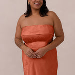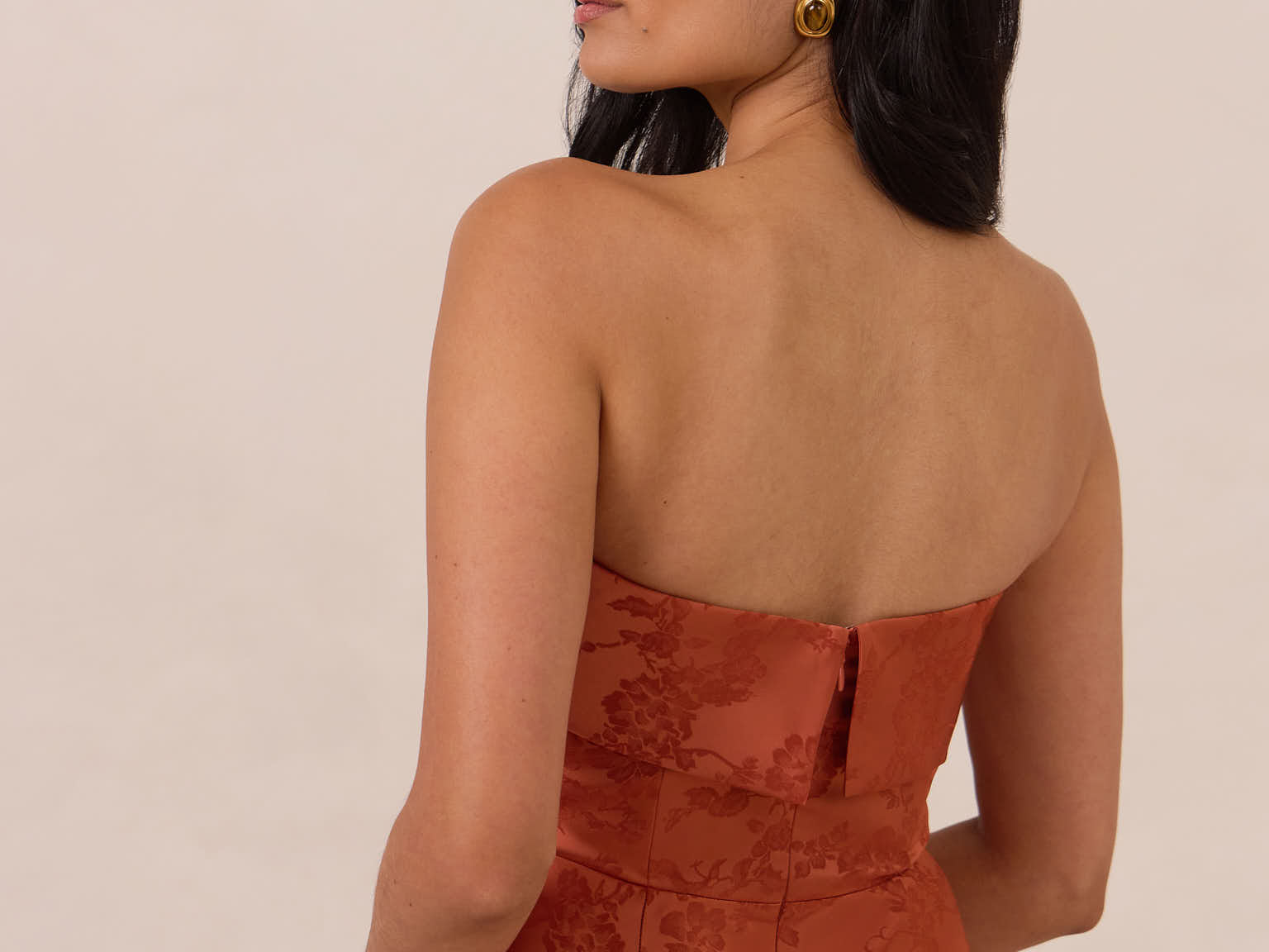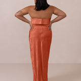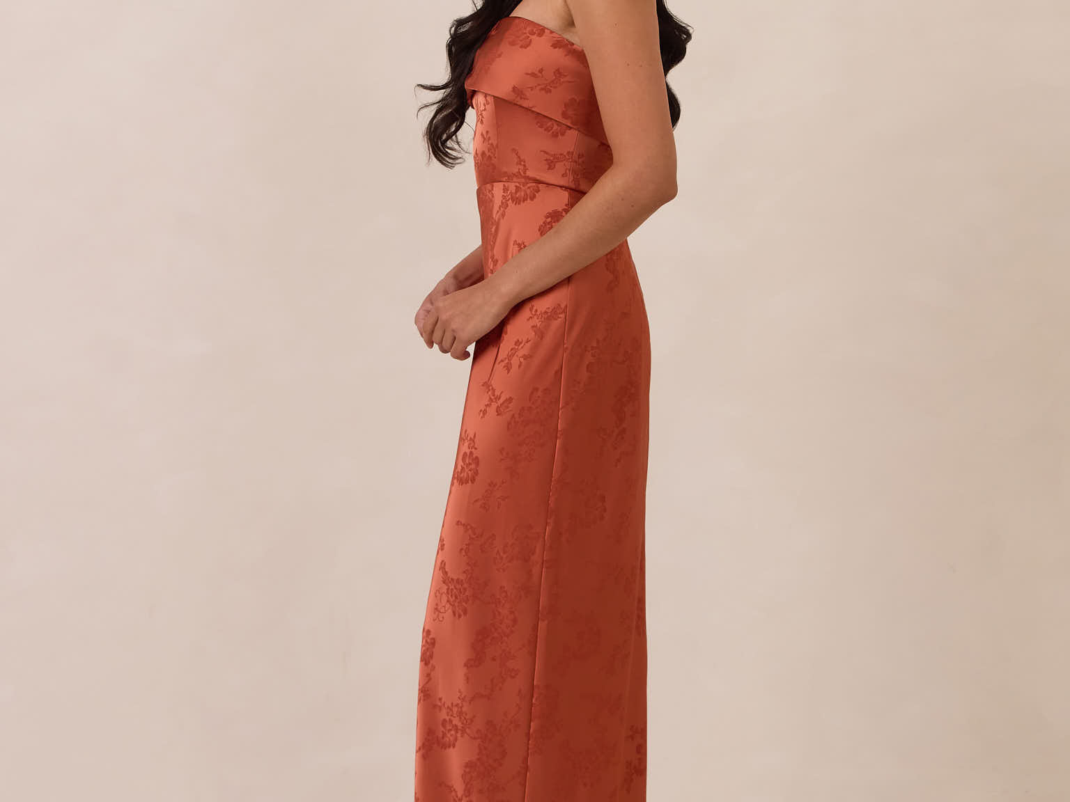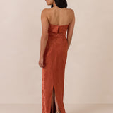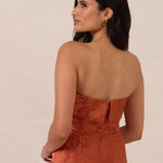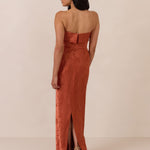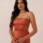 A timeless piece designed to captivate. Designed from luxe jacquard fabric with a subtle sheen and intricate texture, this dress exudes understated glamour. The structured, folded strapless neckline adds a modern sculptural element, gracefully framing the shoulders.