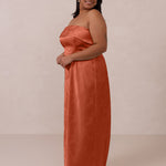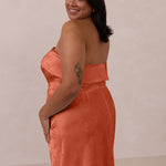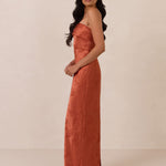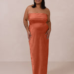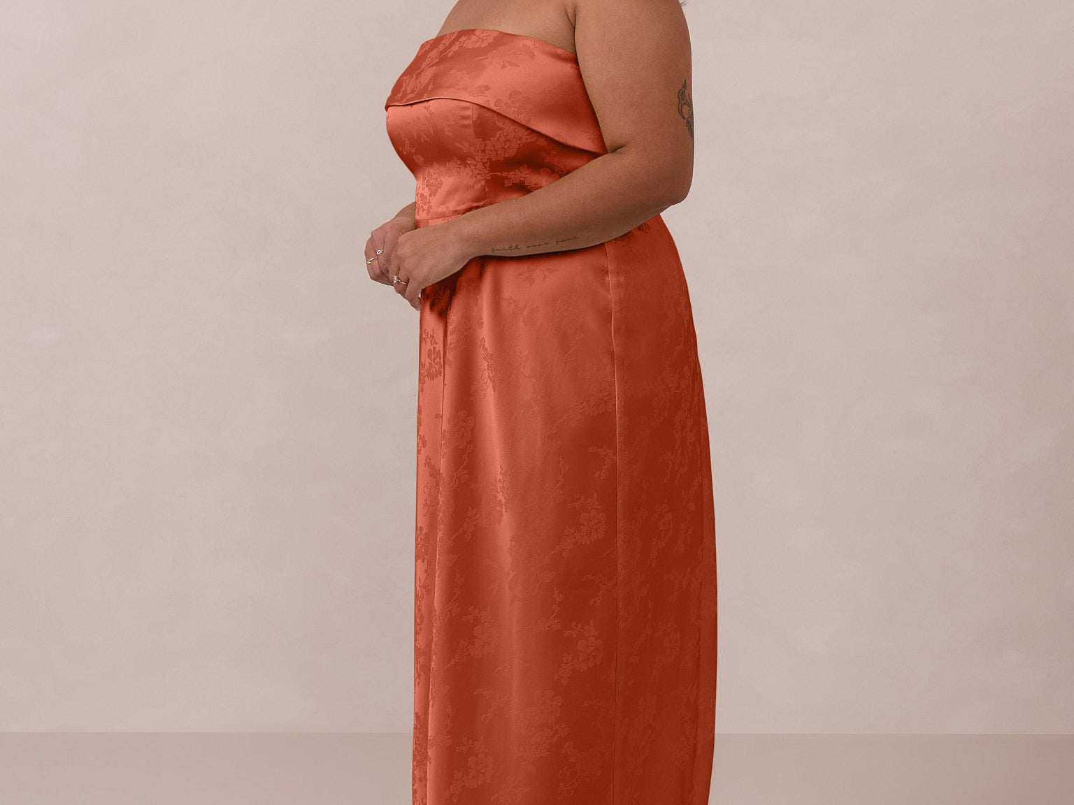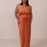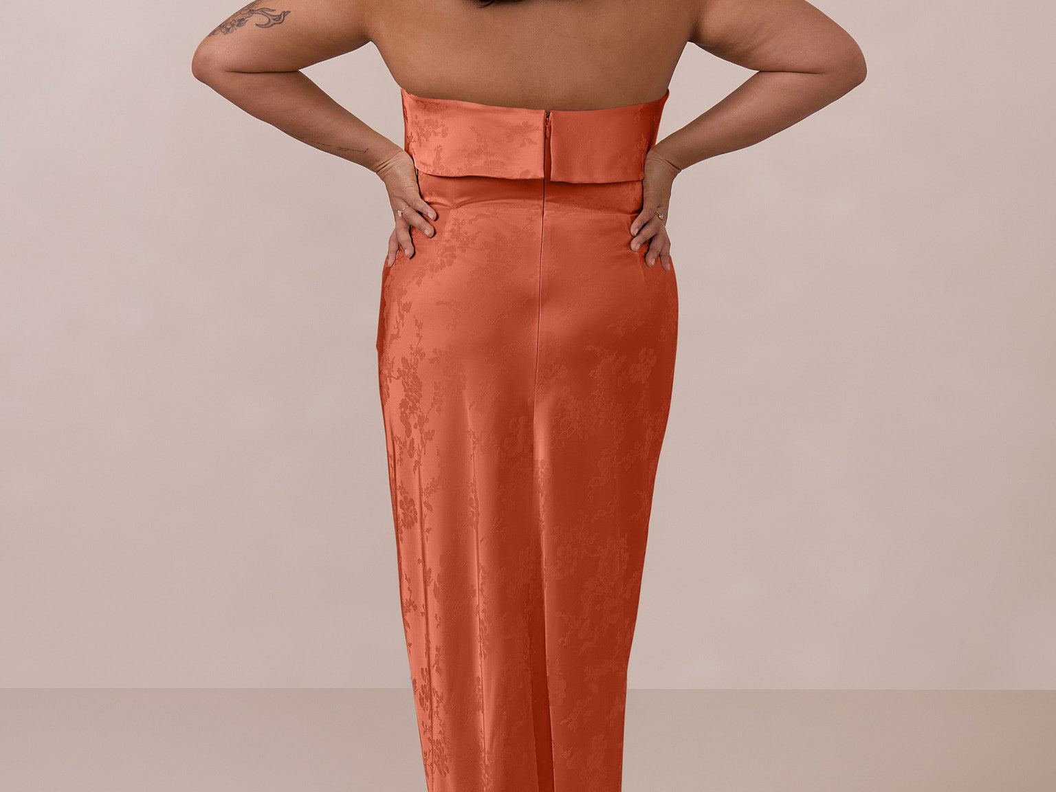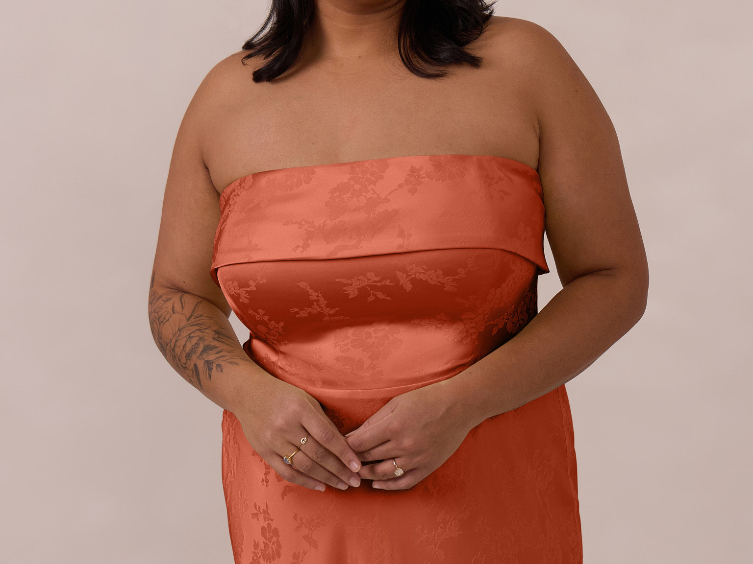 A timeless piece designed to captivate. Designed from luxe jacquard fabric with a subtle sheen and intricate texture, this dress exudes understated glamour. The structured, folded strapless neckline adds a modern sculptural element, gracefully framing the shoulders.