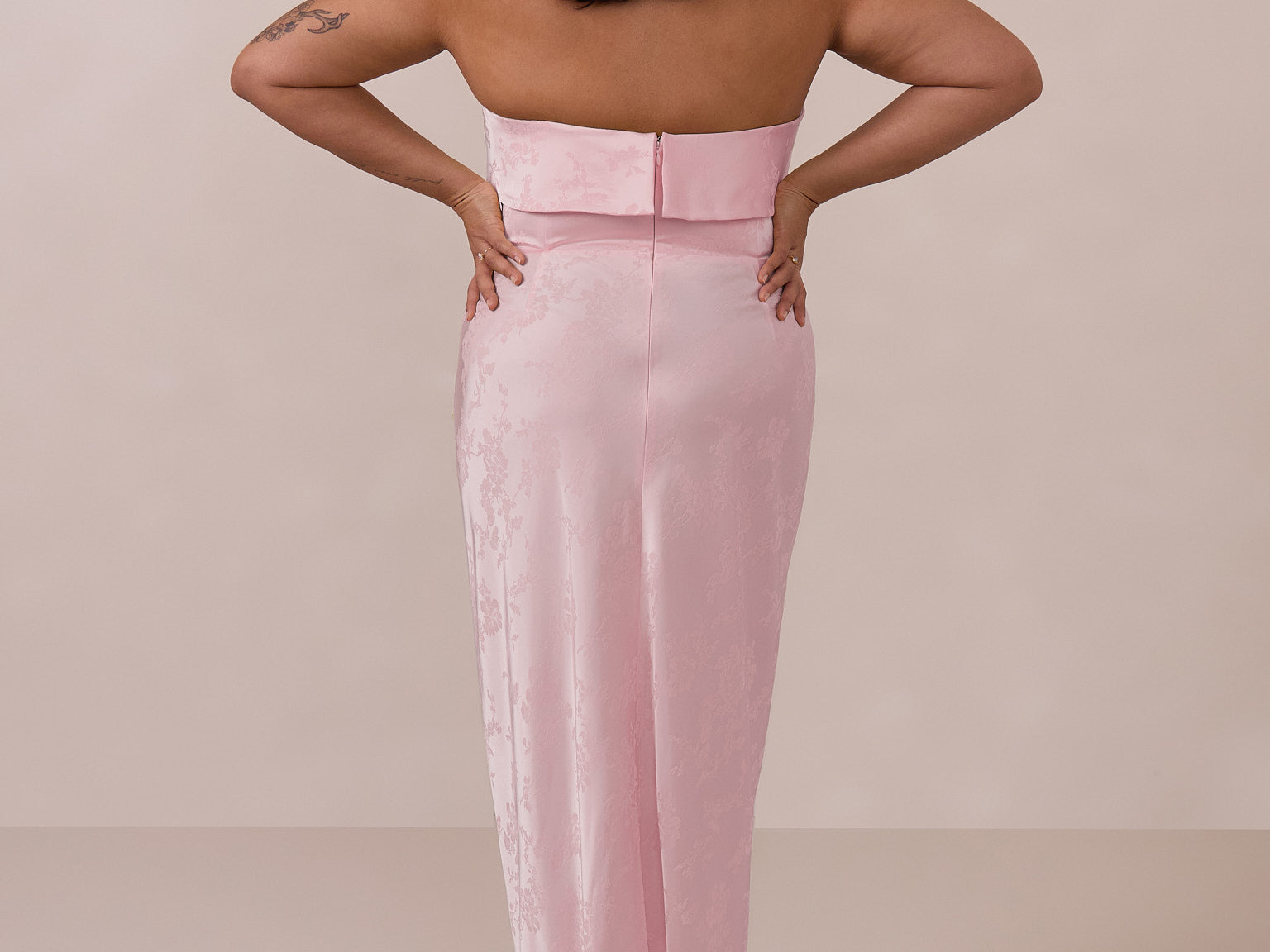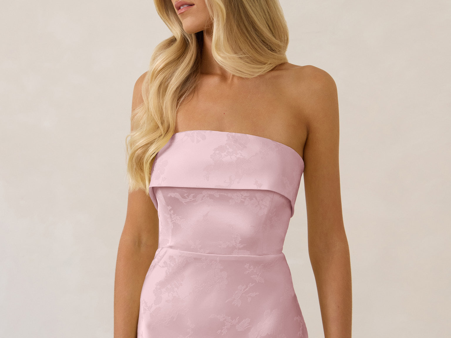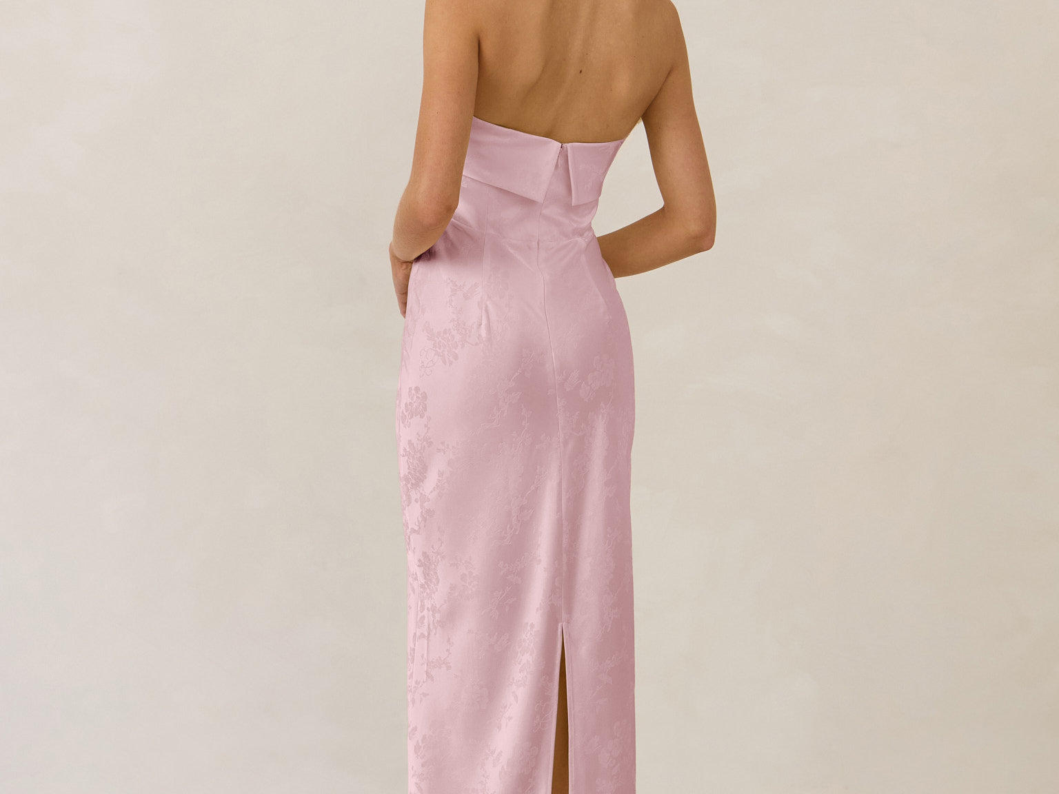 A timeless piece designed to captivate. Designed from luxe jacquard fabric with a subtle sheen and intricate texture, this dress exudes understated glamour. The structured, folded strapless neckline adds a modern sculptural element, gracefully framing the shoulders.