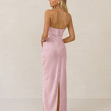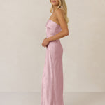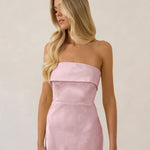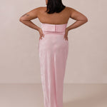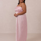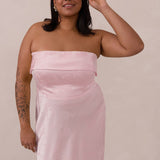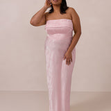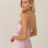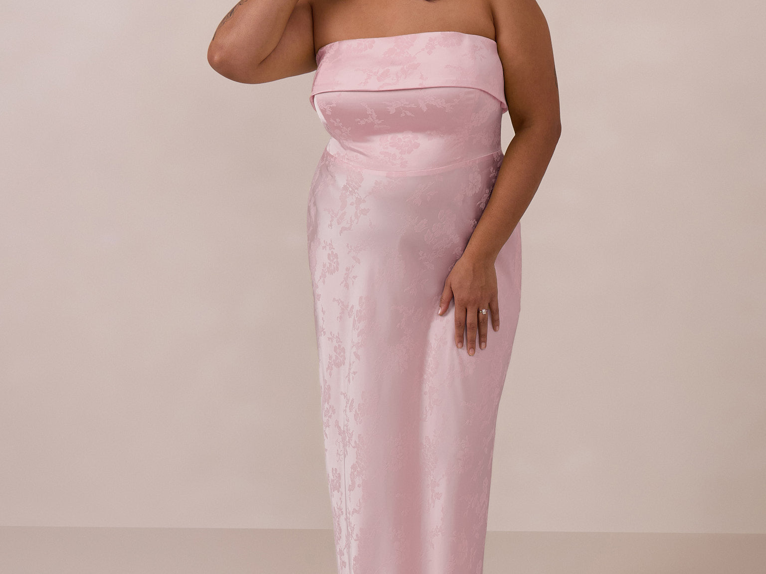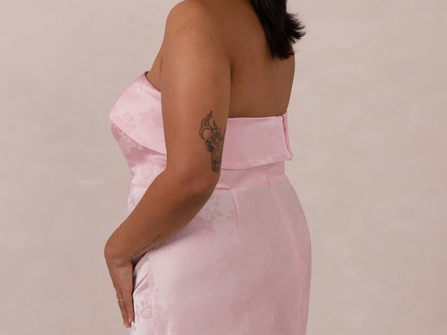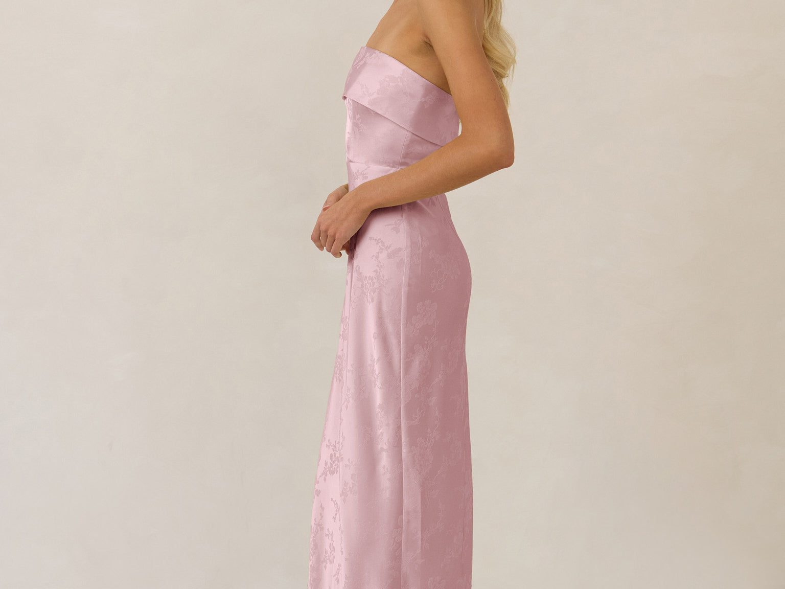 A timeless piece designed to captivate. Designed from luxe jacquard fabric with a subtle sheen and intricate texture, this dress exudes understated glamour. The structured, folded strapless neckline adds a modern sculptural element, gracefully framing the shoulders.
