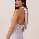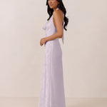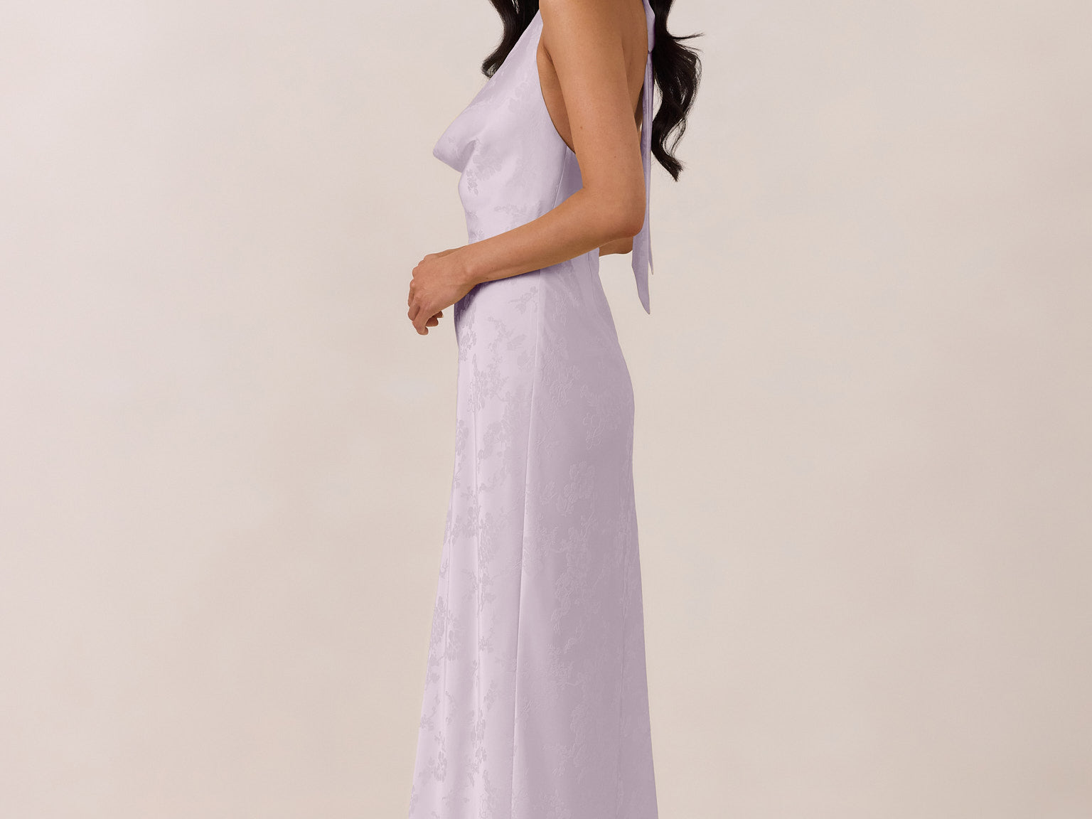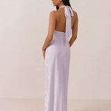 Effortlessly elegant, this bias-cut satin maxi dress features a fluid skirt with a curved thigh-high slit and a draped cowl neckline. A delicate halter back completes the look. Perfect for any occasion, it's glossy and flattering.
