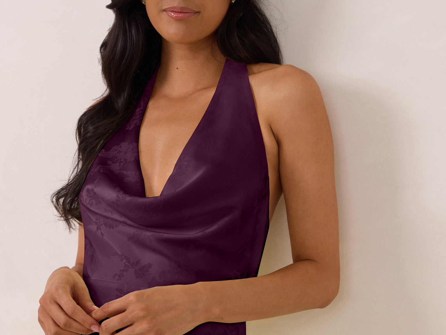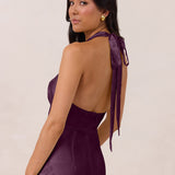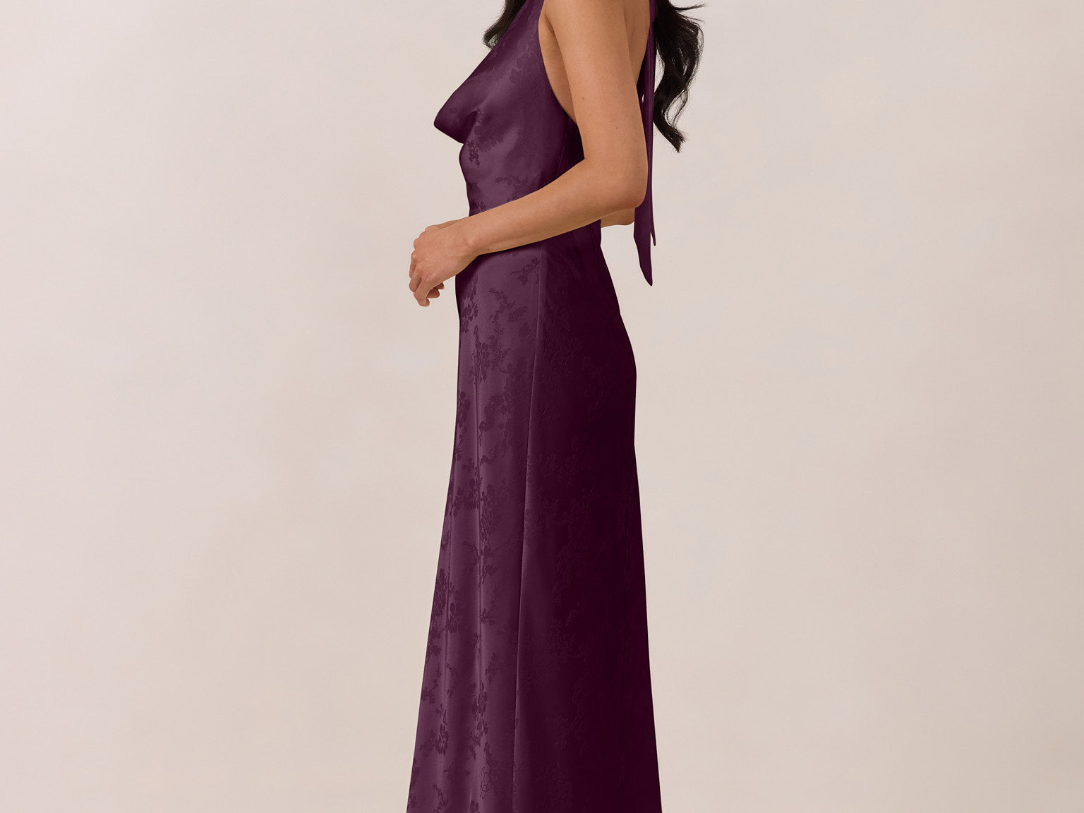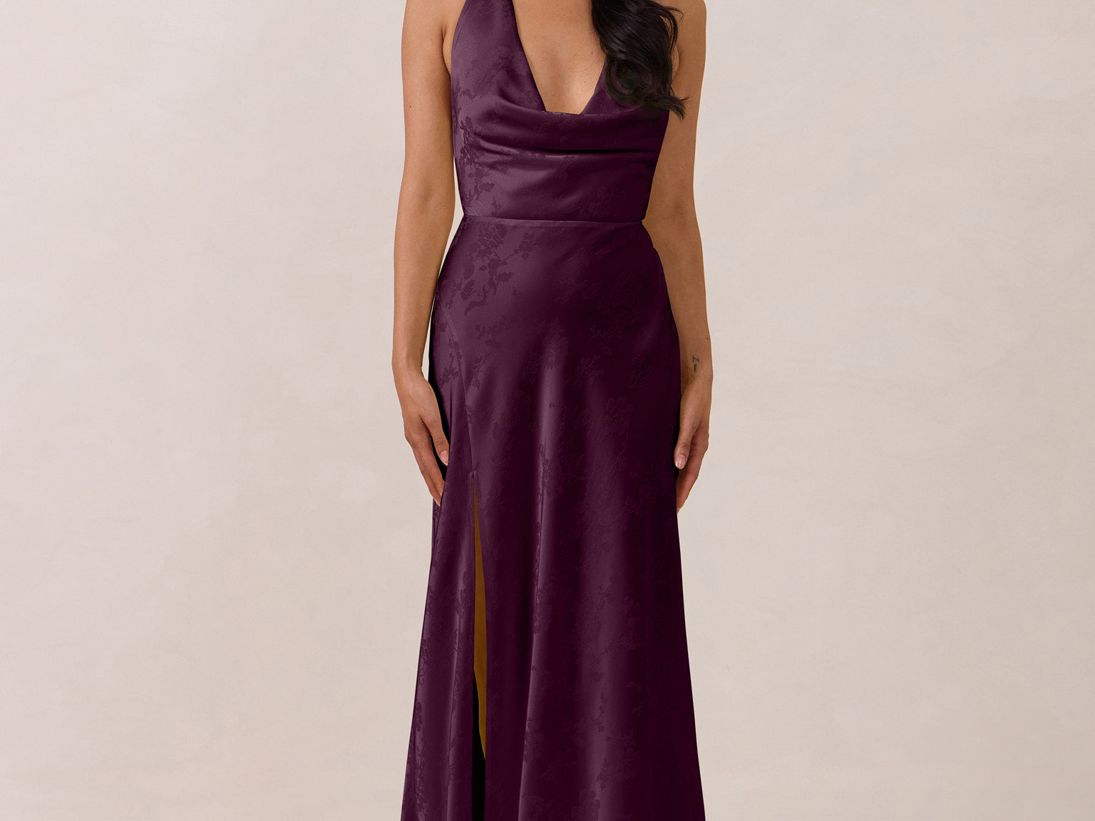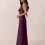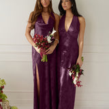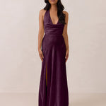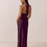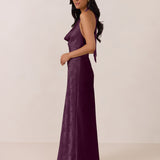 Effortlessly elegant, this bias-cut satin maxi dress features a fluid skirt with a curved thigh-high slit and a draped cowl neckline. A delicate halter back completes the look. Perfect for any occasion, it's glossy and flattering.