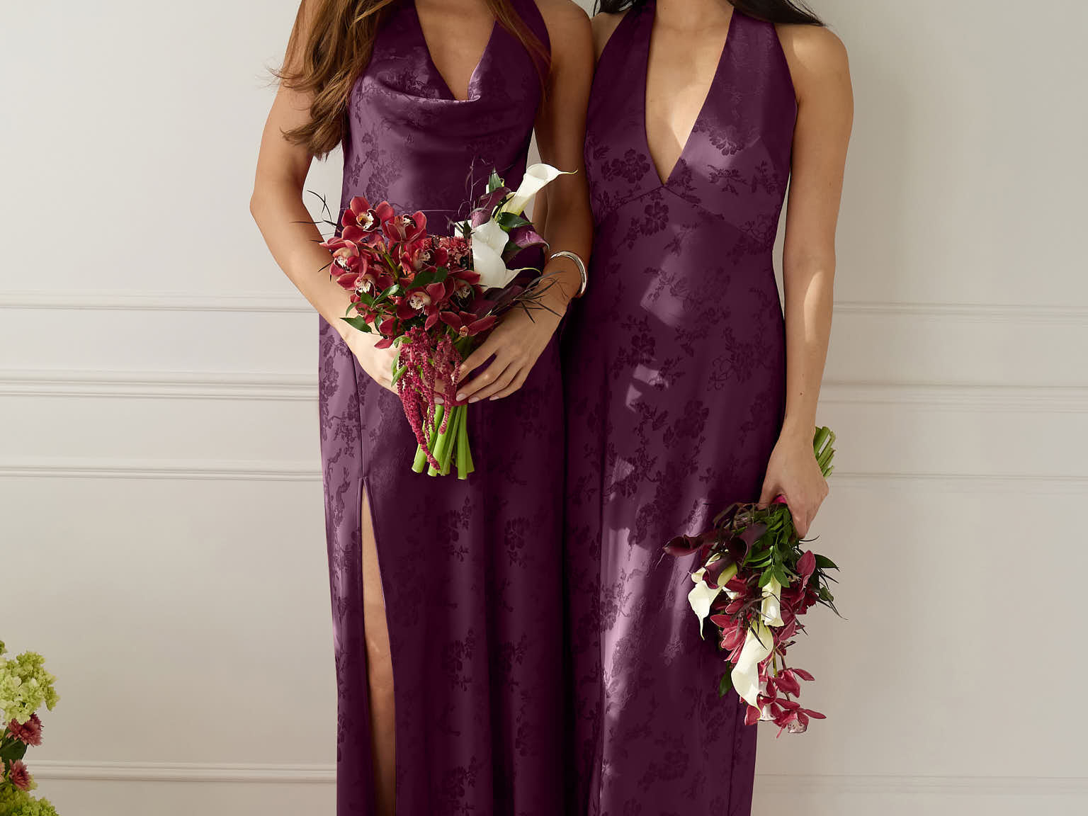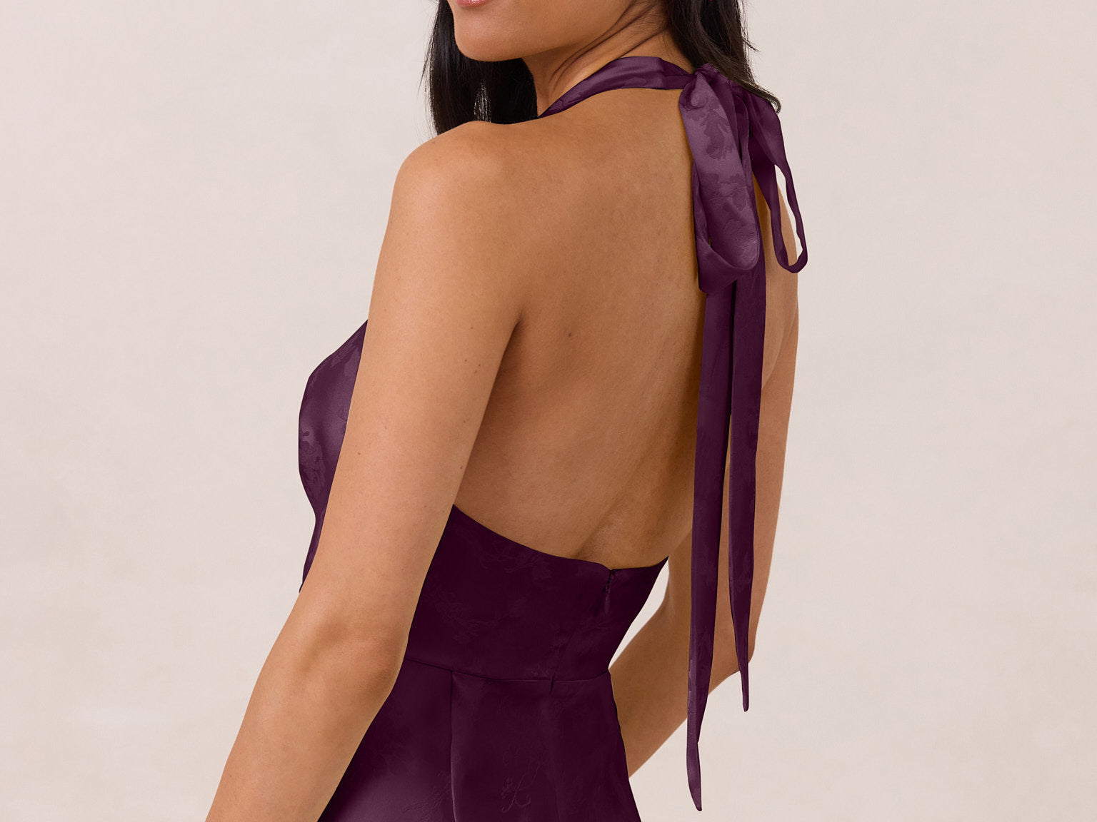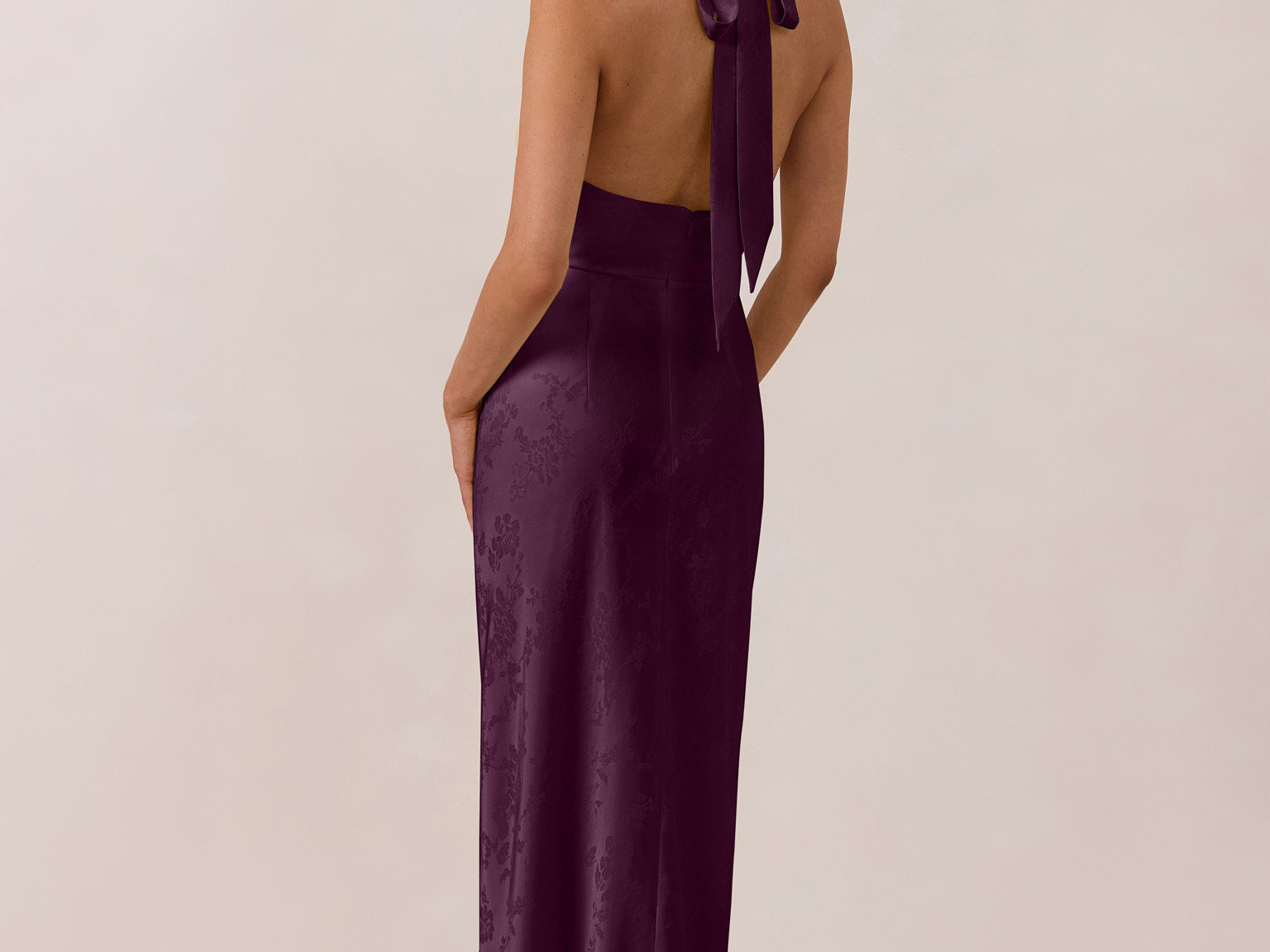 Effortlessly elegant, this bias-cut satin maxi dress features a fluid skirt with a curved thigh-high slit and a draped cowl neckline. A delicate halter back completes the look. Perfect for any occasion, it's glossy and flattering.