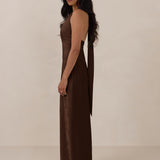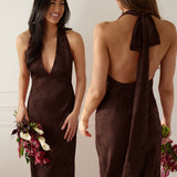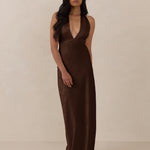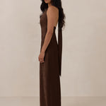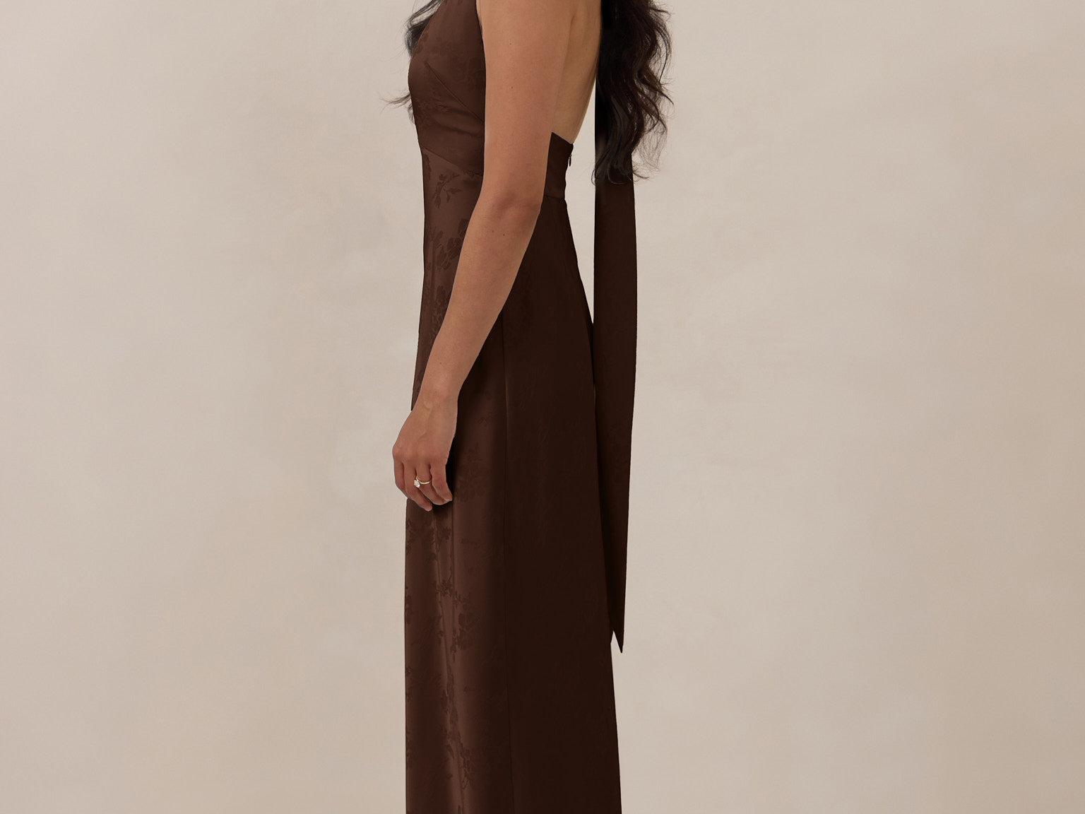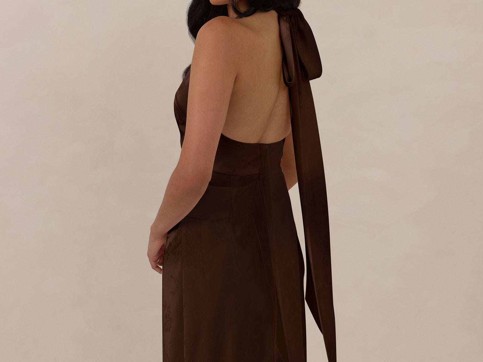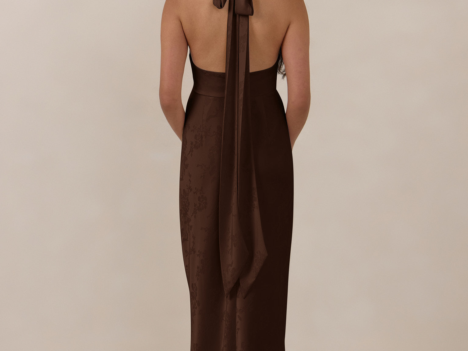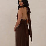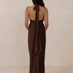 A sleek and versatile silhouette crafted in luxurious Jacquard for a touch of texture and sophistication. Designed for effortless elegance, it features a halter neckline with a dramatic open back and long ties that can be styled as a scarf or knotted for a custom halter look. The bias-cut skirt flows beautifully into a flattering maxi length, creating graceful movement with every step.