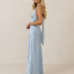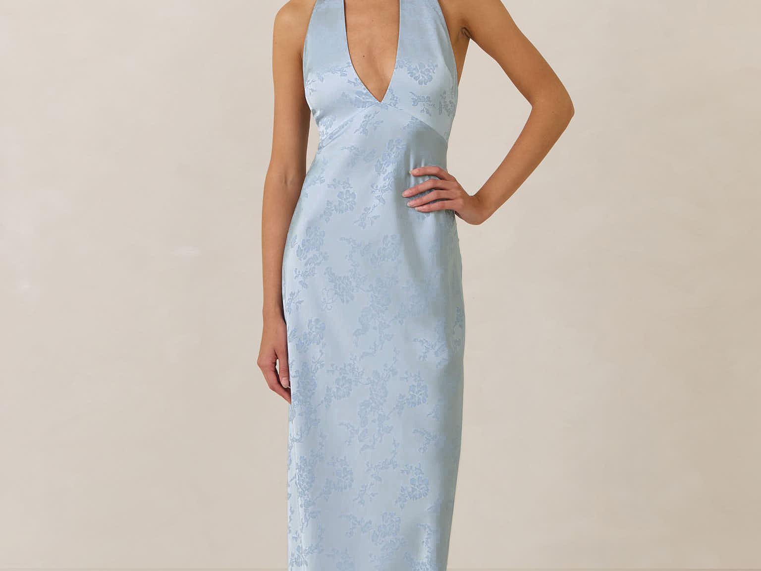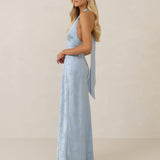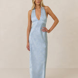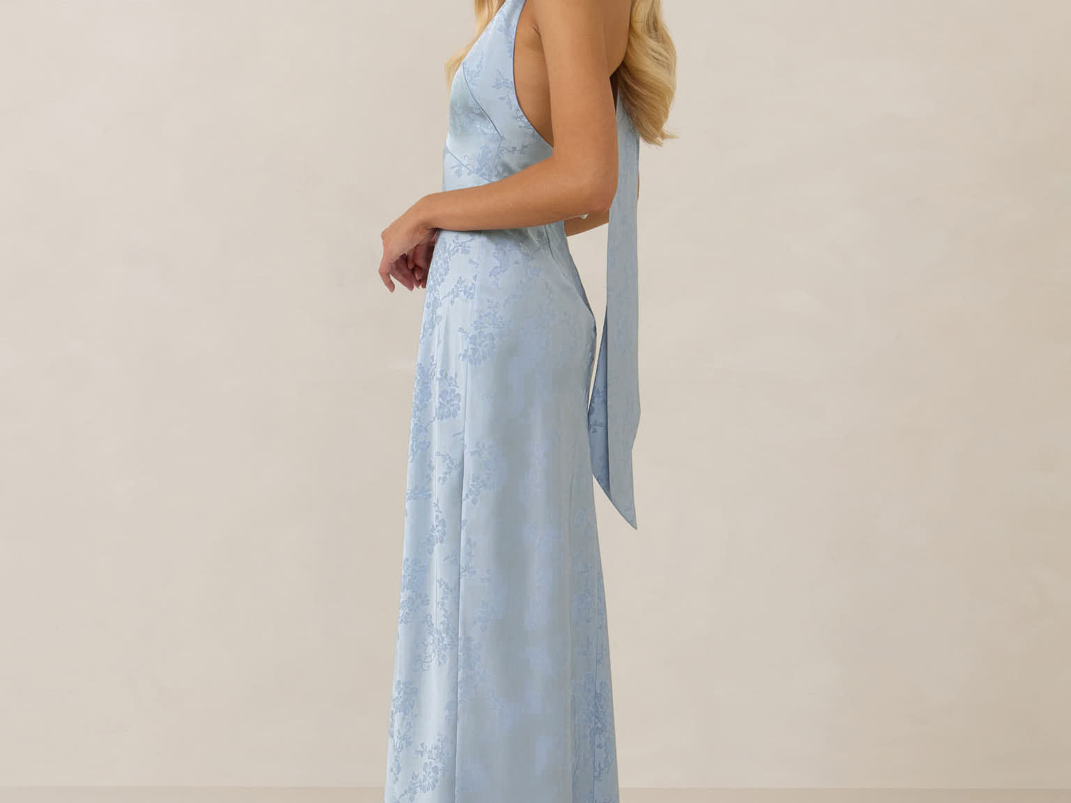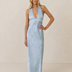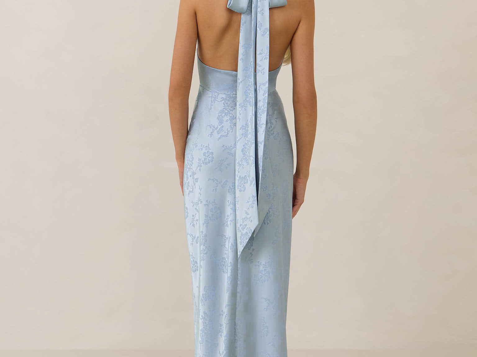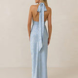 A sleek and versatile silhouette crafted in luxurious Jacquard for a touch of texture and sophistication. Designed for effortless elegance, it features a halter neckline with a dramatic open back and long ties that can be styled as a scarf or knotted for a custom halter look. The bias-cut skirt flows beautifully into a flattering maxi length, creating graceful movement with every step.