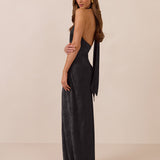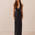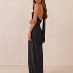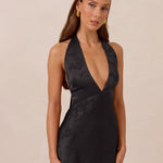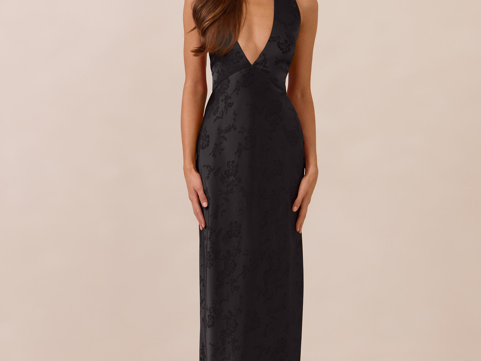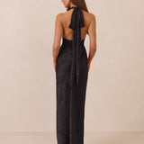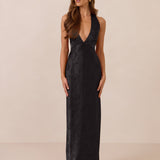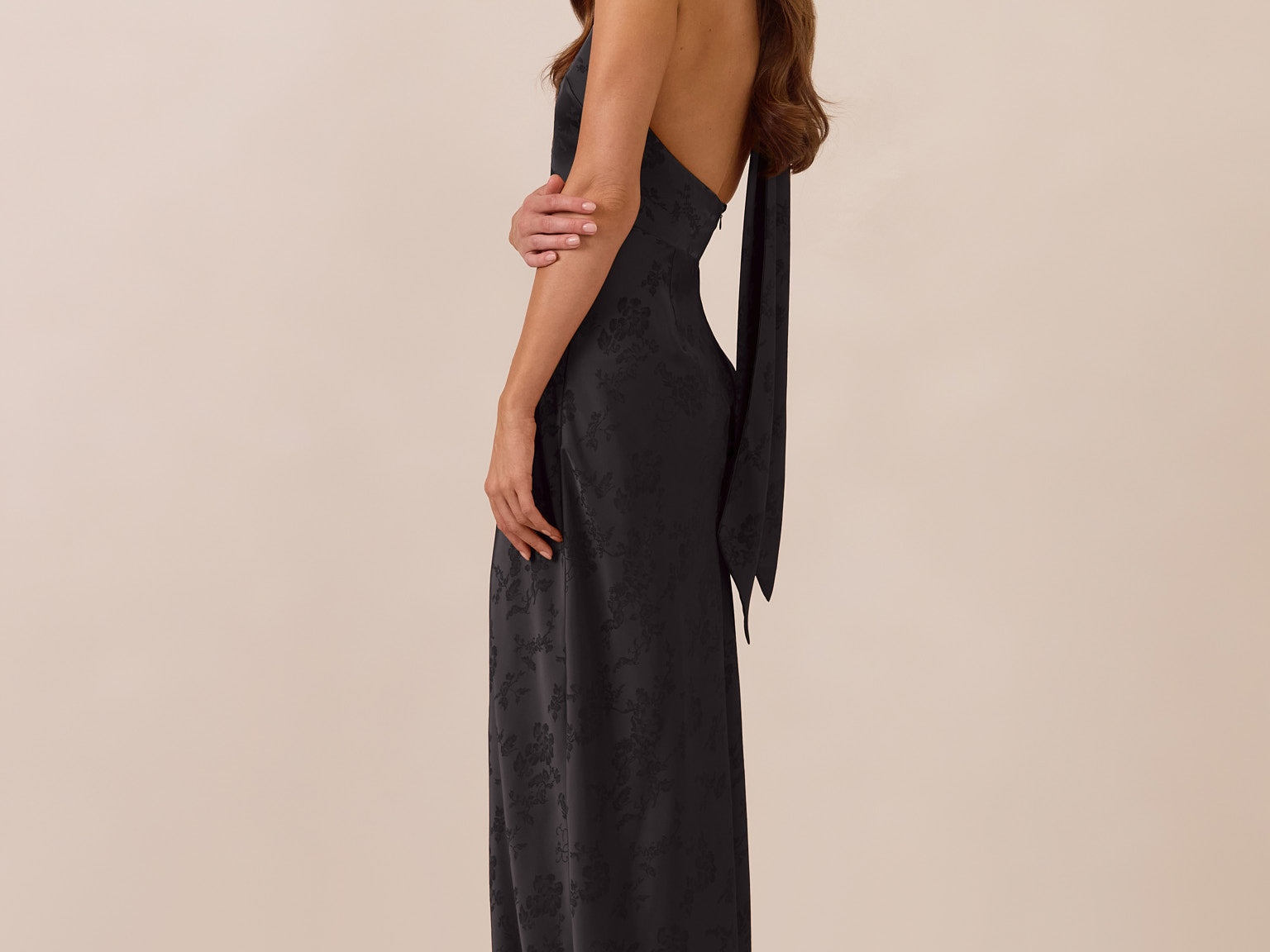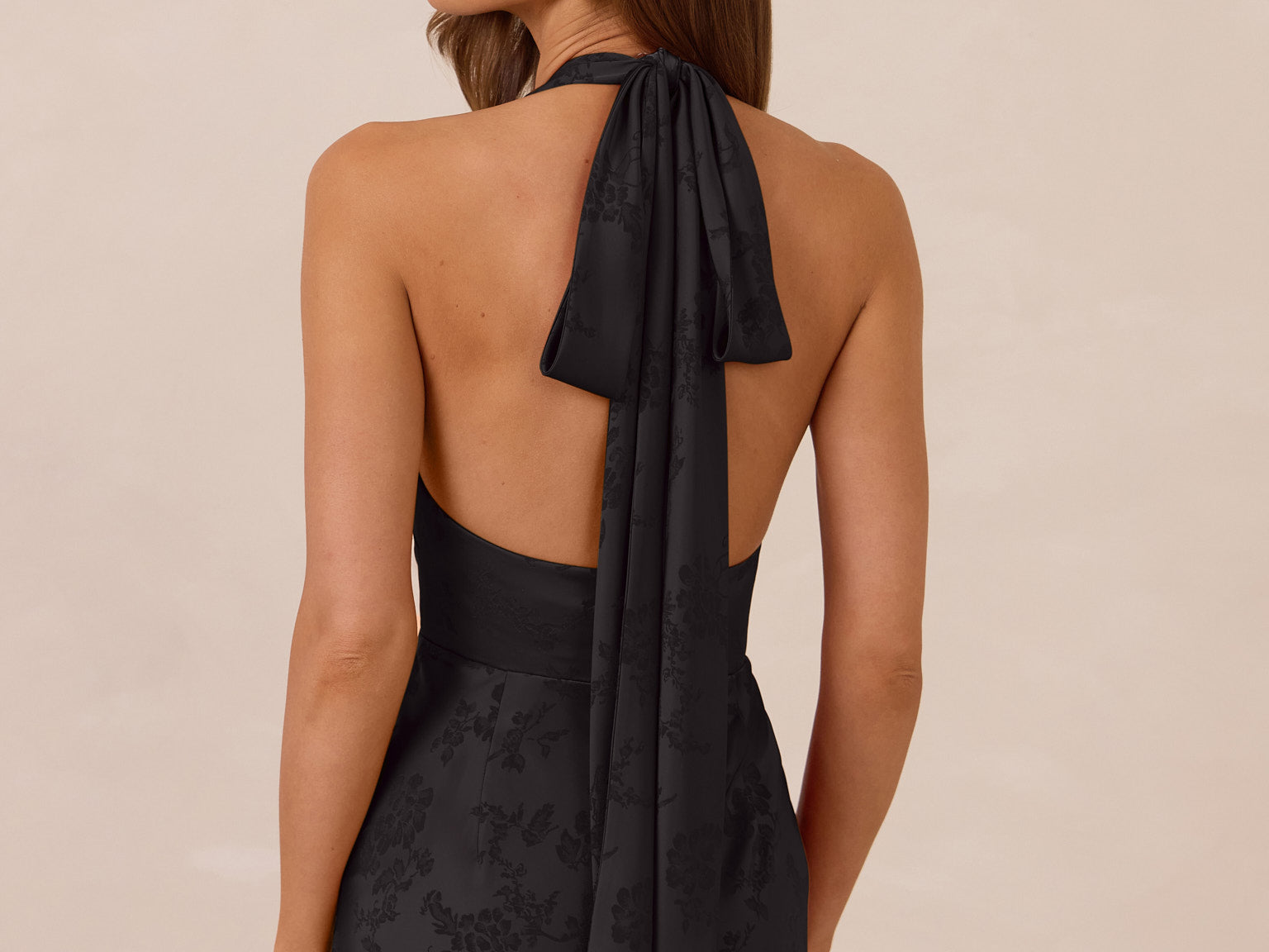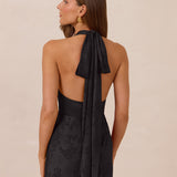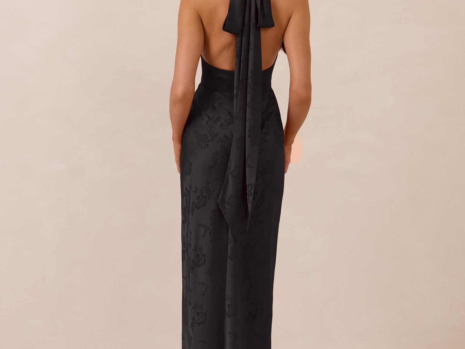 A sleek and versatile silhouette crafted in luxurious Jacquard for a touch of texture and sophistication. Designed for effortless elegance, it features a halter neckline with a dramatic open back and long ties that can be styled as a scarf or knotted for a custom halter look. The bias-cut skirt flows beautifully into a flattering maxi length, creating graceful movement with every step.