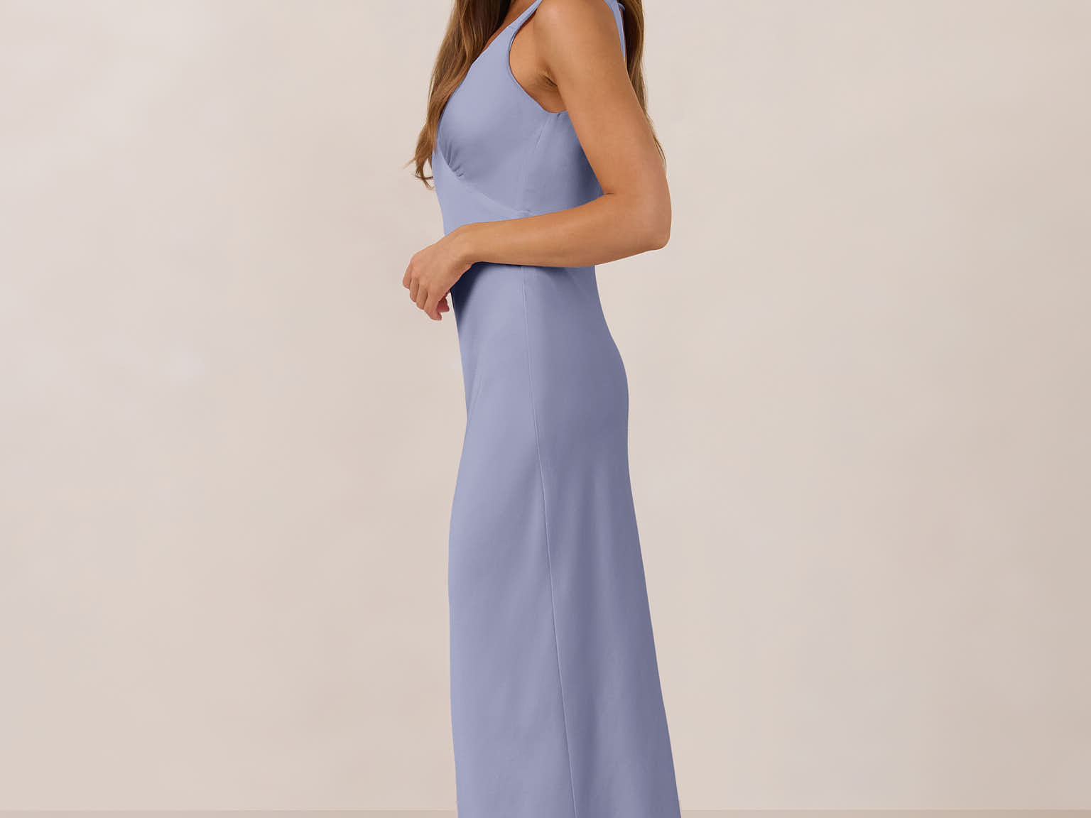 Featuring a flattering V-neckline, gathering at the bust, and an open back, this bias-cut dress offers a sleek, elongating silhouette. The clean lines and minimalist design make it the perfect choice for any special occasion.