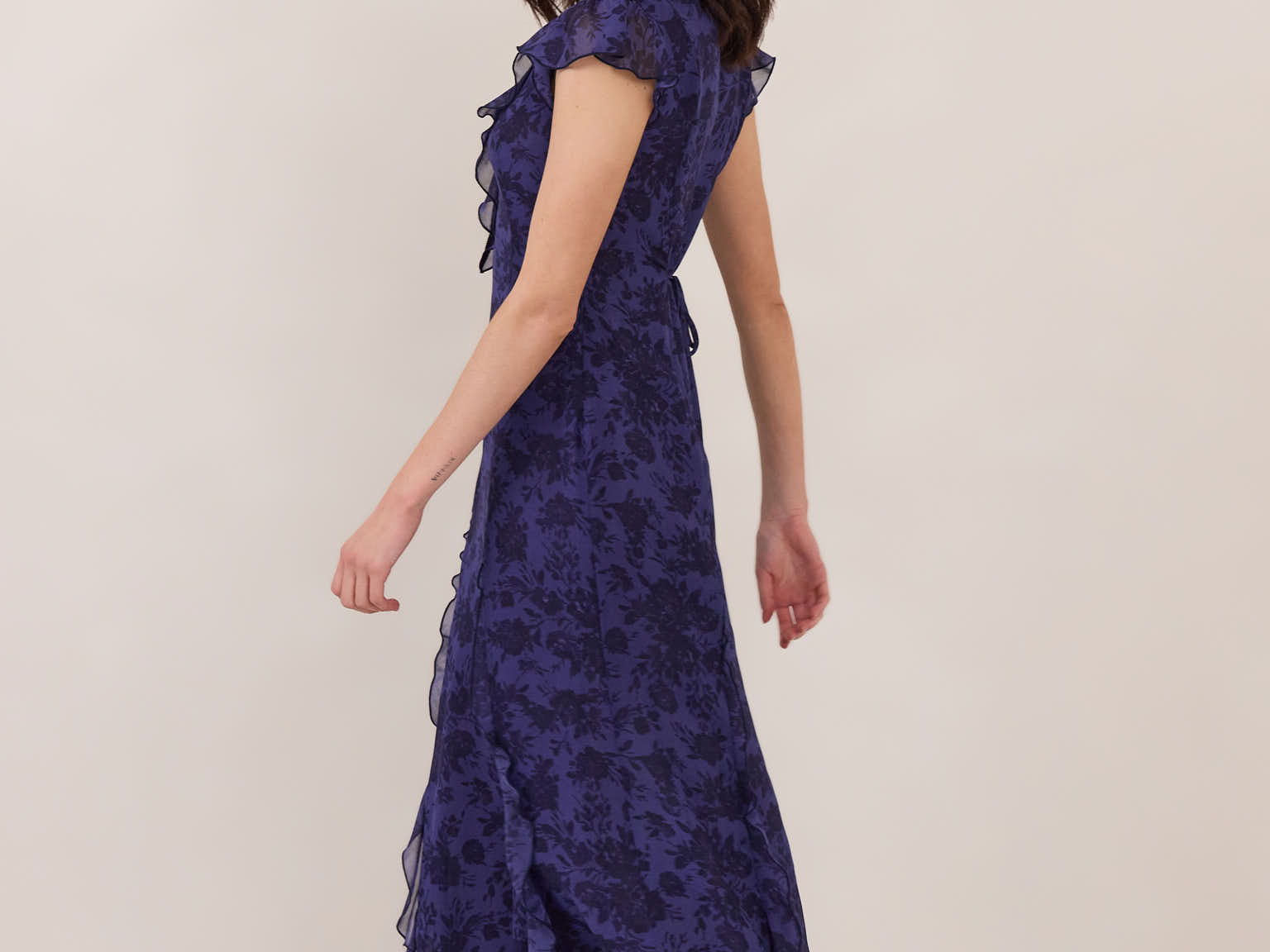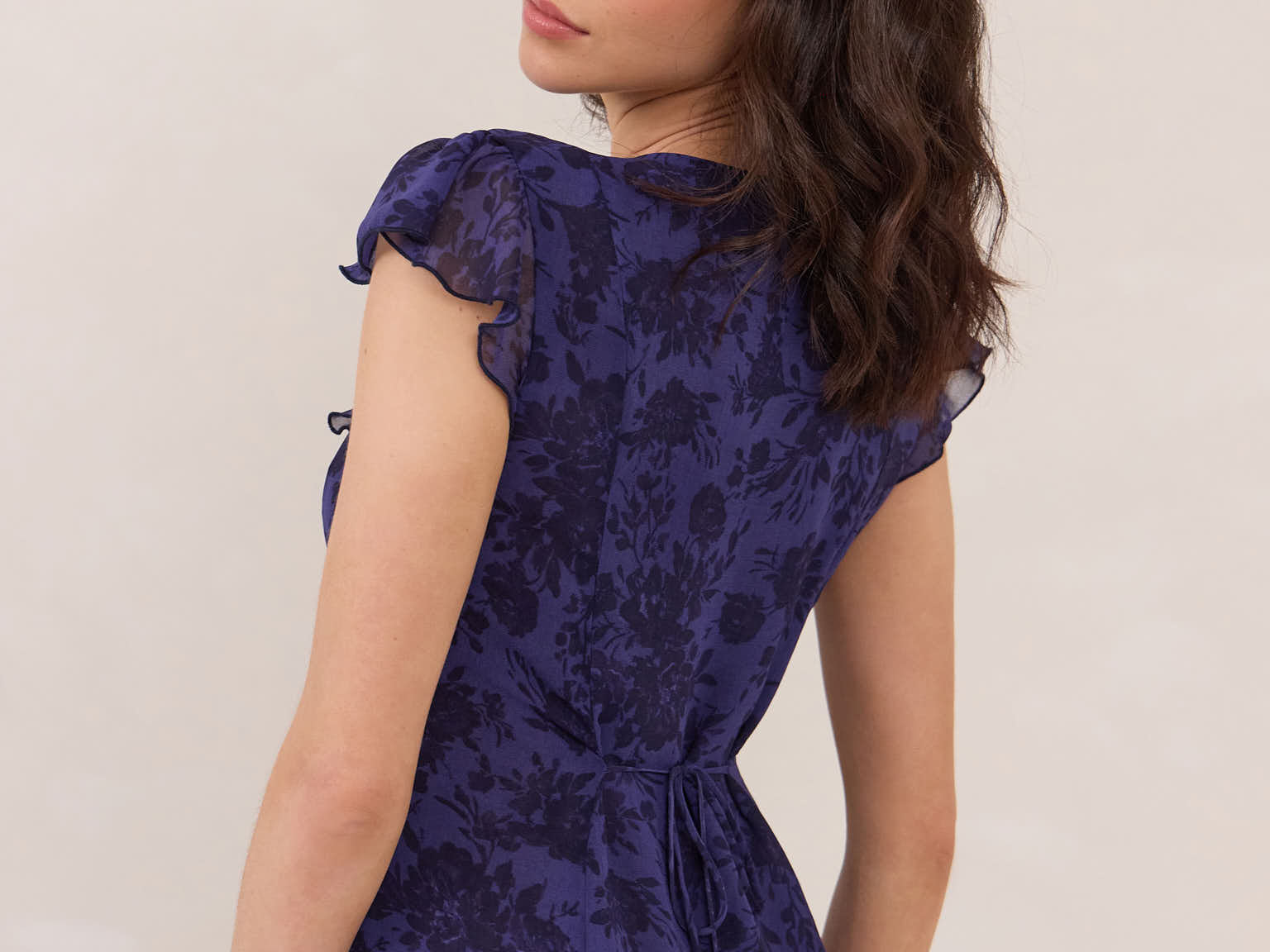 Effortlessly romantic, this chiffon dress features a deep V neckline, playful flutter sleeve and has soft front panels that flatter without clinging, ensuring a comfortable yet elegant fit.
