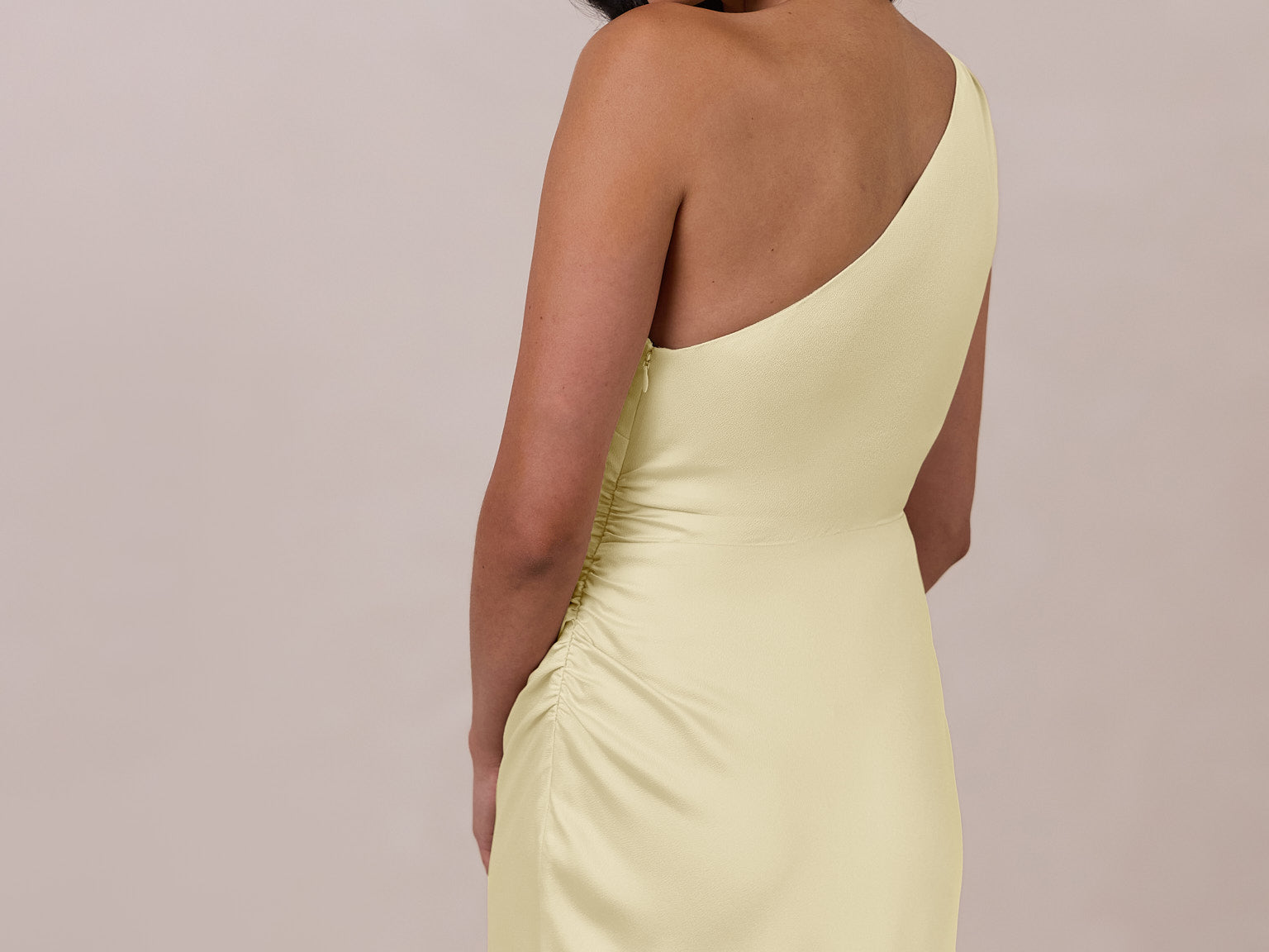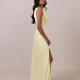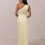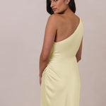 The Hartley dress offers modern minimalism and effortless charm. Made from soft, silky satin, this full-length silhouette drapes beautifully. Delicate ruching on the one-shoulder strap and right side seam adds subtle texture and enhances the figure-hugging fit. A sleek side slit completes the look, offering just the right amount of movement and allure.