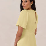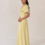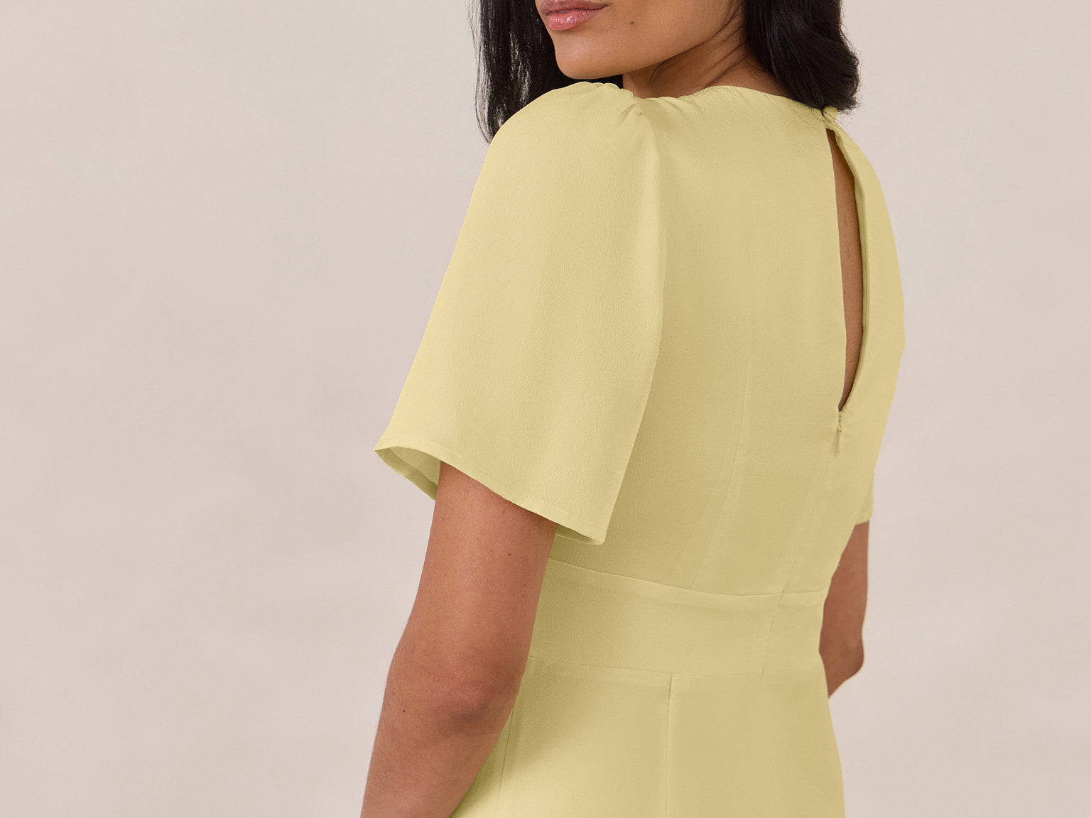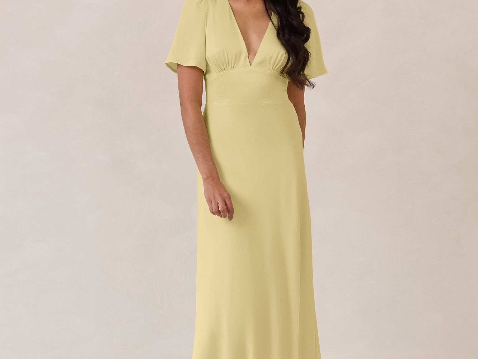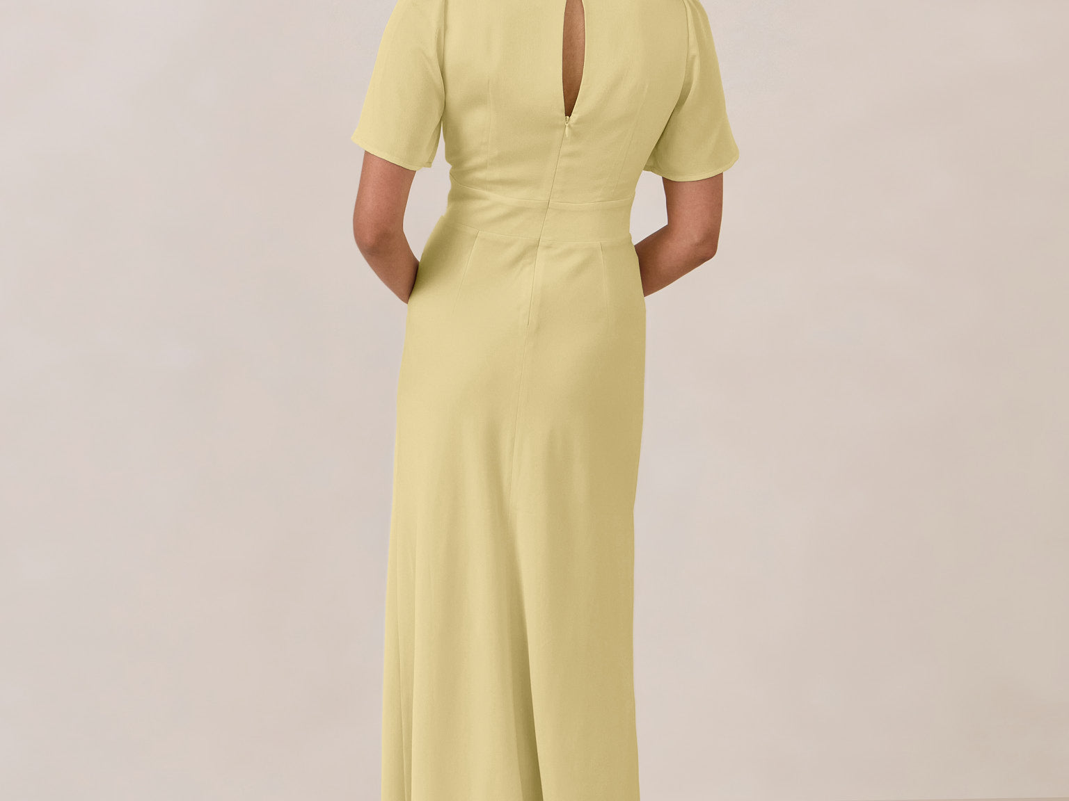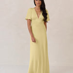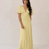 This full-length satin dress features a romantic V neckline, short sleeves, and a bias-cut skirt for an effortlessly feminine silhouette. A subtle keyhole back and delicate button closure add unexpected detail. Finished in silky satin with a soft, light-catching sheen.