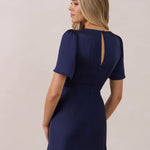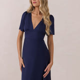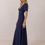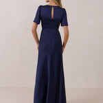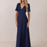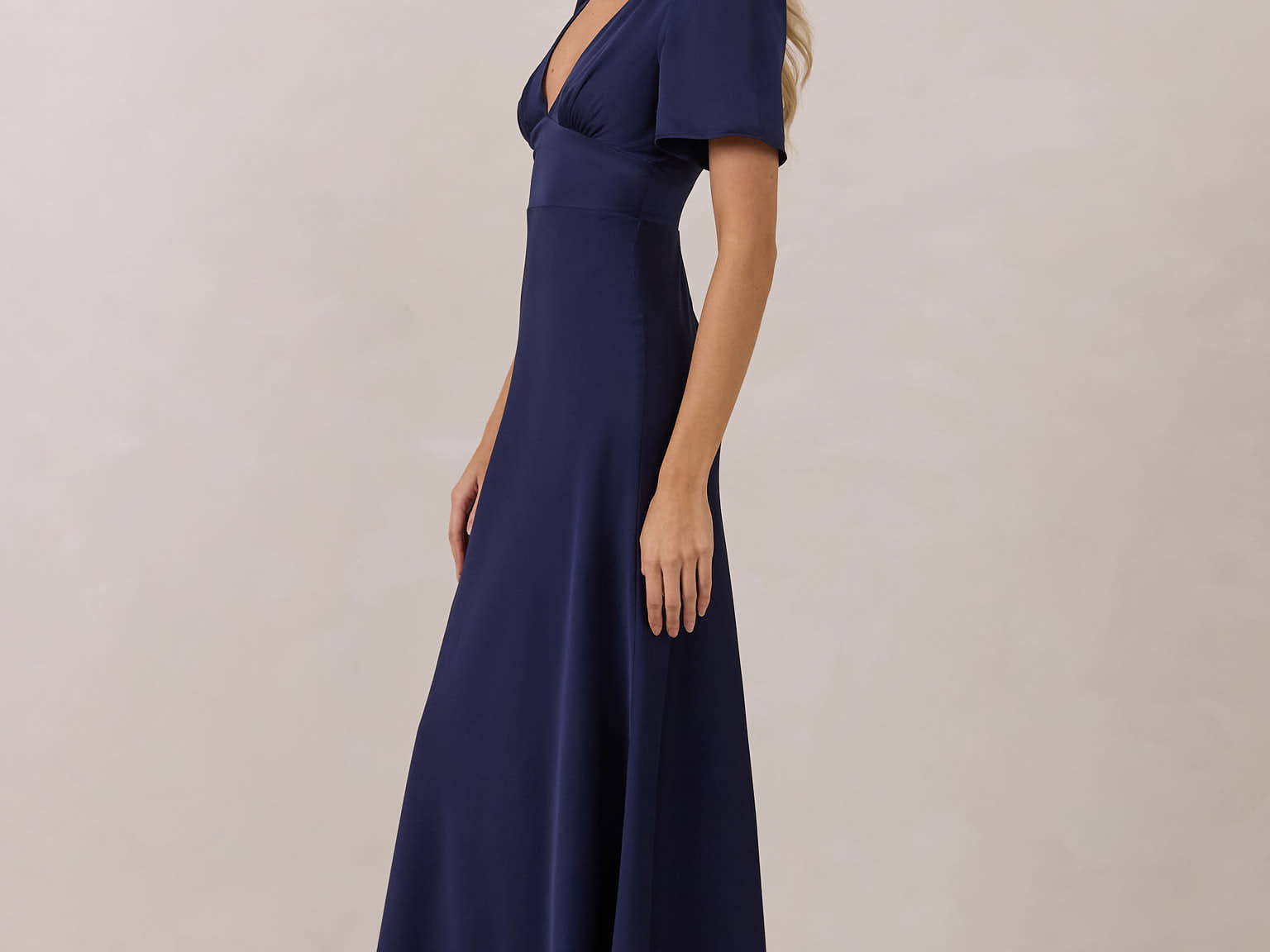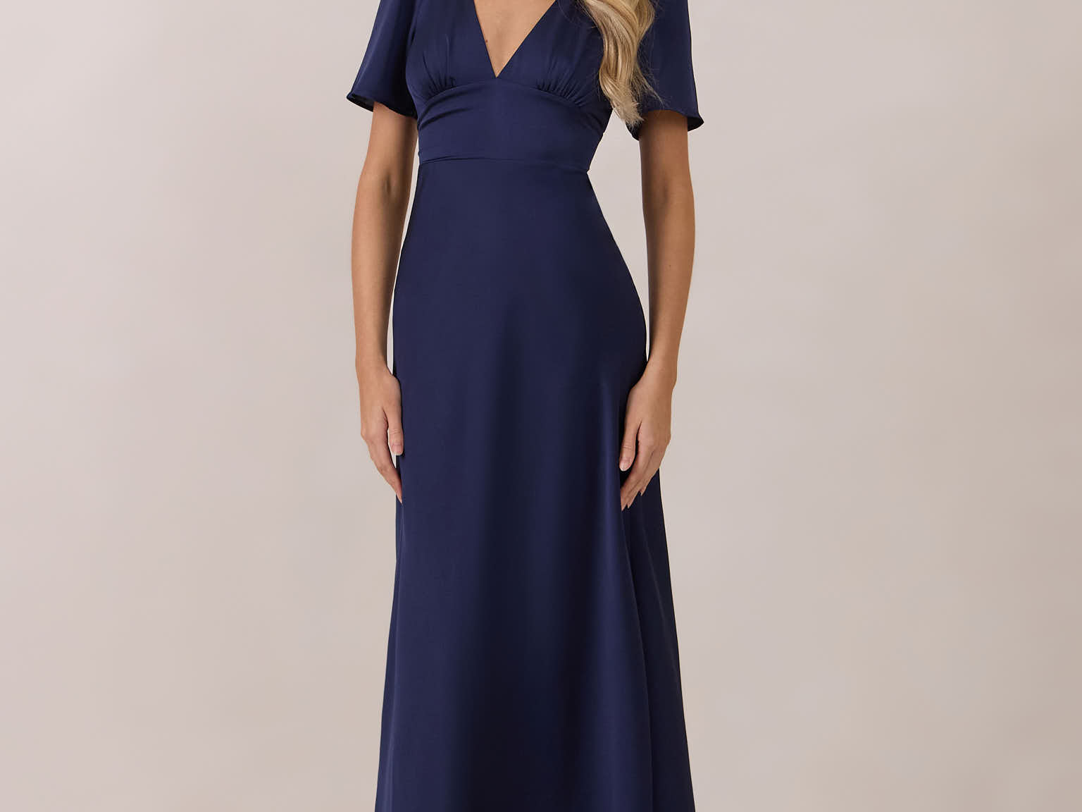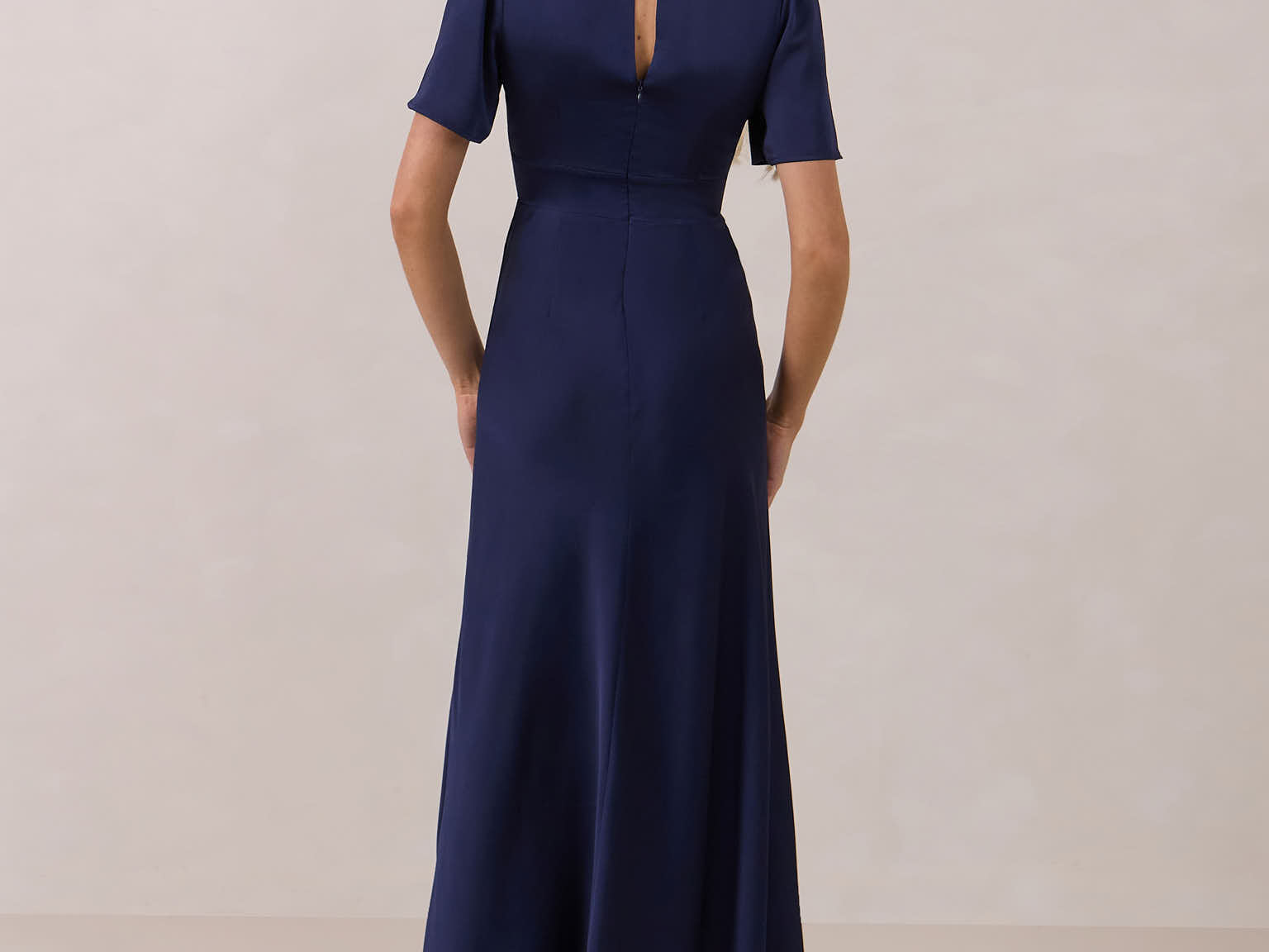 This full-length satin dress features a romantic V neckline, short sleeves, and a bias-cut skirt for an effortlessly feminine silhouette. A subtle keyhole back and delicate button closure add unexpected detail. Finished in silky satin with a soft, light-catching sheen.