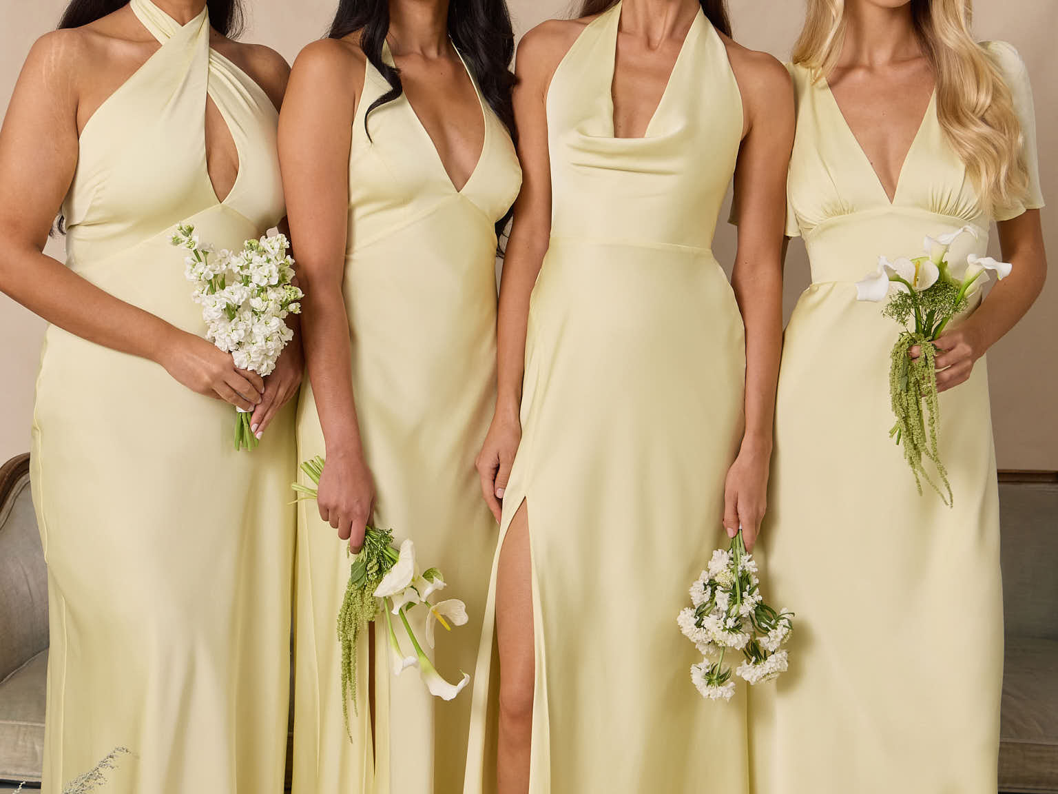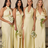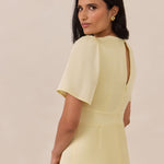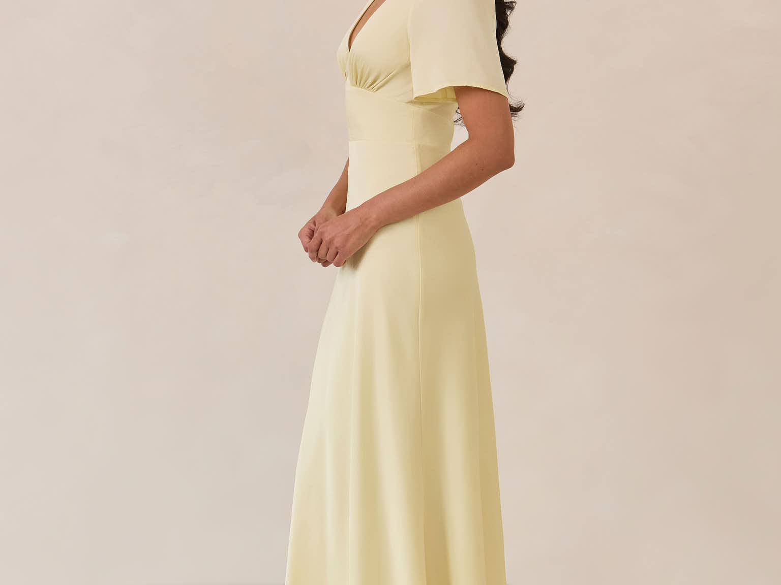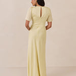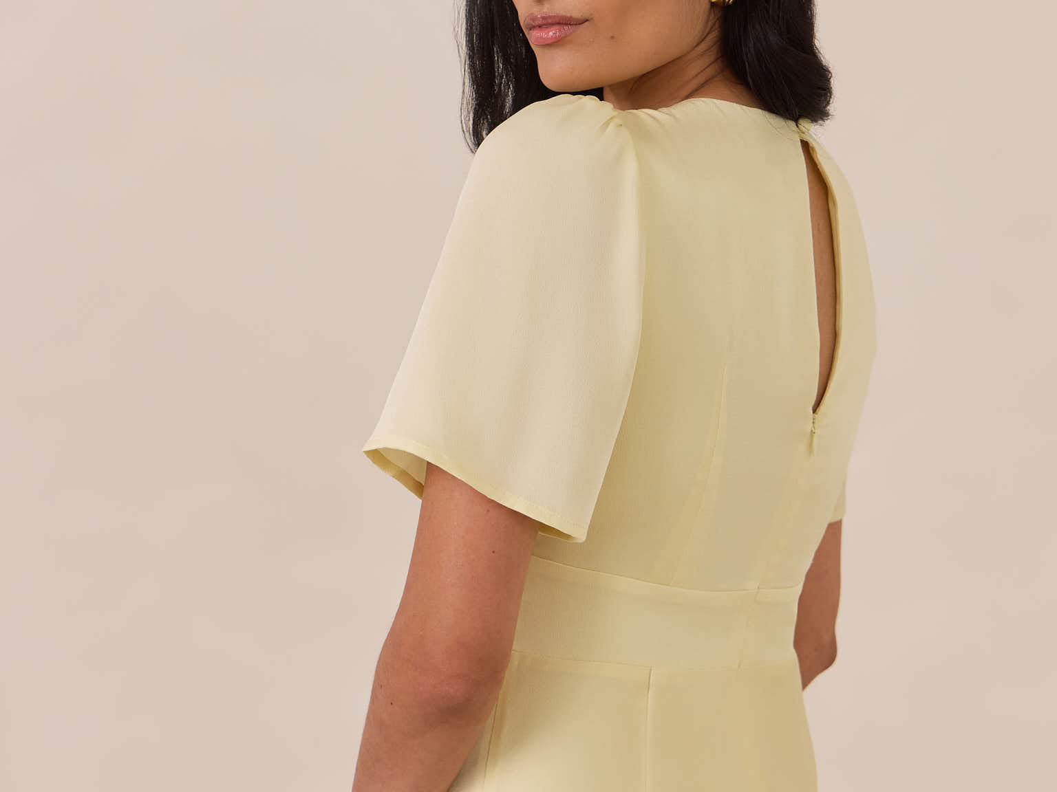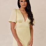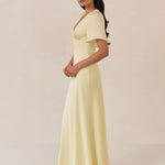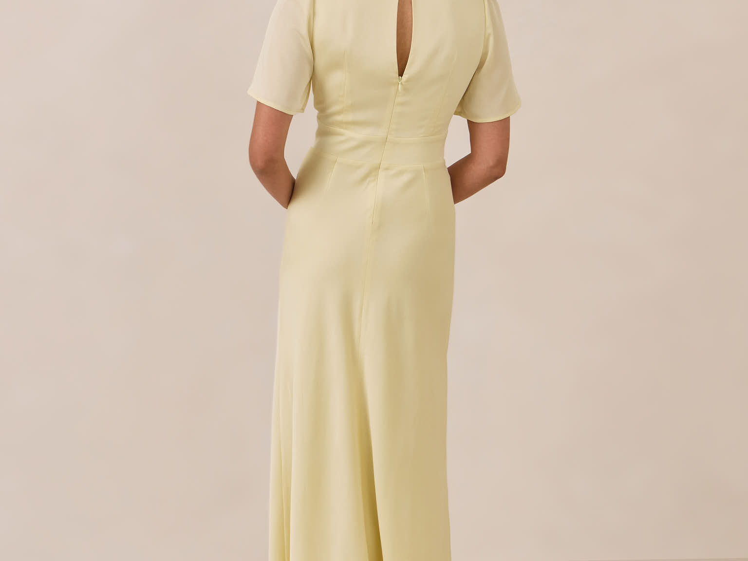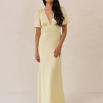 This full-length satin dress features a romantic V neckline, short sleeves, and a bias-cut skirt for an effortlessly feminine silhouette. A subtle keyhole back and delicate button closure add unexpected detail. Finished in silky satin with a soft, light-catching sheen.