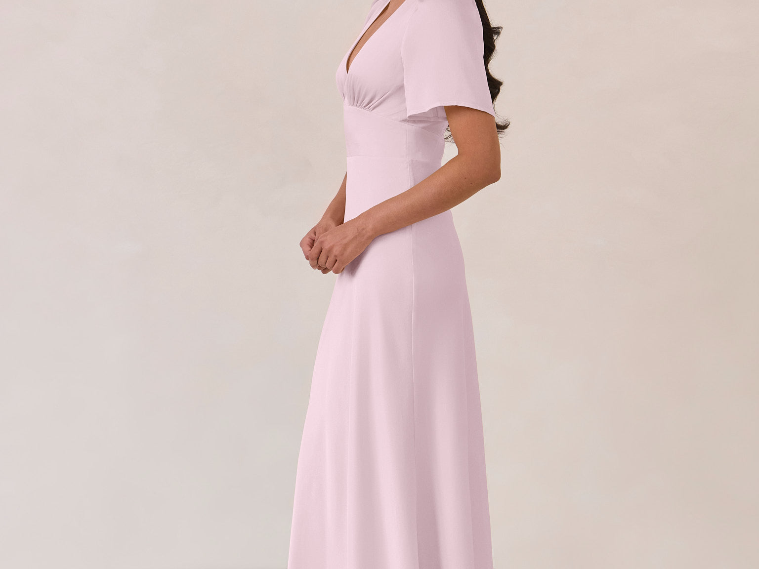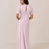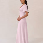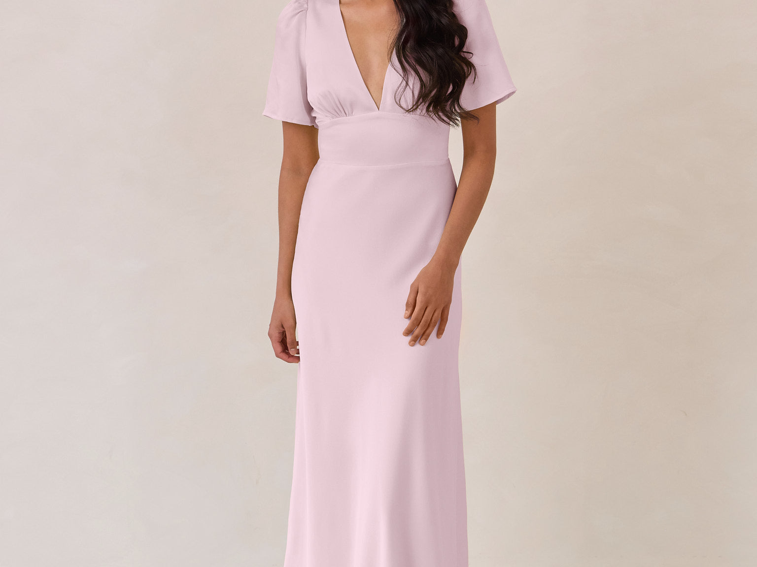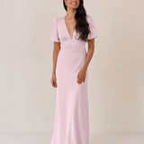 This full-length satin dress features a romantic V neckline, short sleeves, and a bias-cut skirt for an effortlessly feminine silhouette. A subtle keyhole back and delicate button closure add unexpected detail. Finished in silky satin with a soft, light-catching sheen.