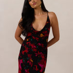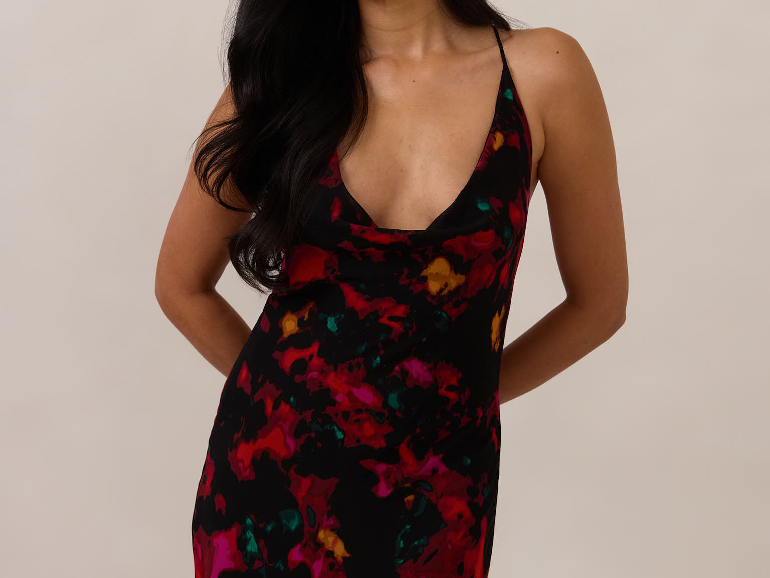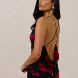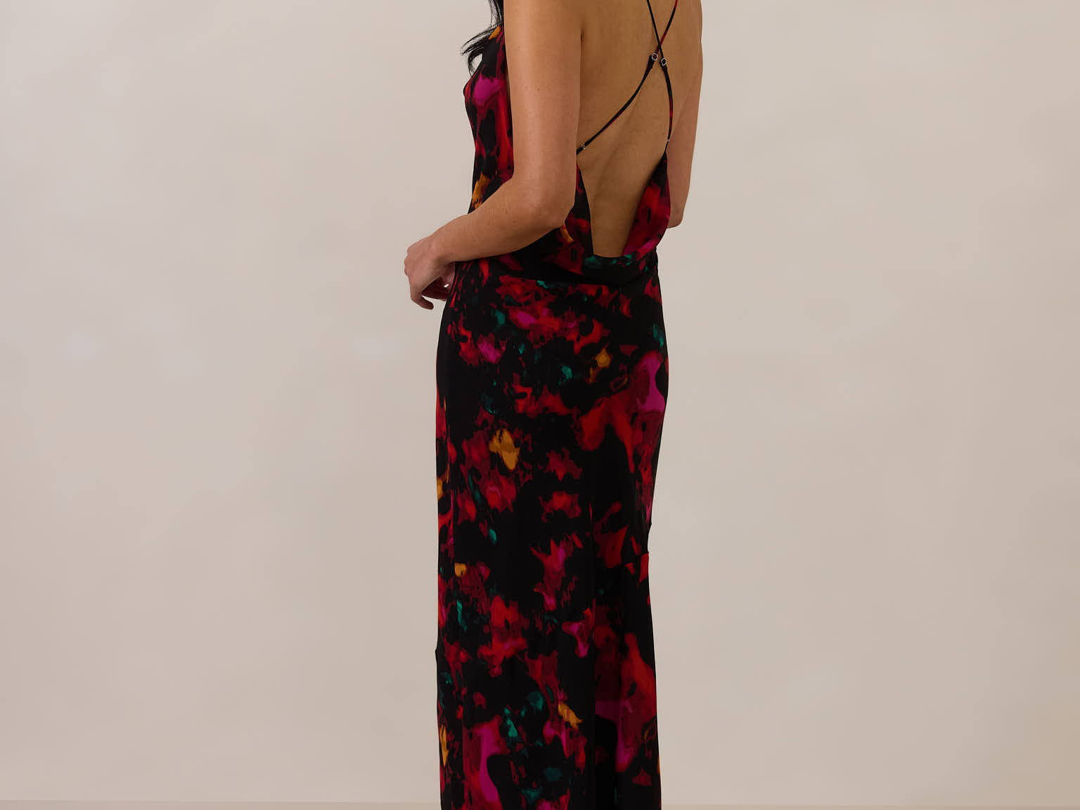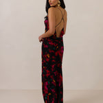 This floor-length chiffon dress is designed with a soft draped cowl neckline and a low open back for a silhouette that feels modern and feminine. Cut on the bias, it skims the body for a flattering, fluid fit that moves naturally.