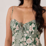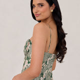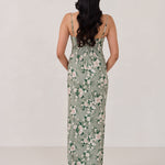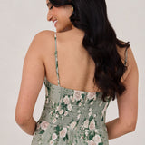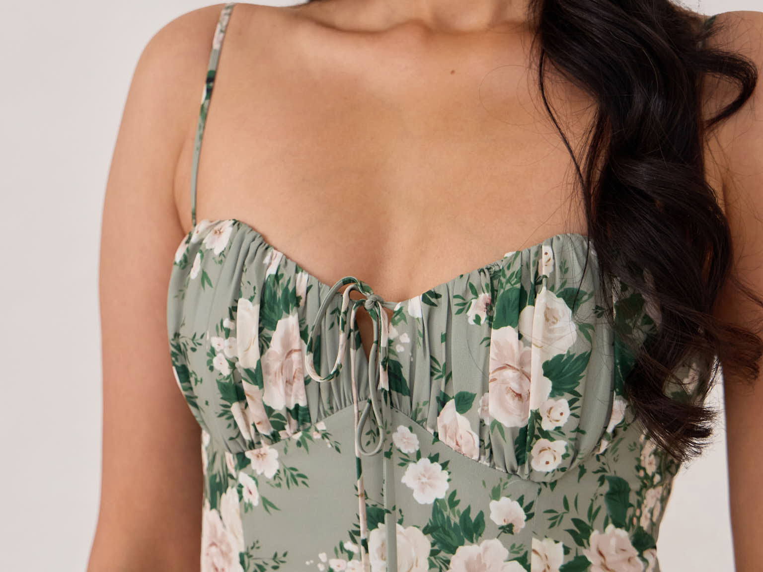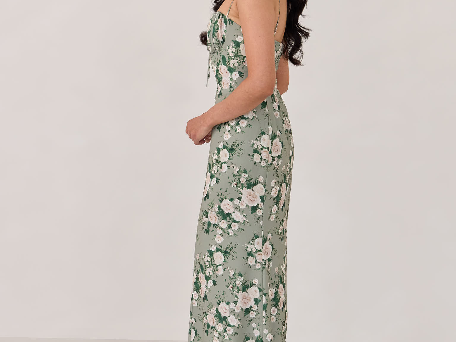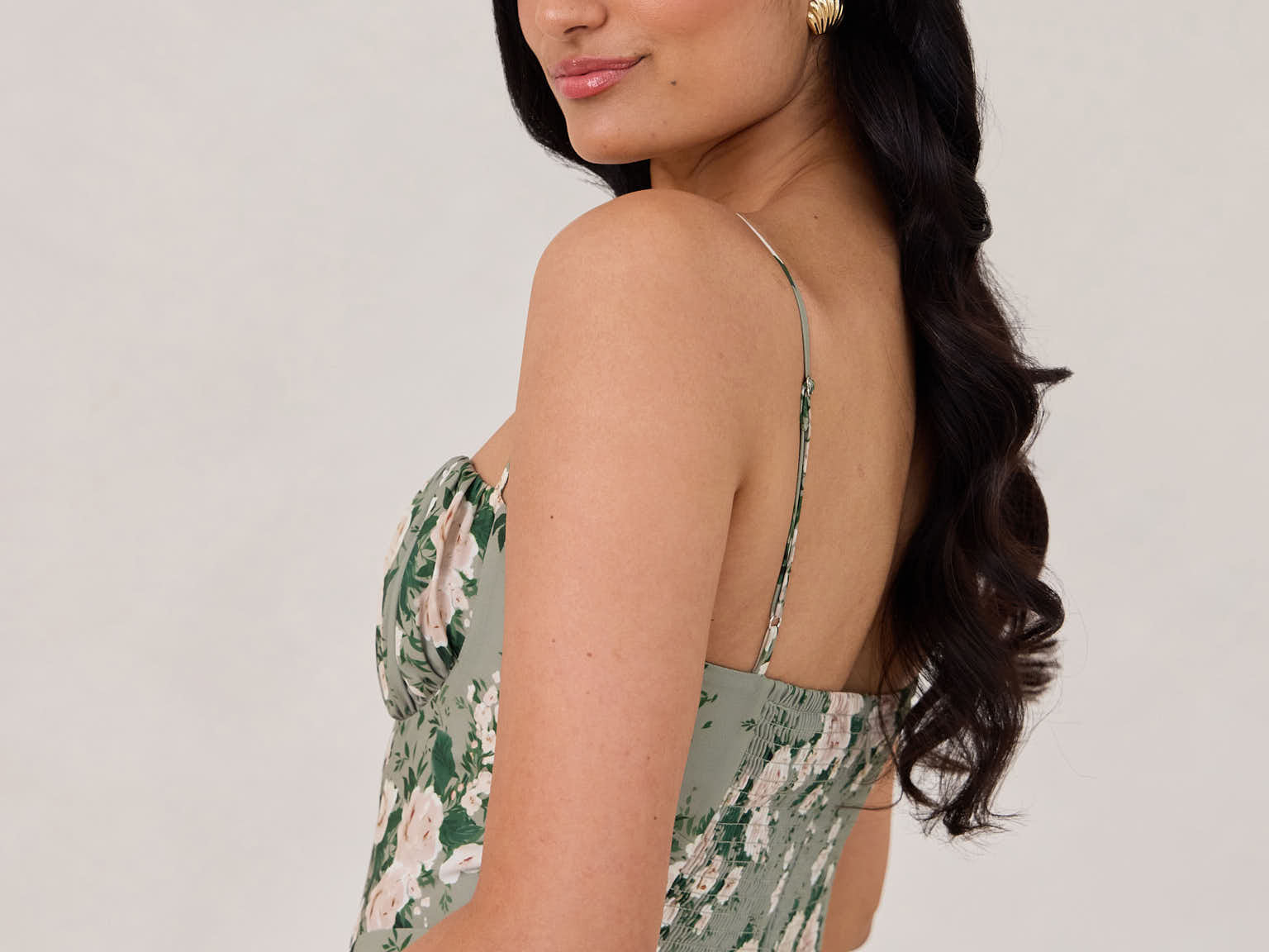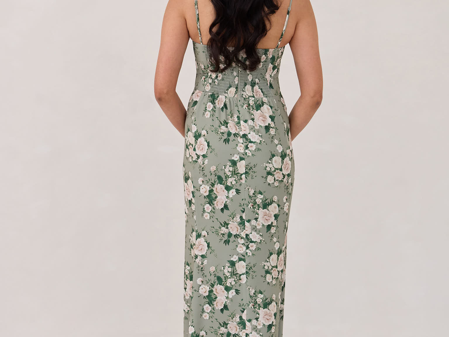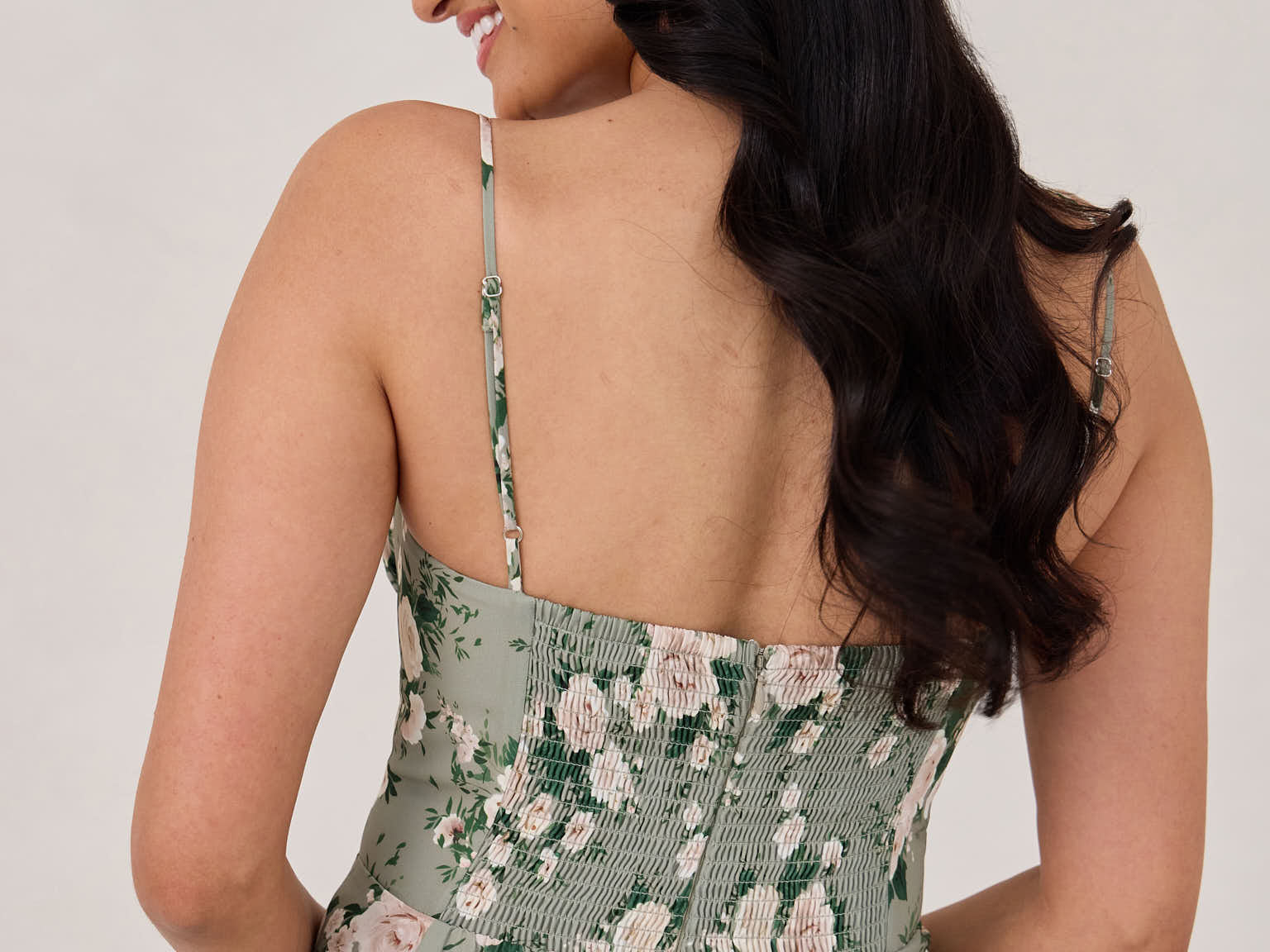 Designed with a basque waist and structured paneling, this dress offers a flattering, sculpted silhouette. The ruched bodice and shirred back give it a comfortable, flexible fit.