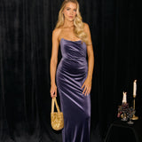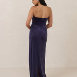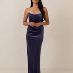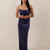 Designed from plush velvet for a touch of opulence, this strapless dress features a soft scoop neckline and a boned bodice for a structured, flattering fit. The bias-cut skirt skims the body, creating a smooth, elongating silhouette, while a subtle back slit adds ease of movement and a hint of allure.