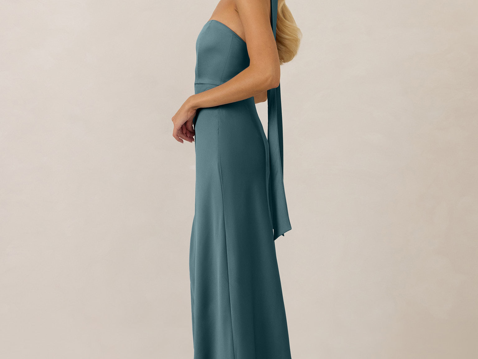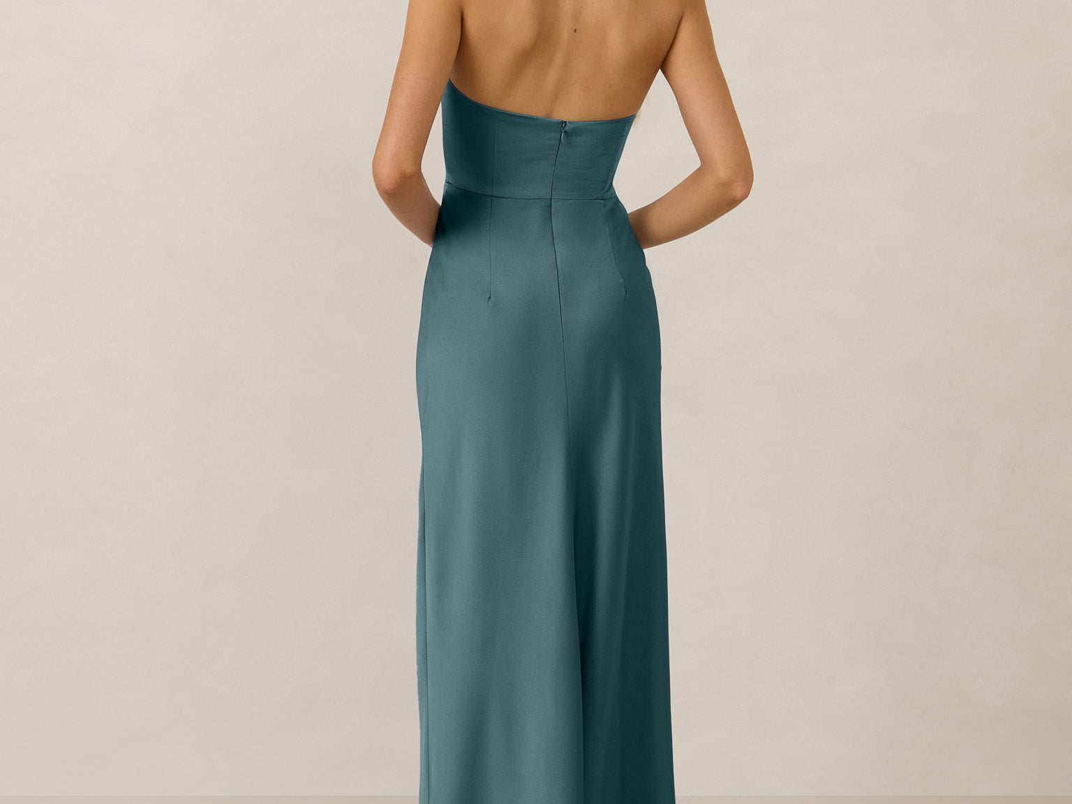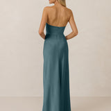 With an emphasis on the details, this satin maxi dress is cut on the bias for an ultra-flattering drape that skims the body perfectly. A subtle, hip-grazing slit adds movement and a touch of leg, while removable straps offer versatility—wear it strapless for a sleek look or with straps for added support and structure.