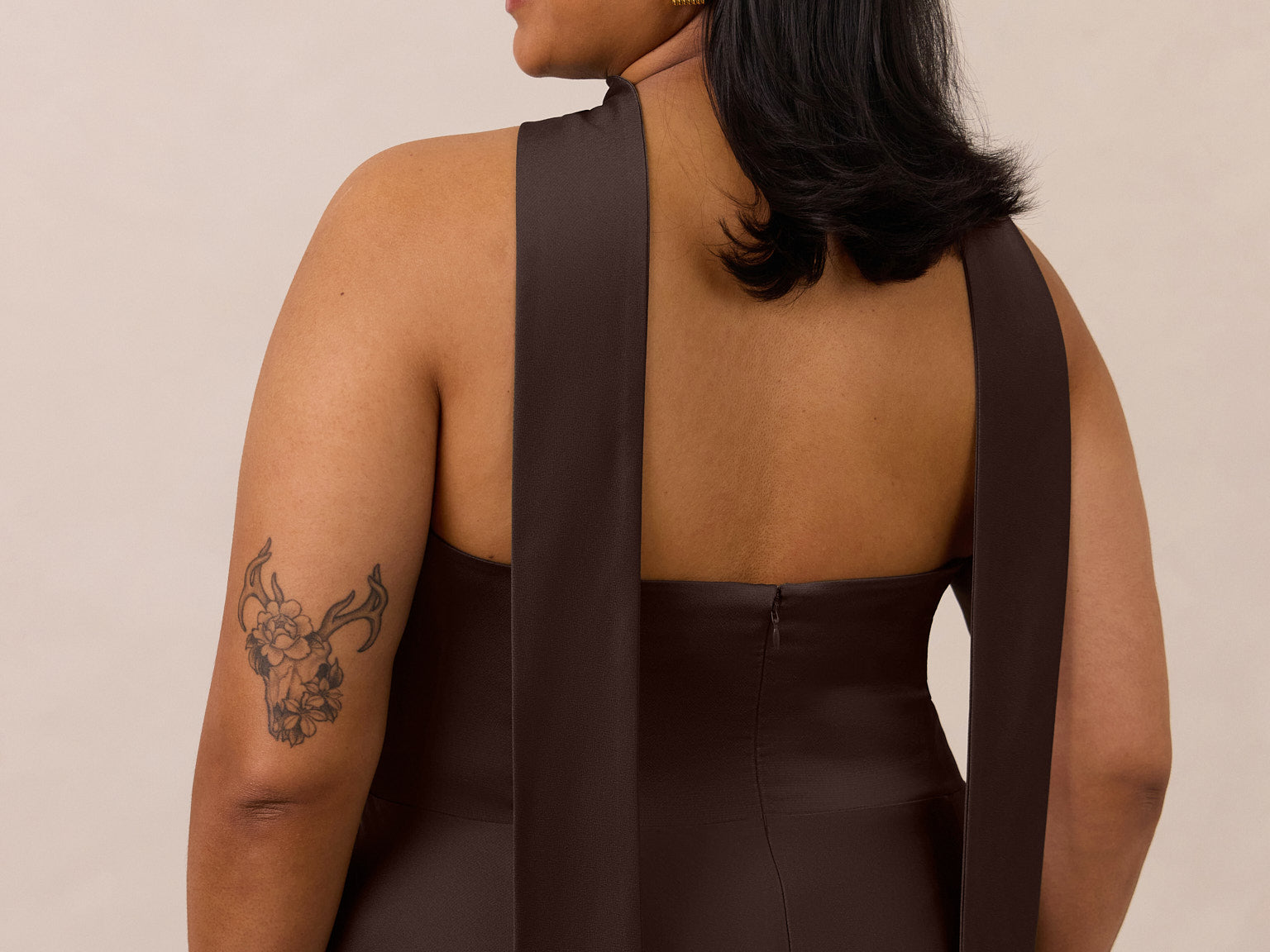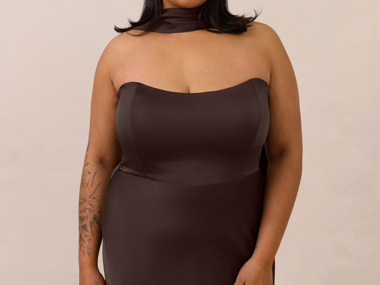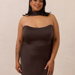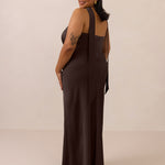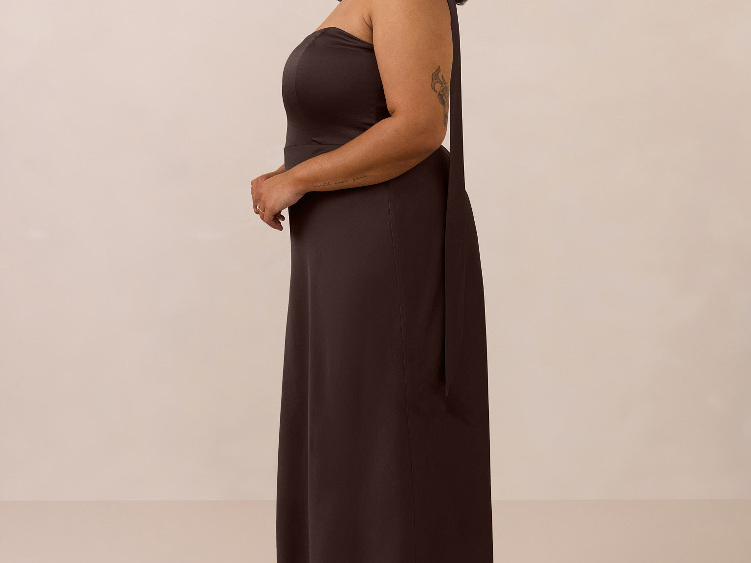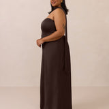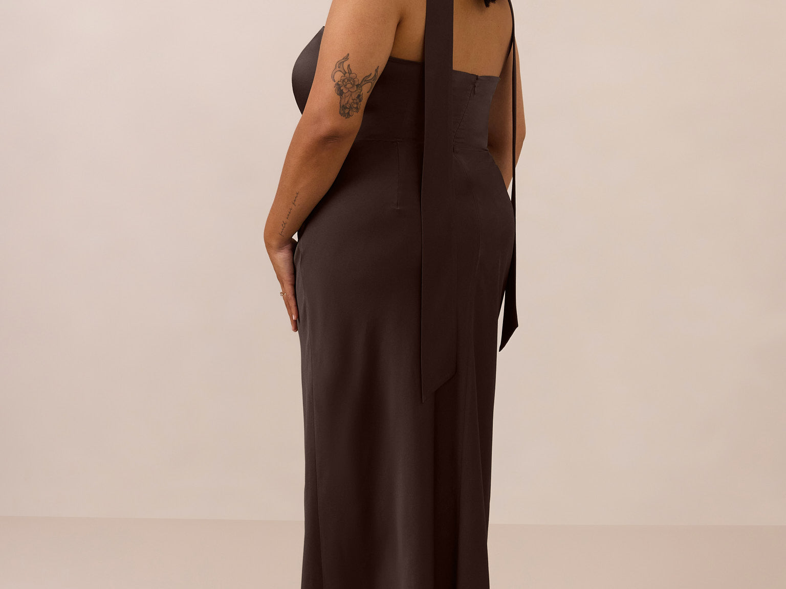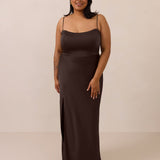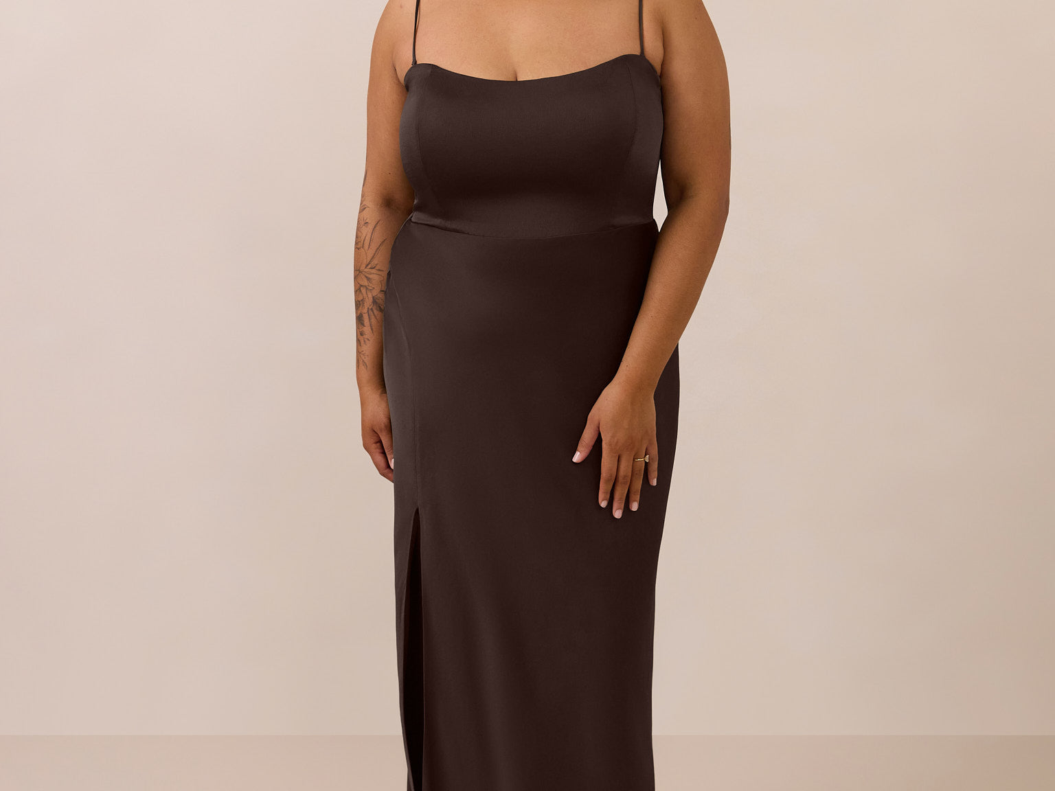With an emphasis on the details, this satin maxi dress is cut on the bias for an ultra-flattering drape that skims the body perfectly. A subtle, hip-grazing slit adds movement and a touch of leg, while removable straps offer versatility—wear it strapless for a sleek look or with straps for added support and structure.