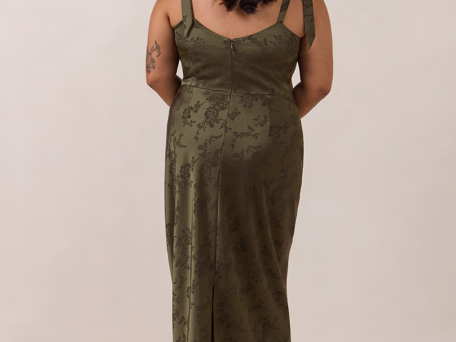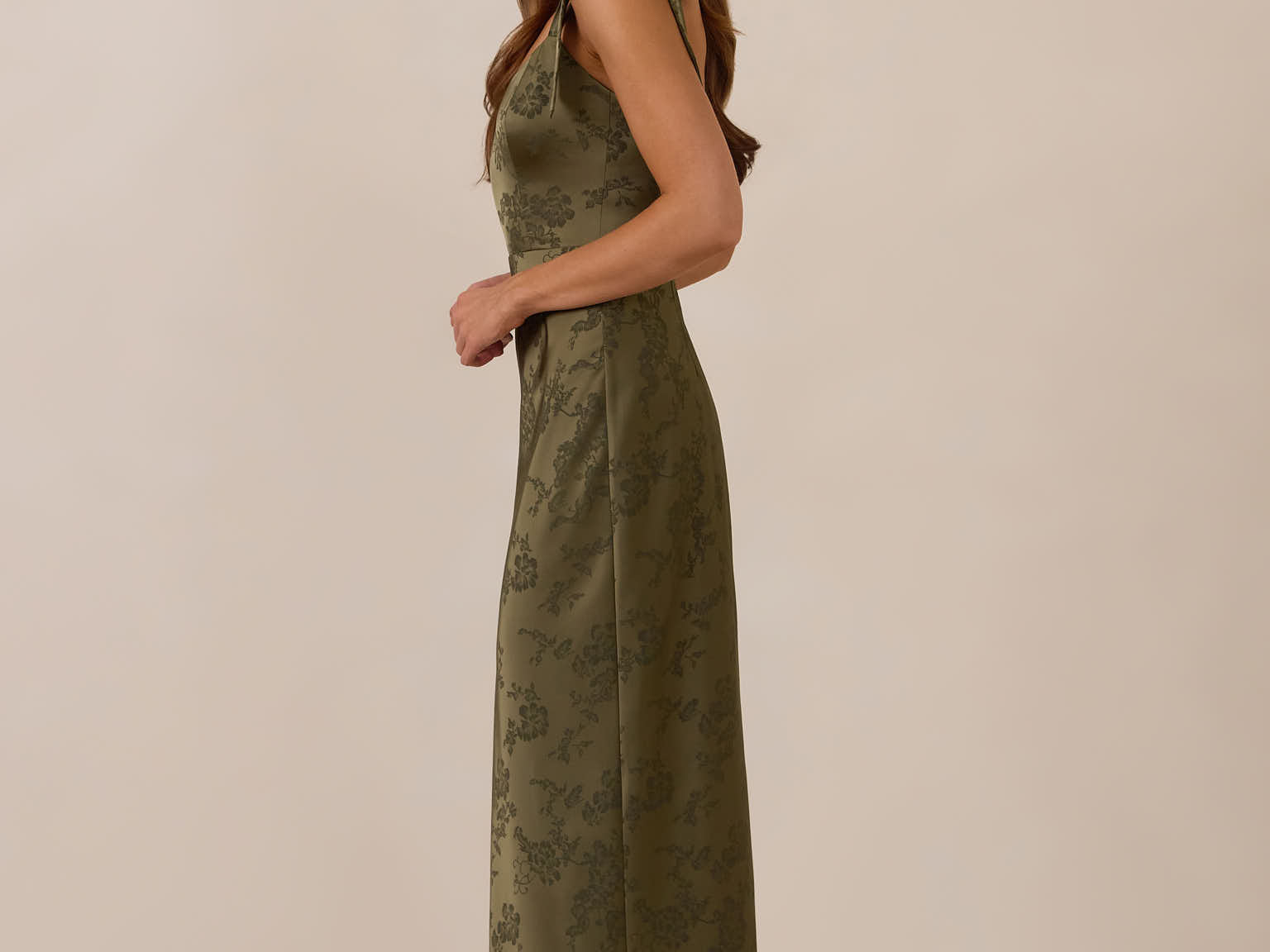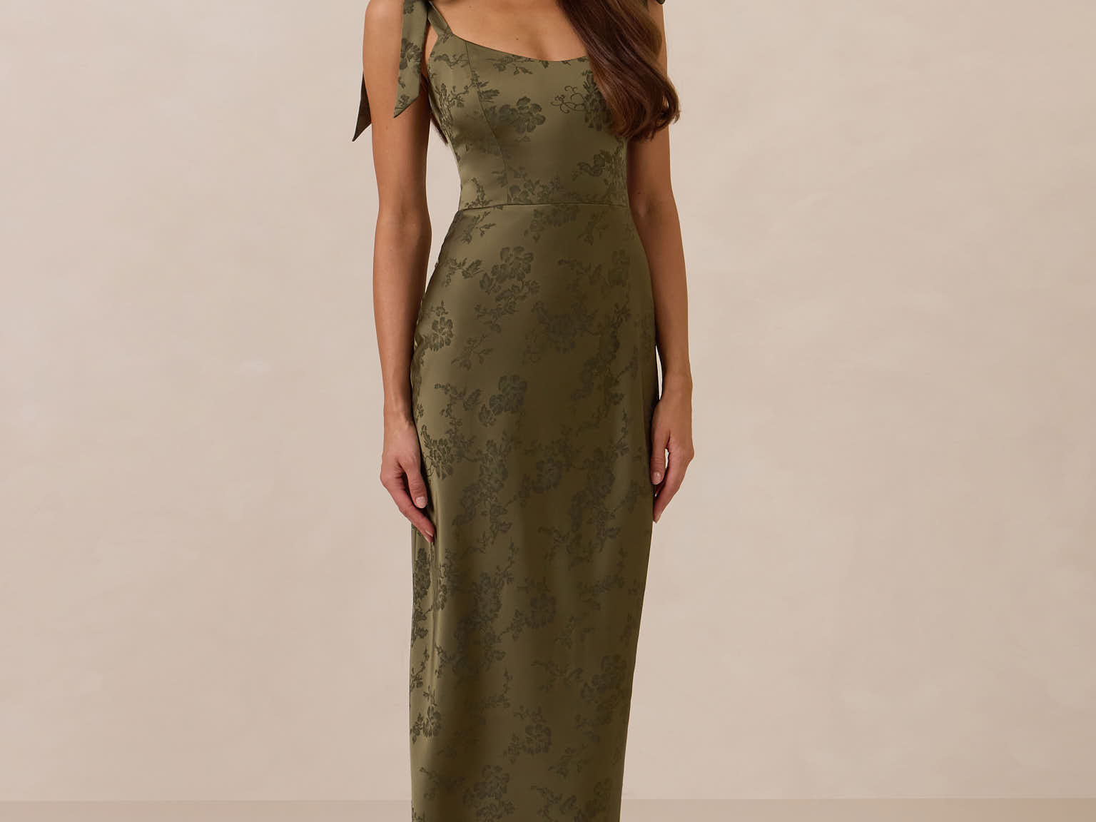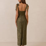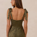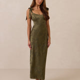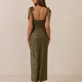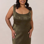 Crafted from luxurious Jacquard satin, this dress features feminine tie straps and a flattering bias-cut skirt, offering a flattering silhouette with timeless appeal.