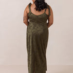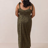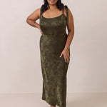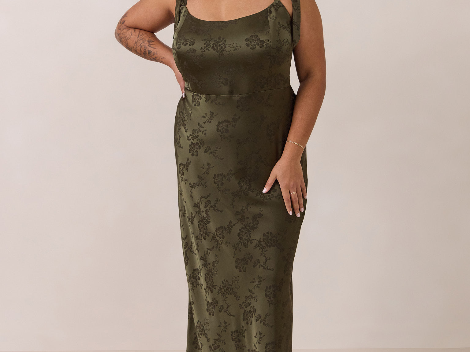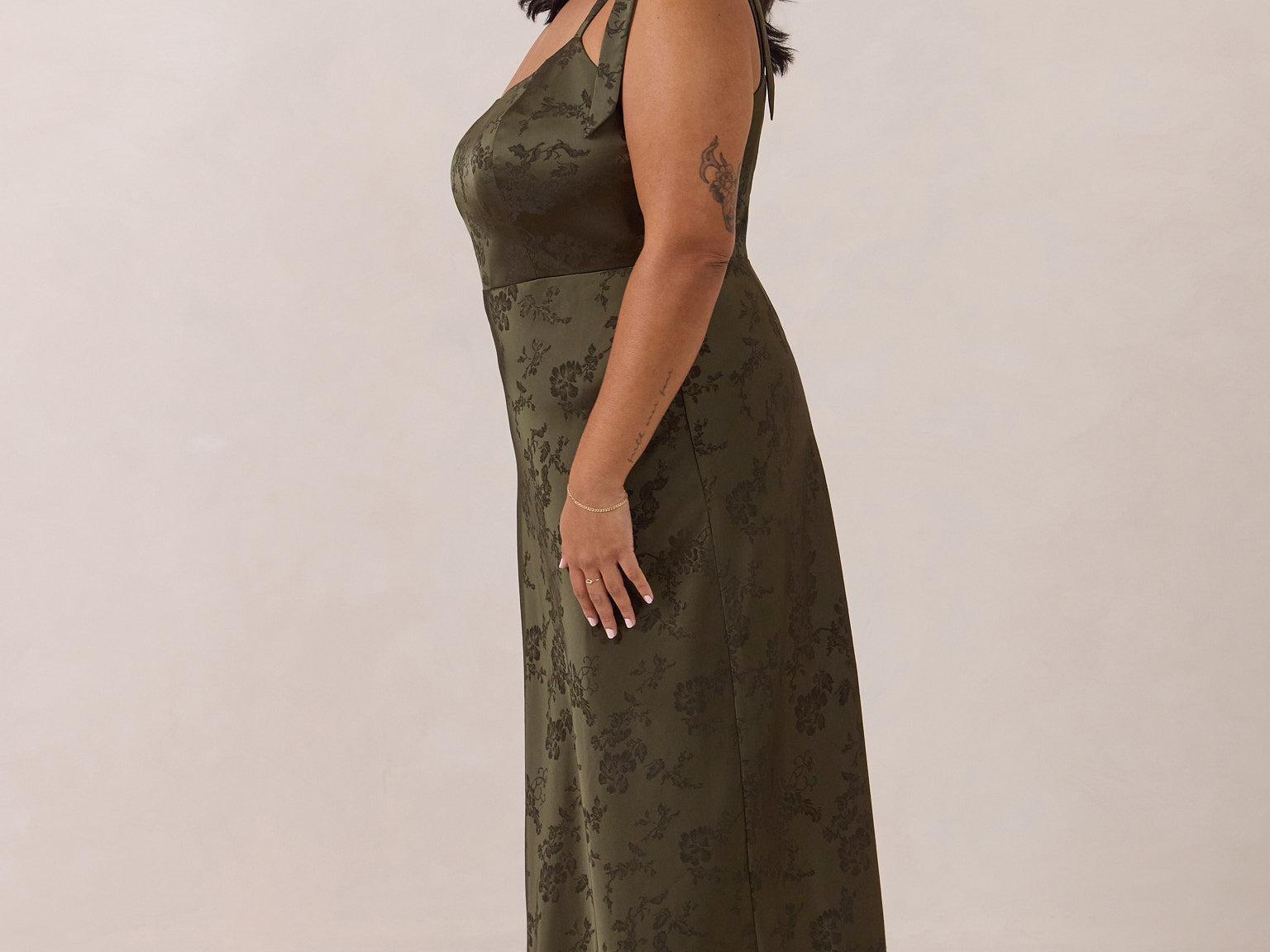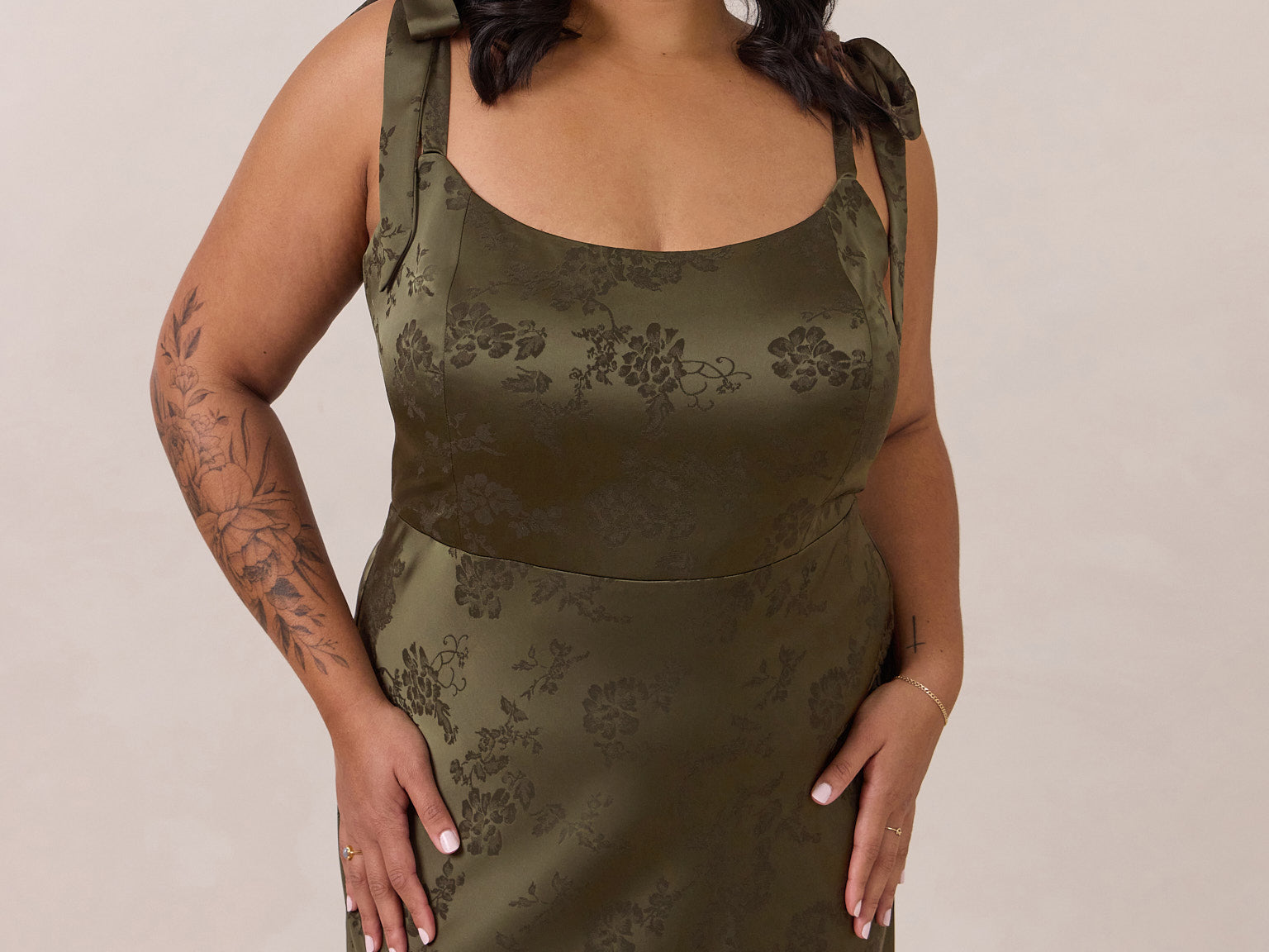 Crafted from luxurious Jacquard satin, this dress features feminine tie straps and a flattering bias-cut skirt, offering a flattering silhouette with timeless appeal.