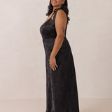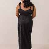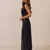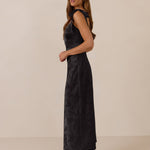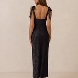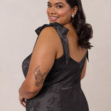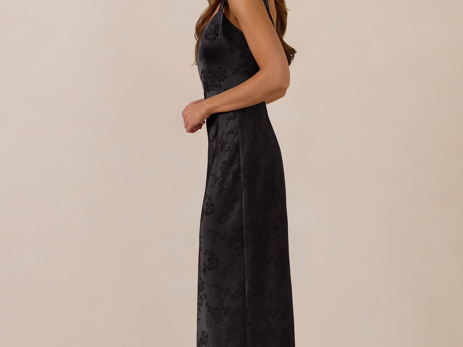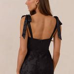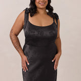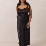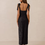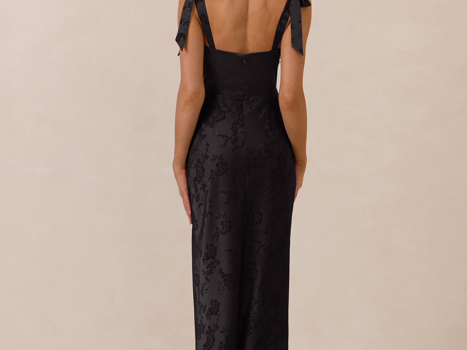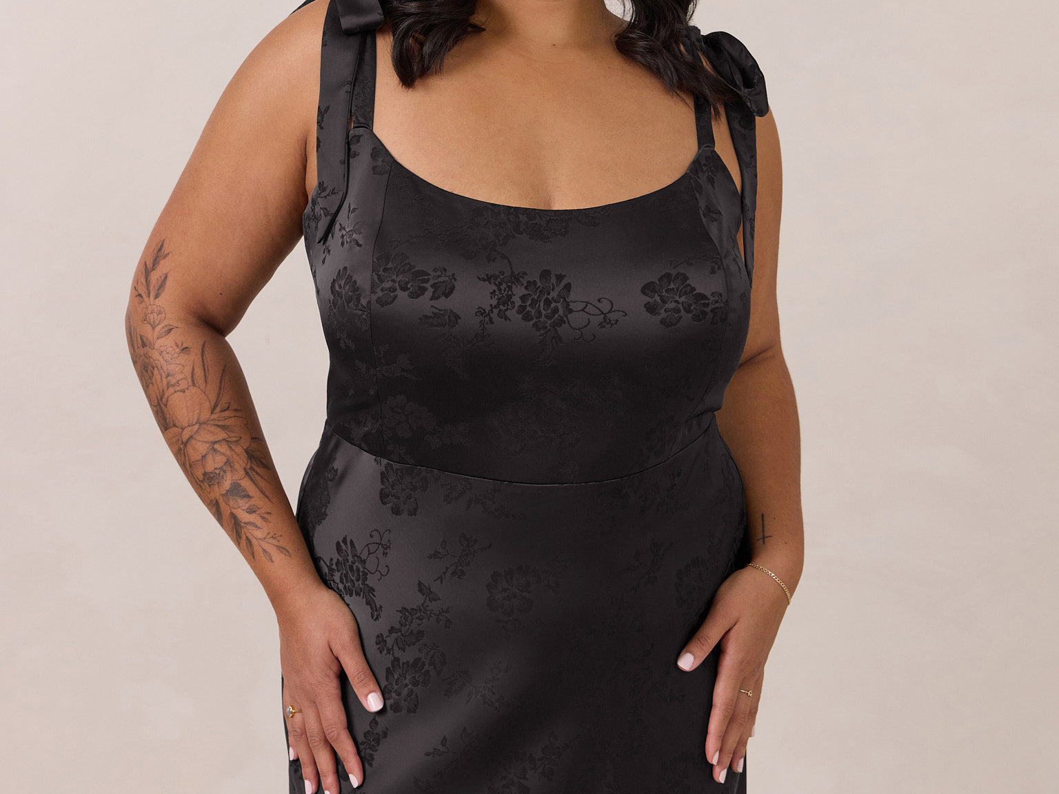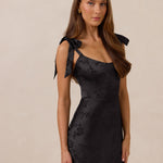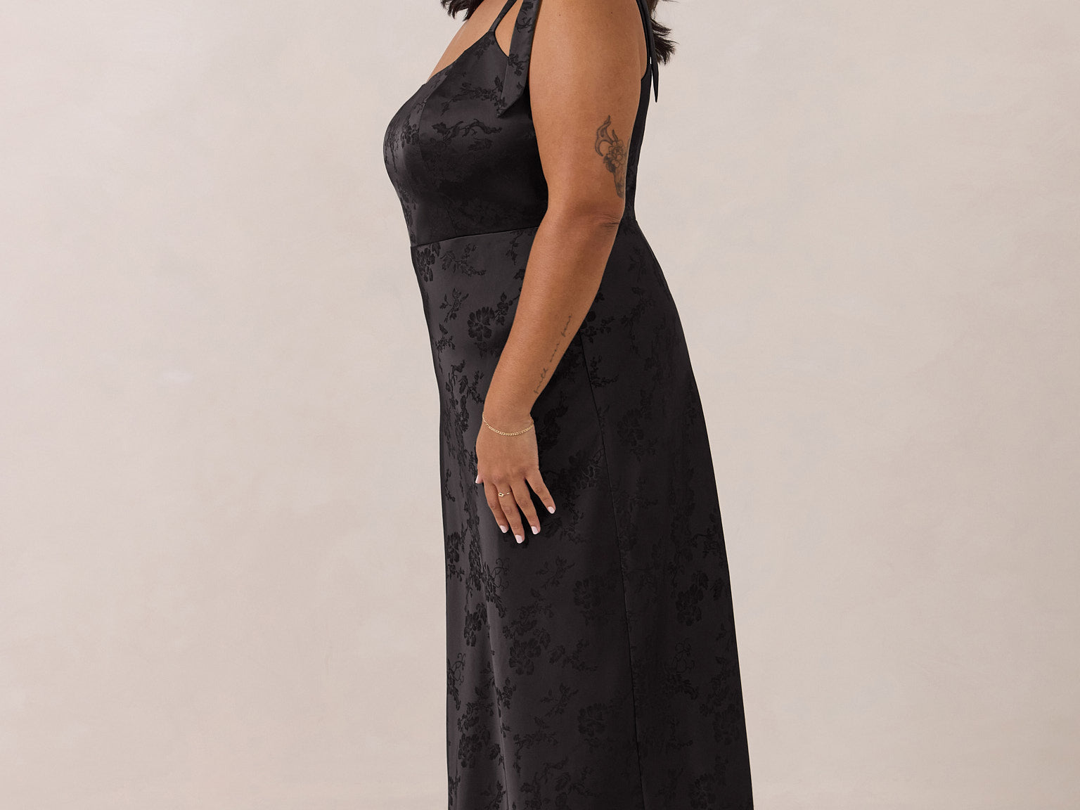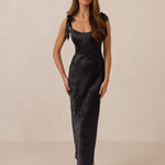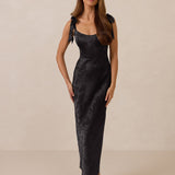 Crafted from luxurious Jacquard satin, this dress features feminine tie straps and a flattering bias-cut skirt, offering a flattering silhouette with timeless appeal.