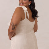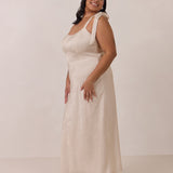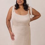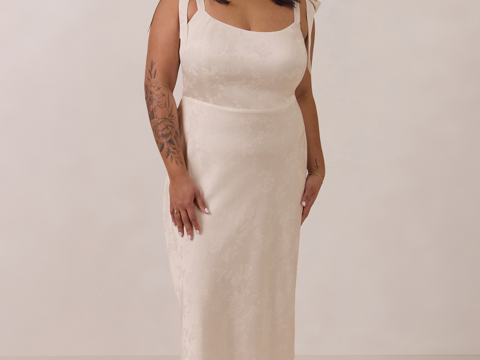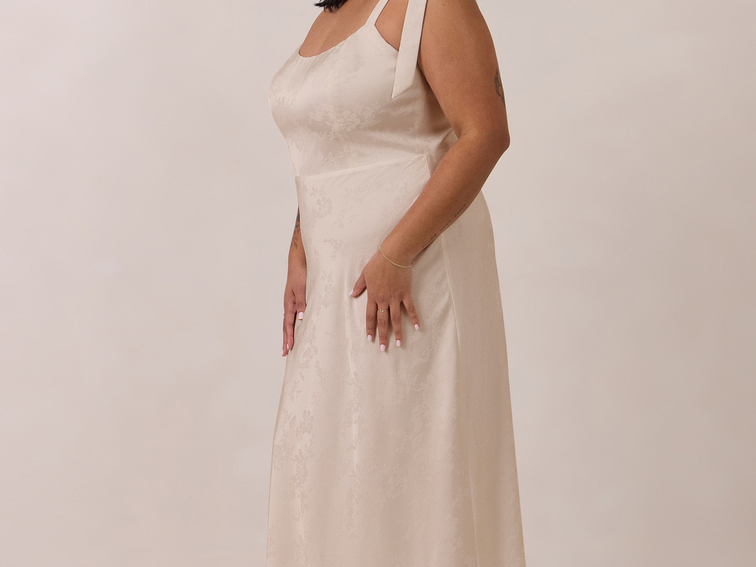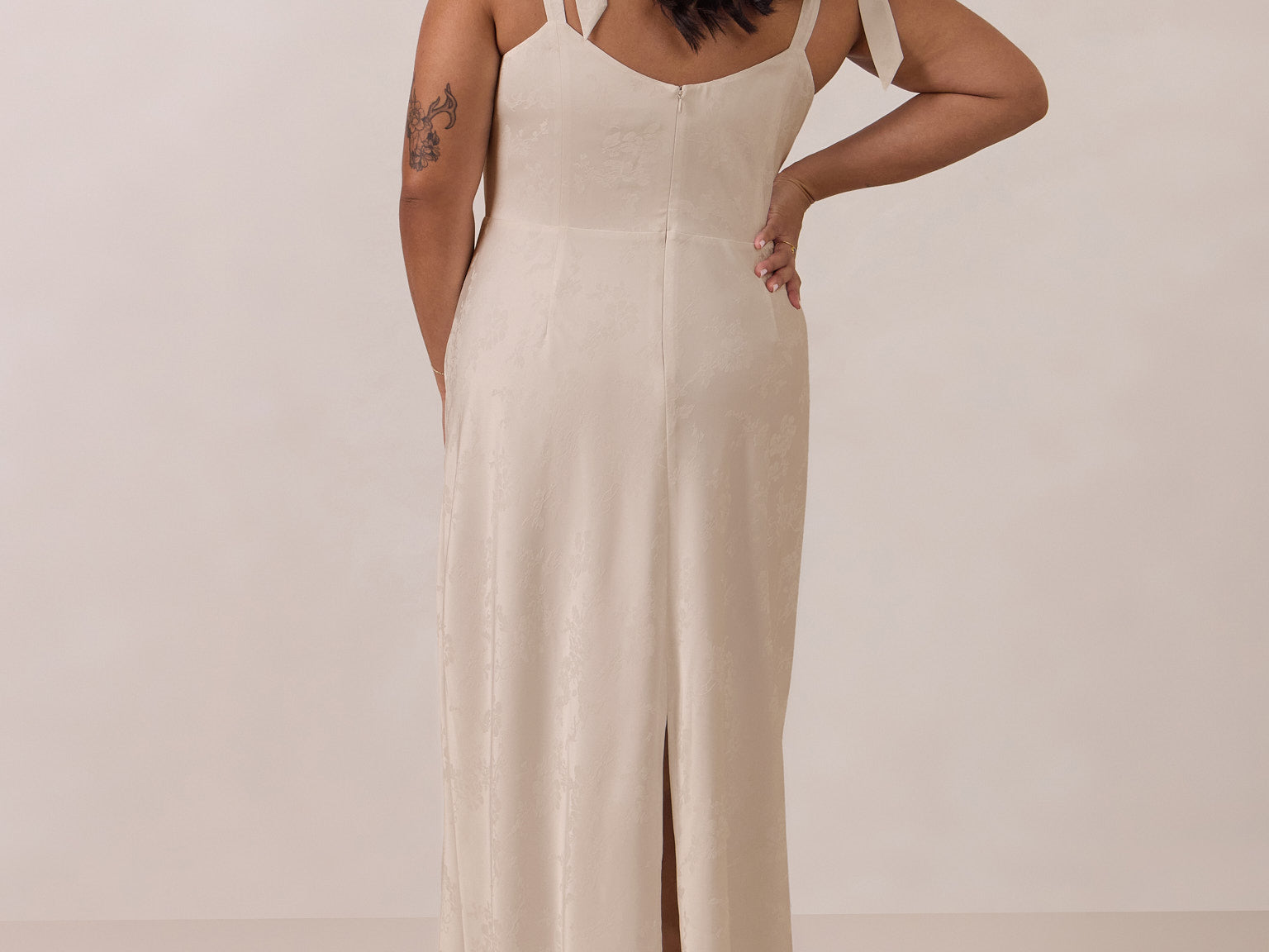 Crafted from luxurious Jacquard satin, this dress features feminine tie straps and a flattering bias-cut skirt, offering a flattering silhouette with timeless appeal.