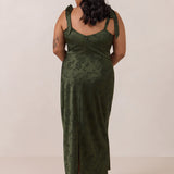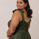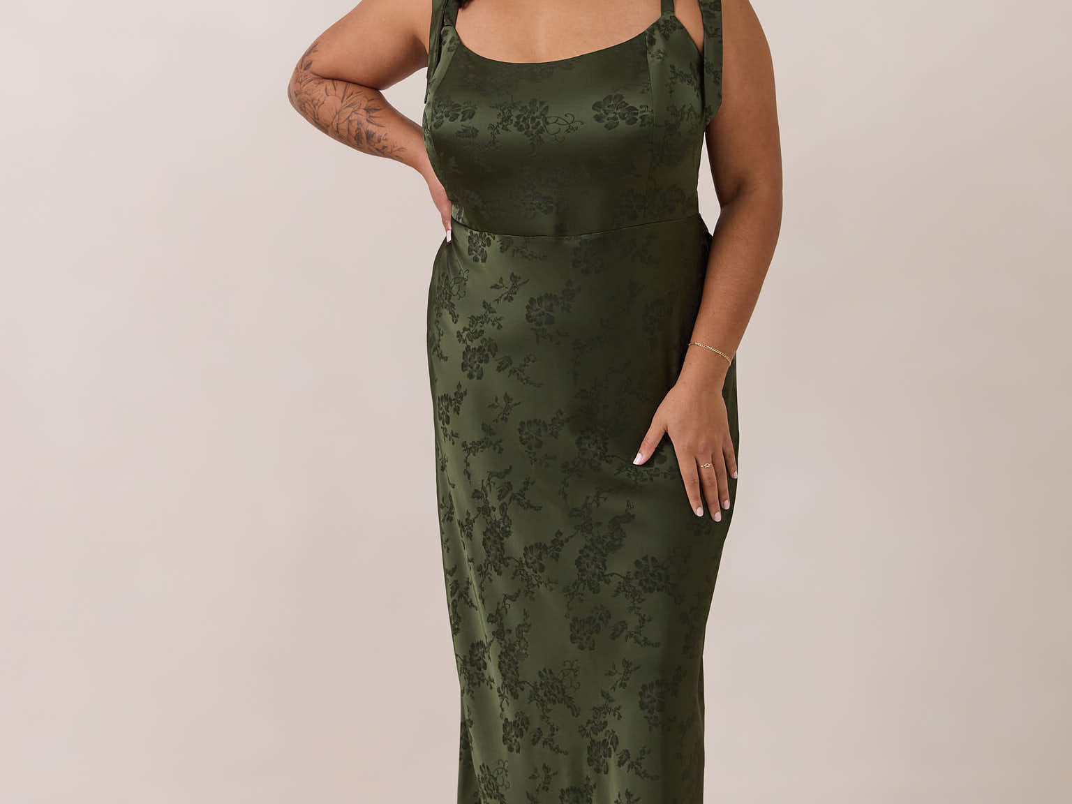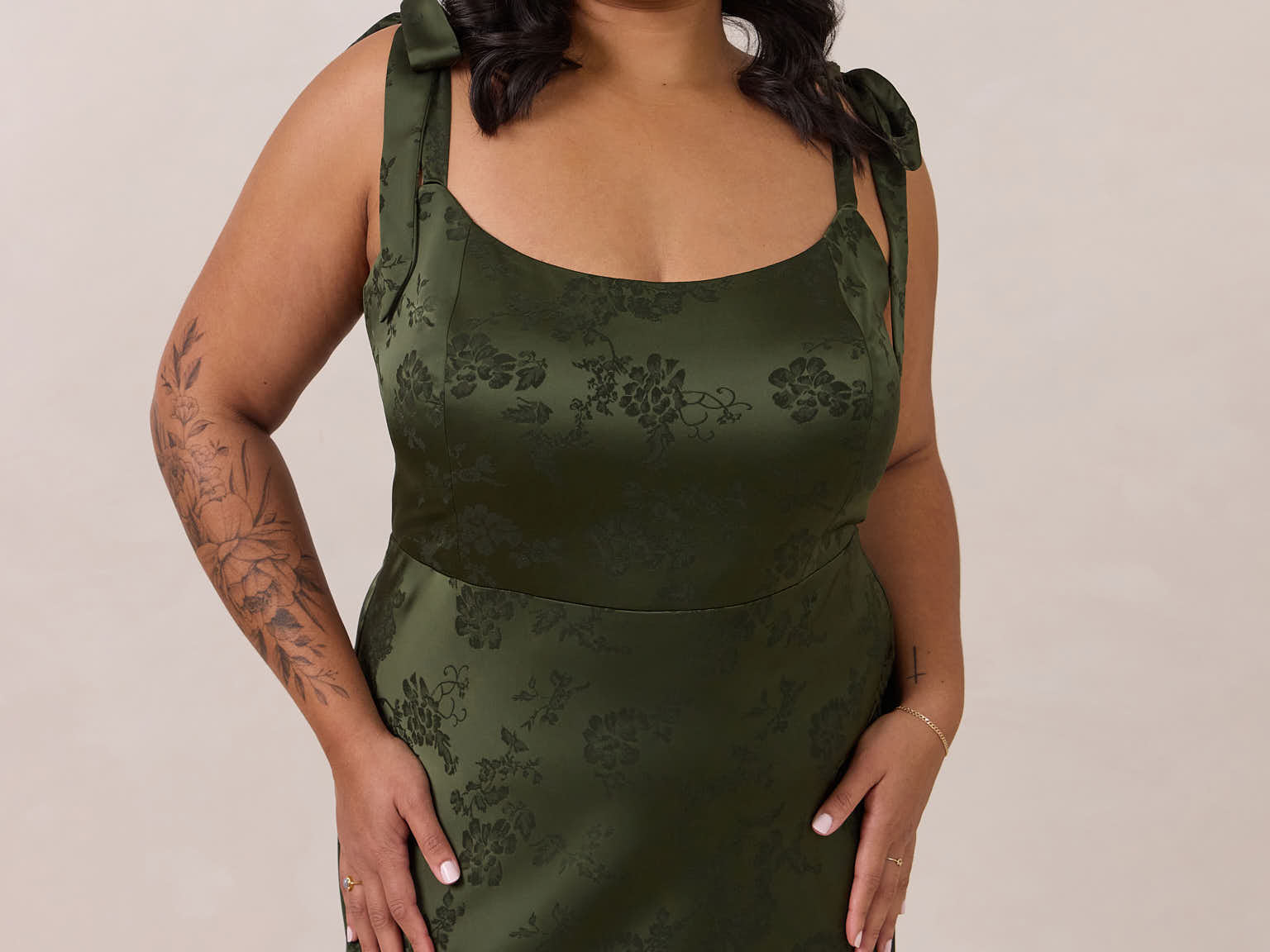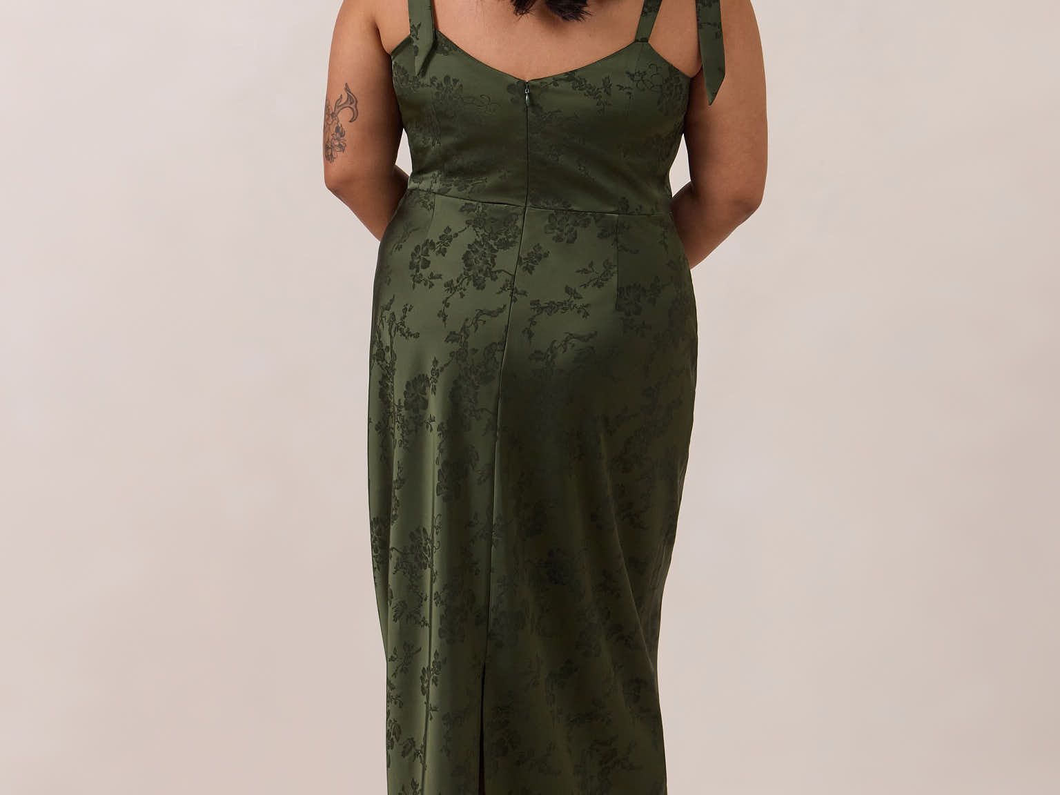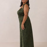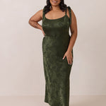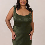 Crafted from luxurious Jacquard satin, this dress features feminine tie straps and a flattering bias-cut skirt, offering a flattering silhouette with timeless appeal.