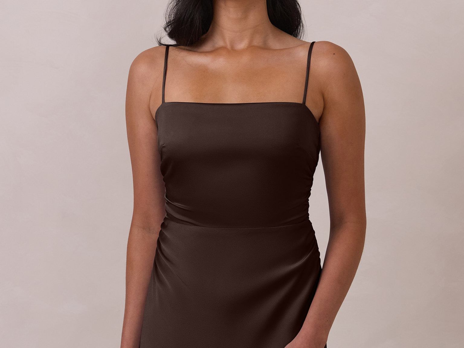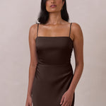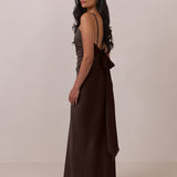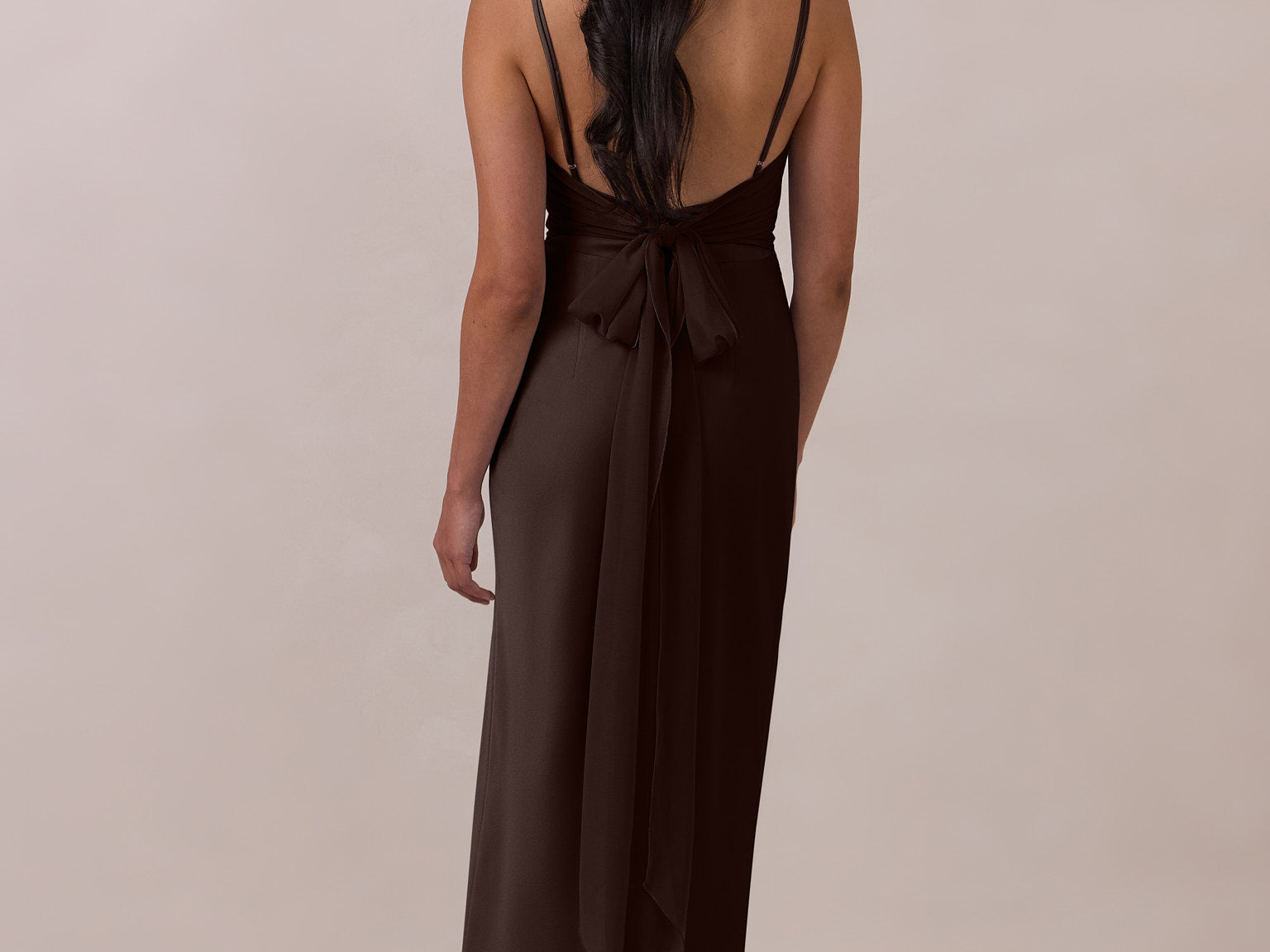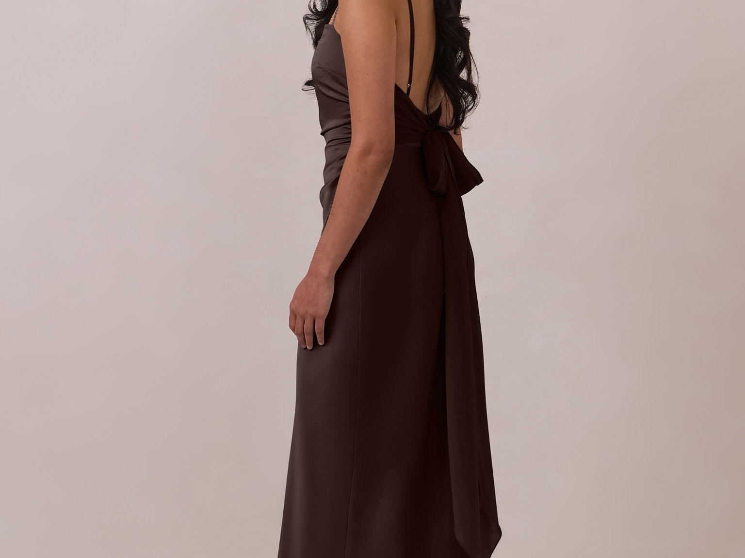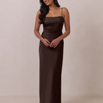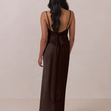 Meet your new occasion essential. This satin midi dress features a clean straight neckline and a fluid, body-skimming silhouette. The open back is finished with a soft stretch-chiffon bow, adding a romantic touch.