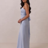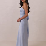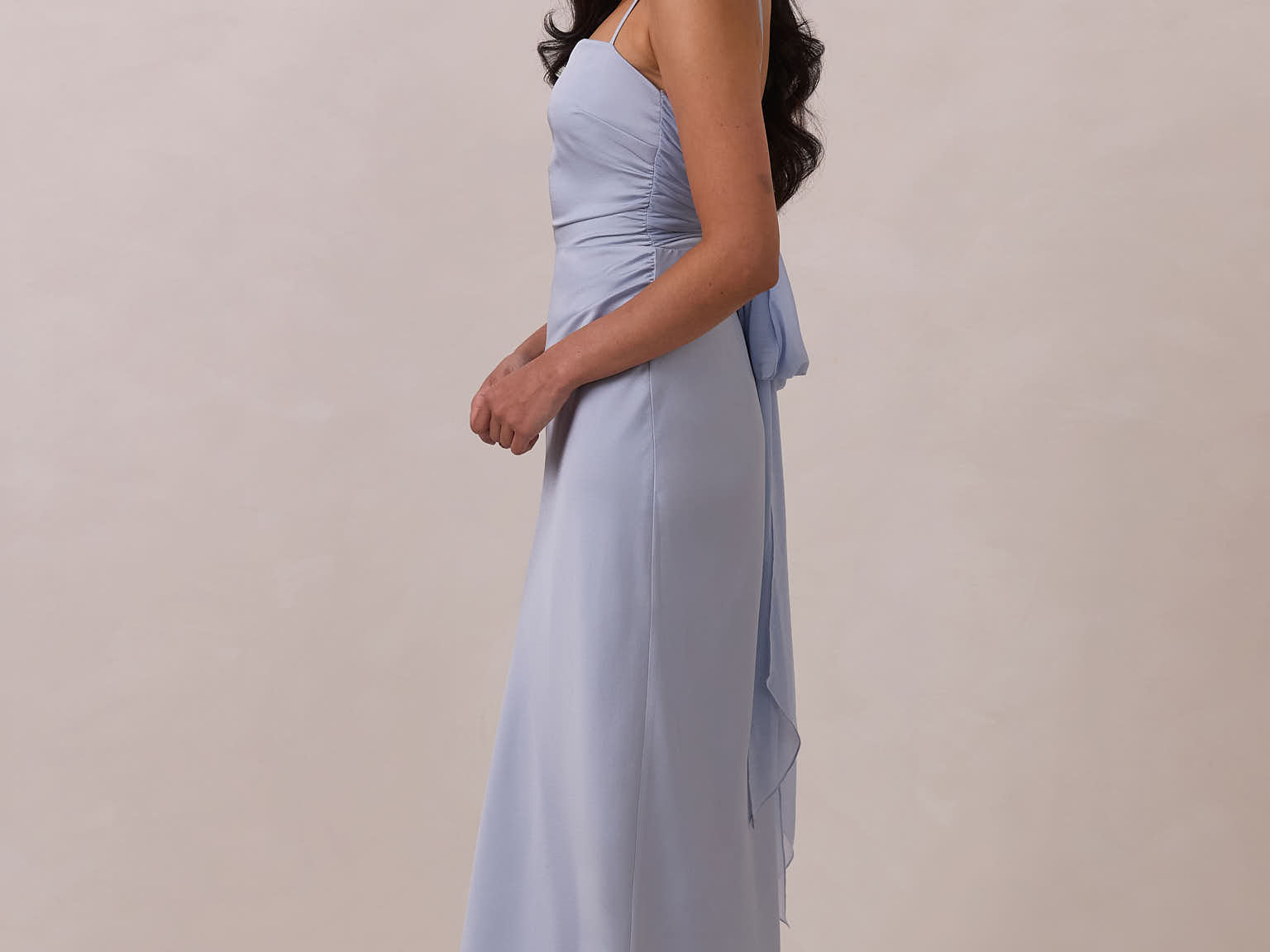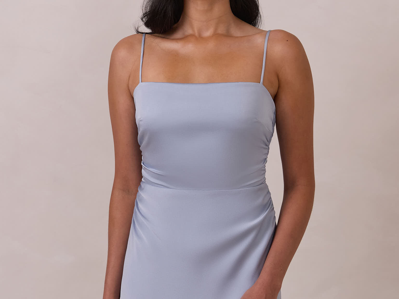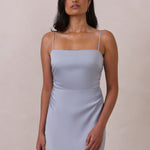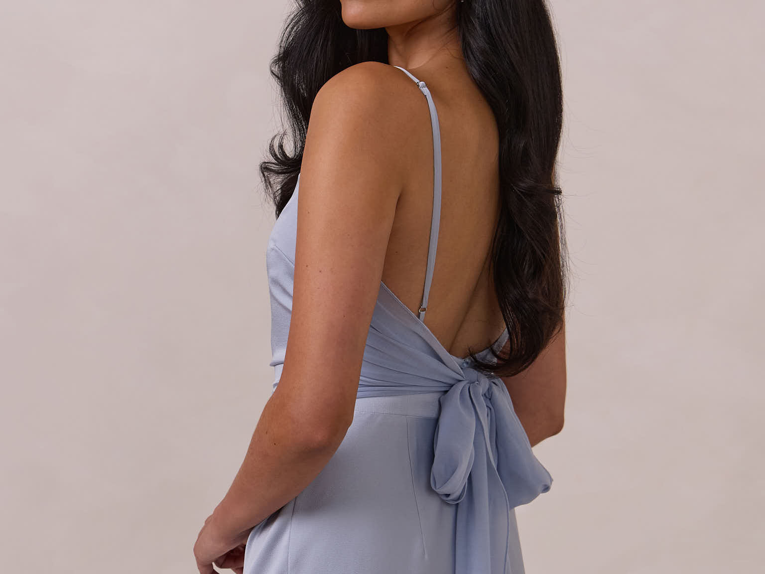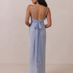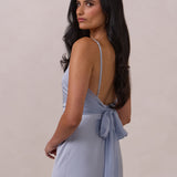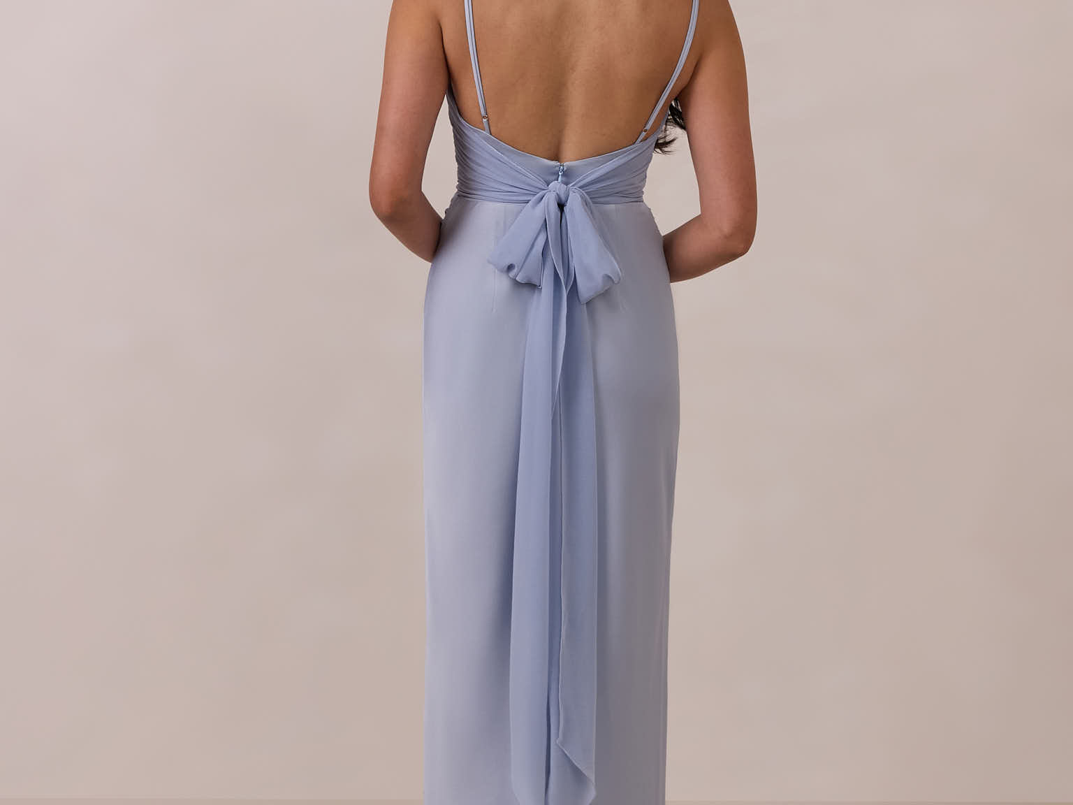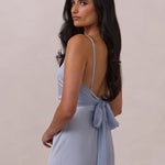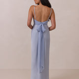 Meet your new occasion essential. This satin midi dress features a clean straight neckline and a fluid, body-skimming silhouette. The open back is finished with a soft stretch-chiffon bow, adding a romantic touch.