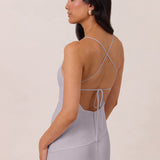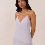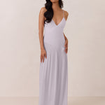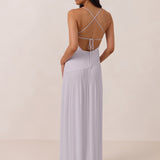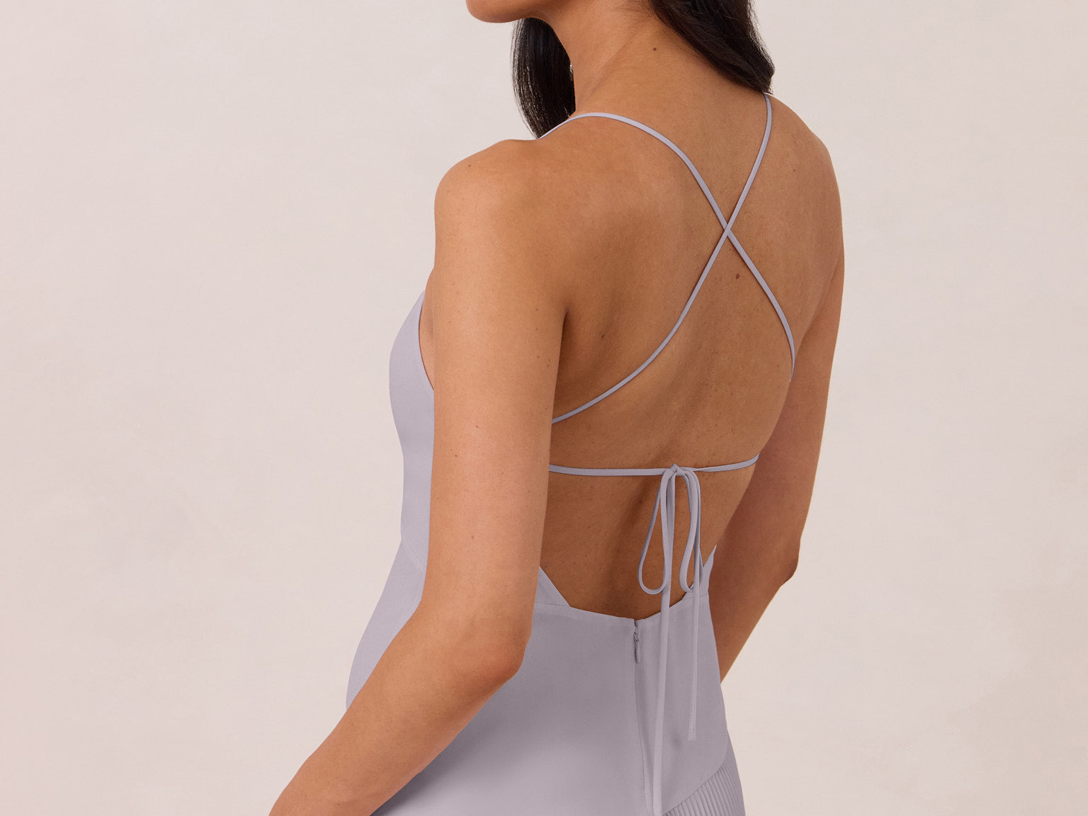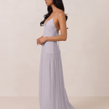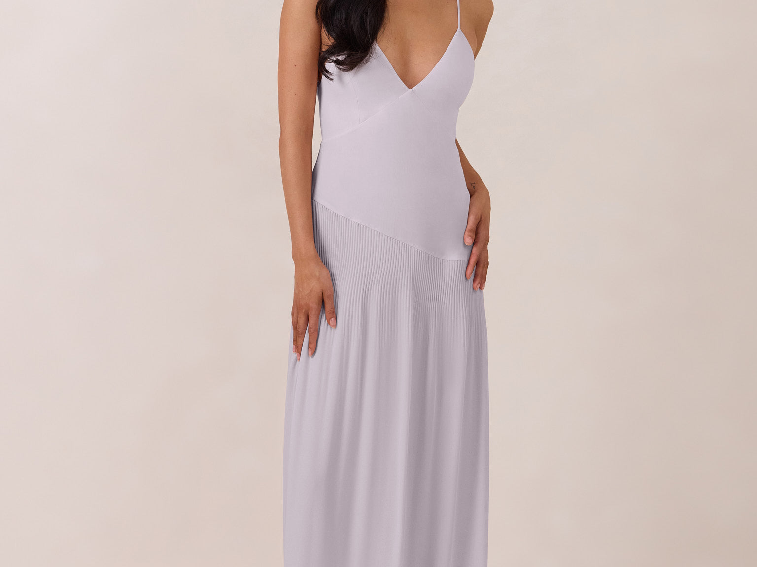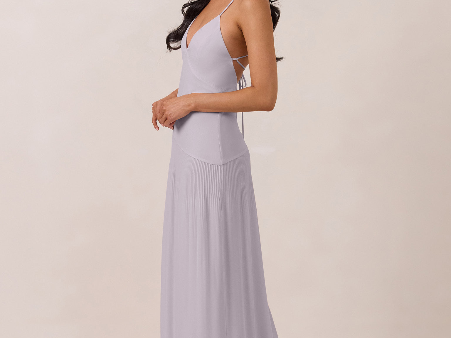 This full-length chiffon gown offers a flattering silhouette with its gently fitted bodice, soft V-neckline, and open back. The lightweight chiffon drapes beautifully, forming a flowing, pleated skirt that moves with ease for a clean, elevated finish. Fully lined for comfort and confidence.