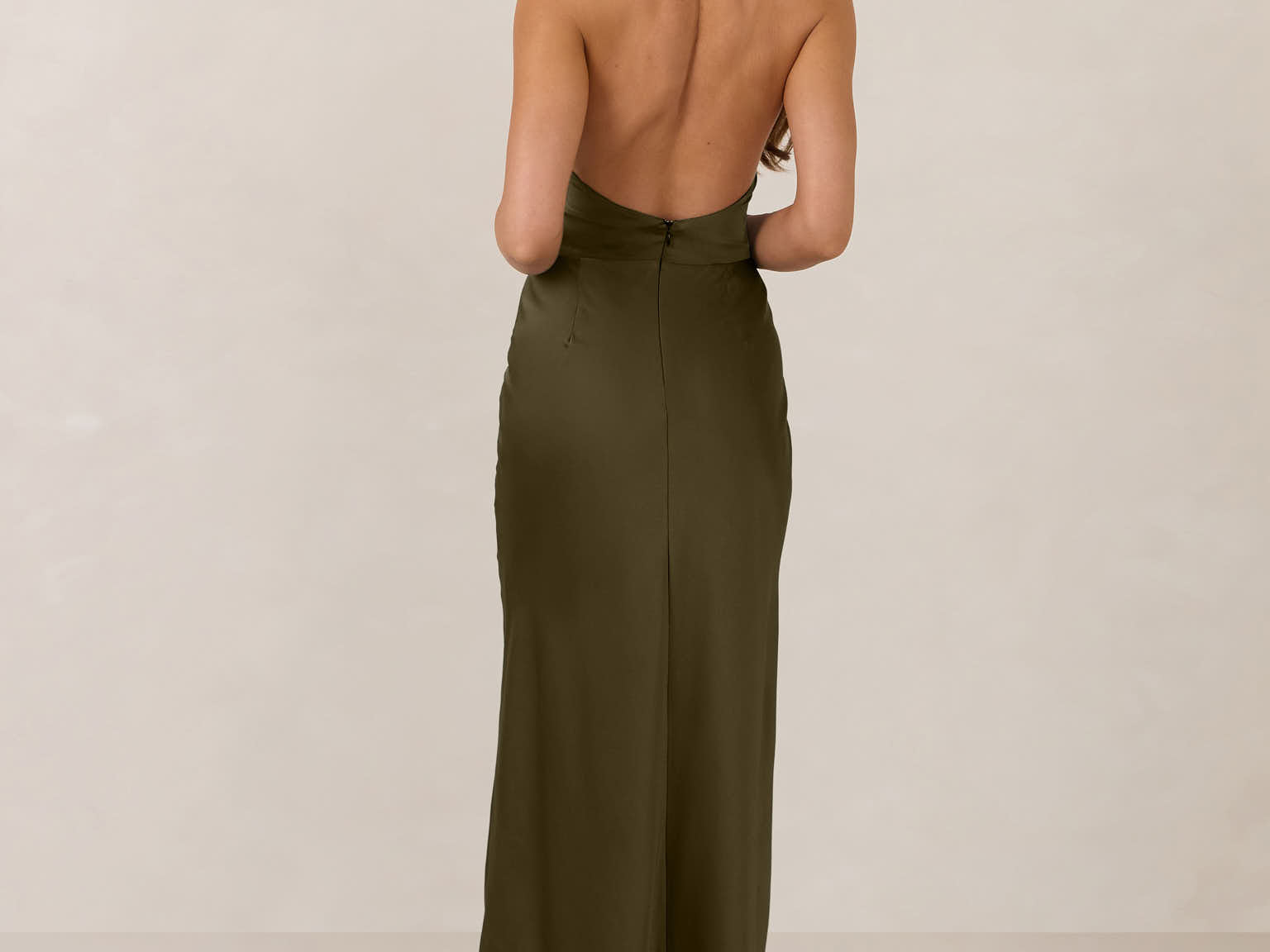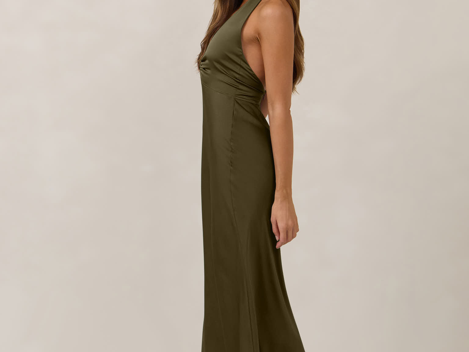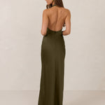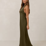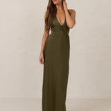 The perfect balance between bold and refined, this satin halter dress is designed to turn heads with quiet confidence. Featuring a plunging halter neckline that highlights the neck and collarbone, it's finished with a cinched detail at the bust to enhance shape and create a beautifully flattering silhouette.