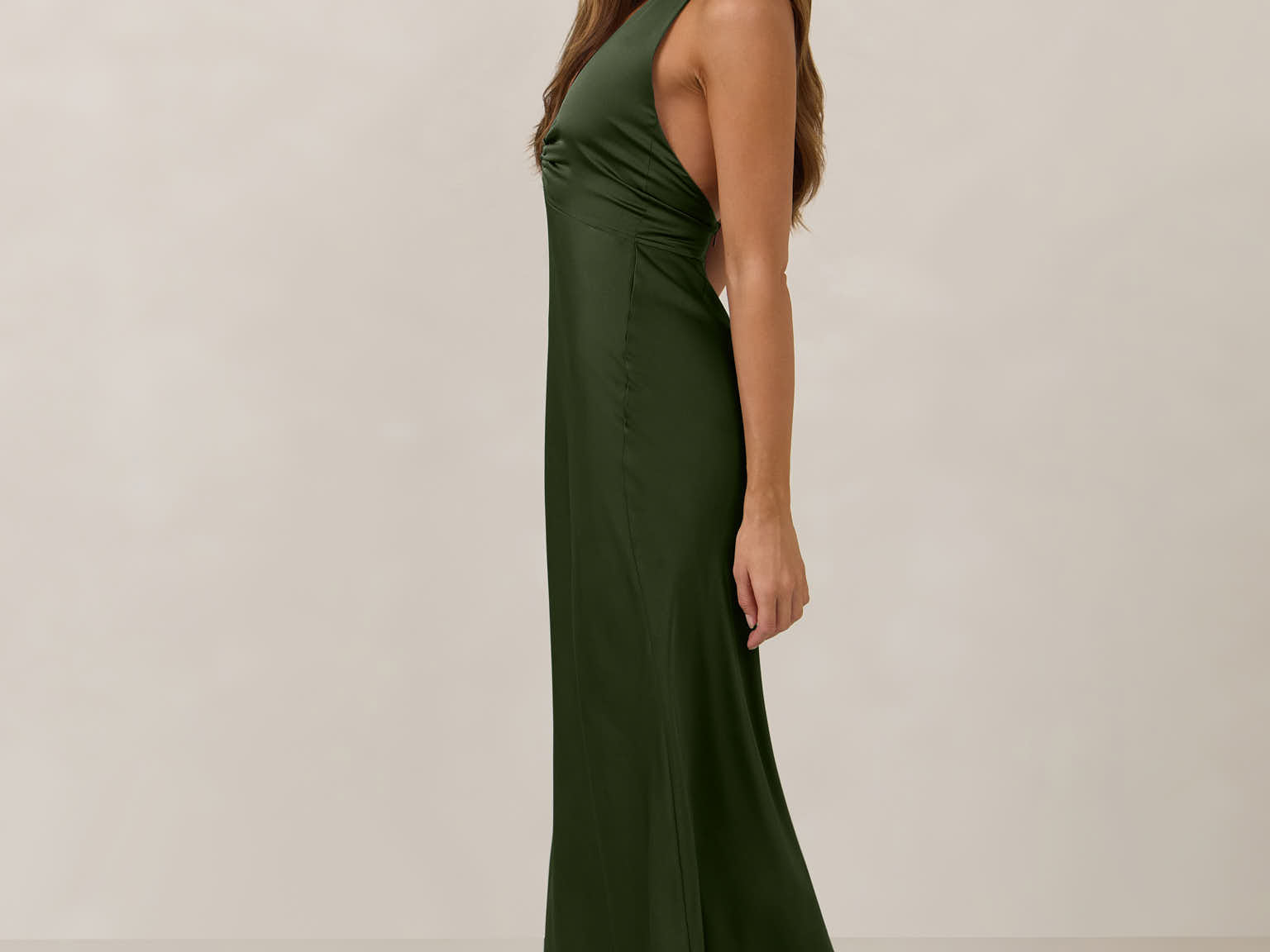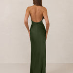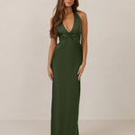 The perfect balance between bold and refined, this satin halter dress is designed to turn heads with quiet confidence. Featuring a plunging halter neckline that highlights the neck and collarbone, it's finished with a cinched detail at the bust to enhance shape and create a beautifully flattering silhouette.