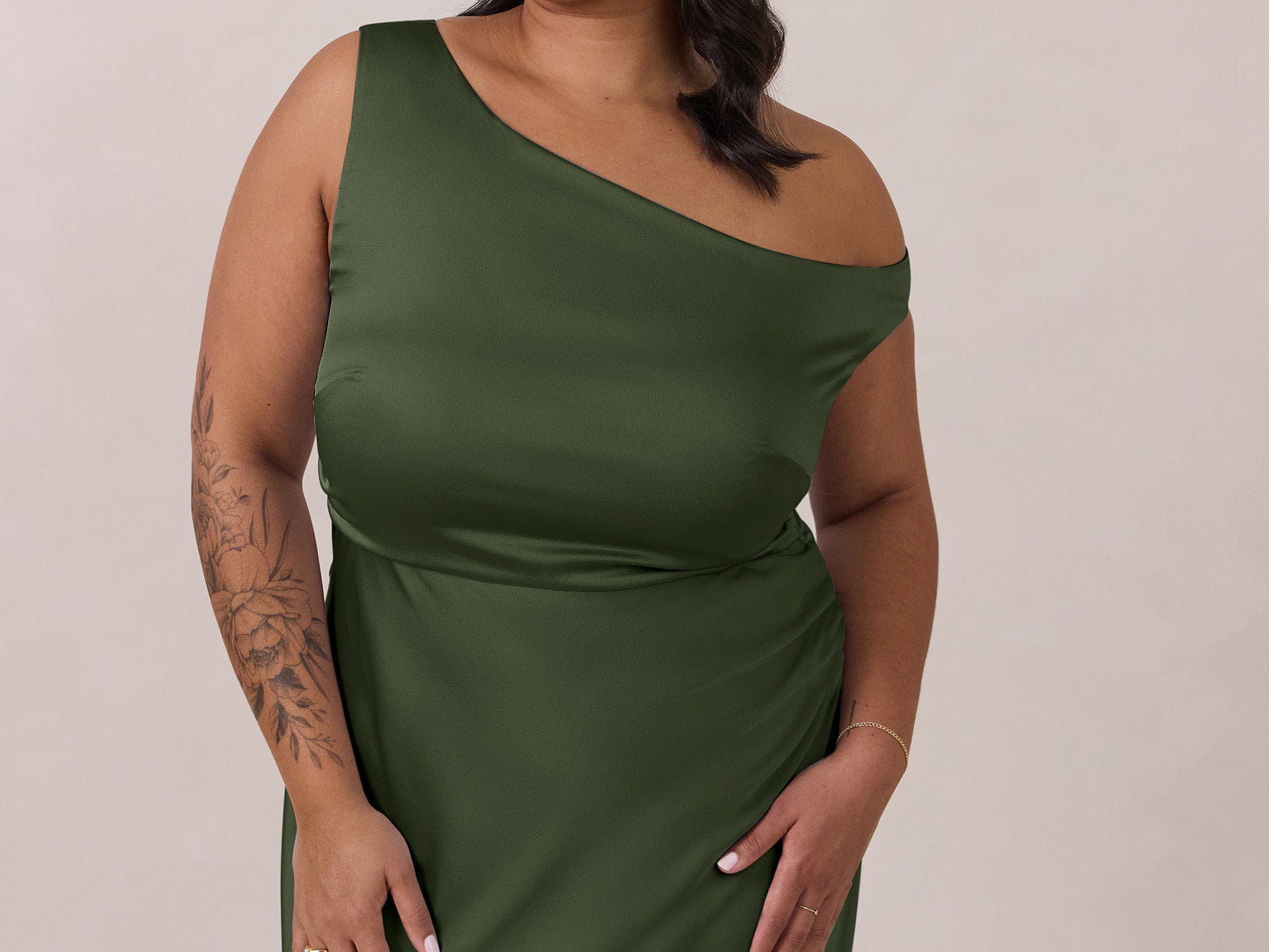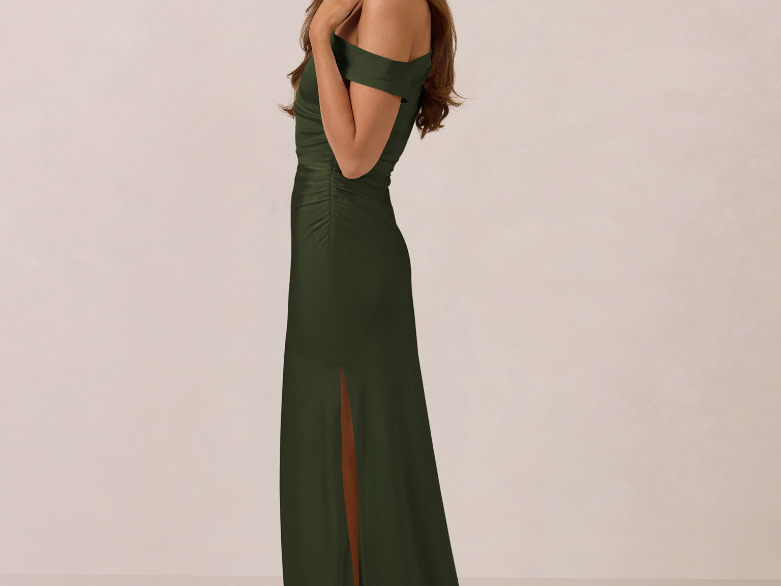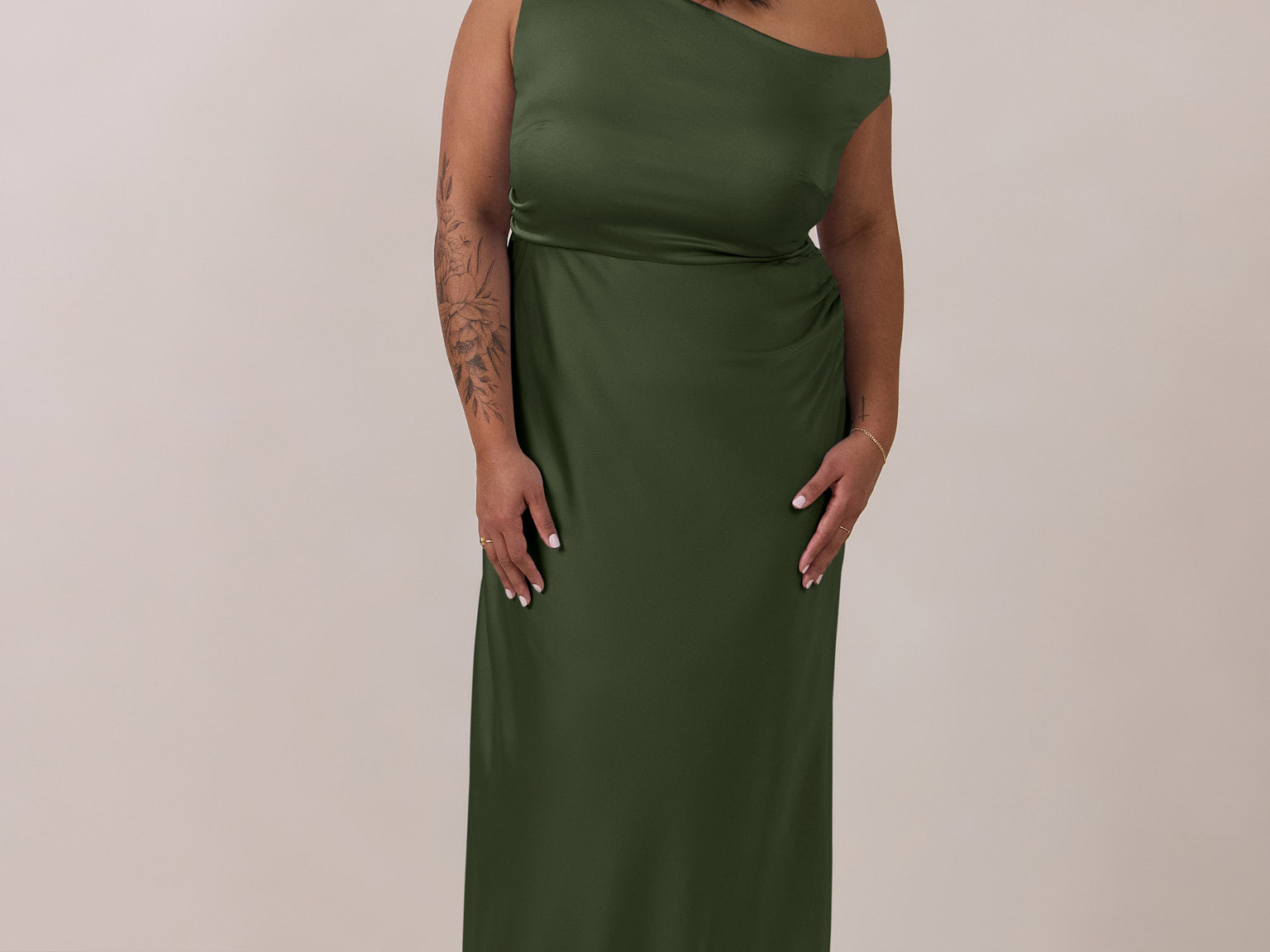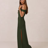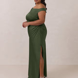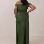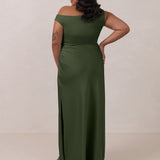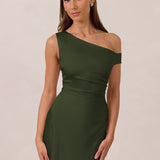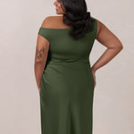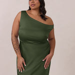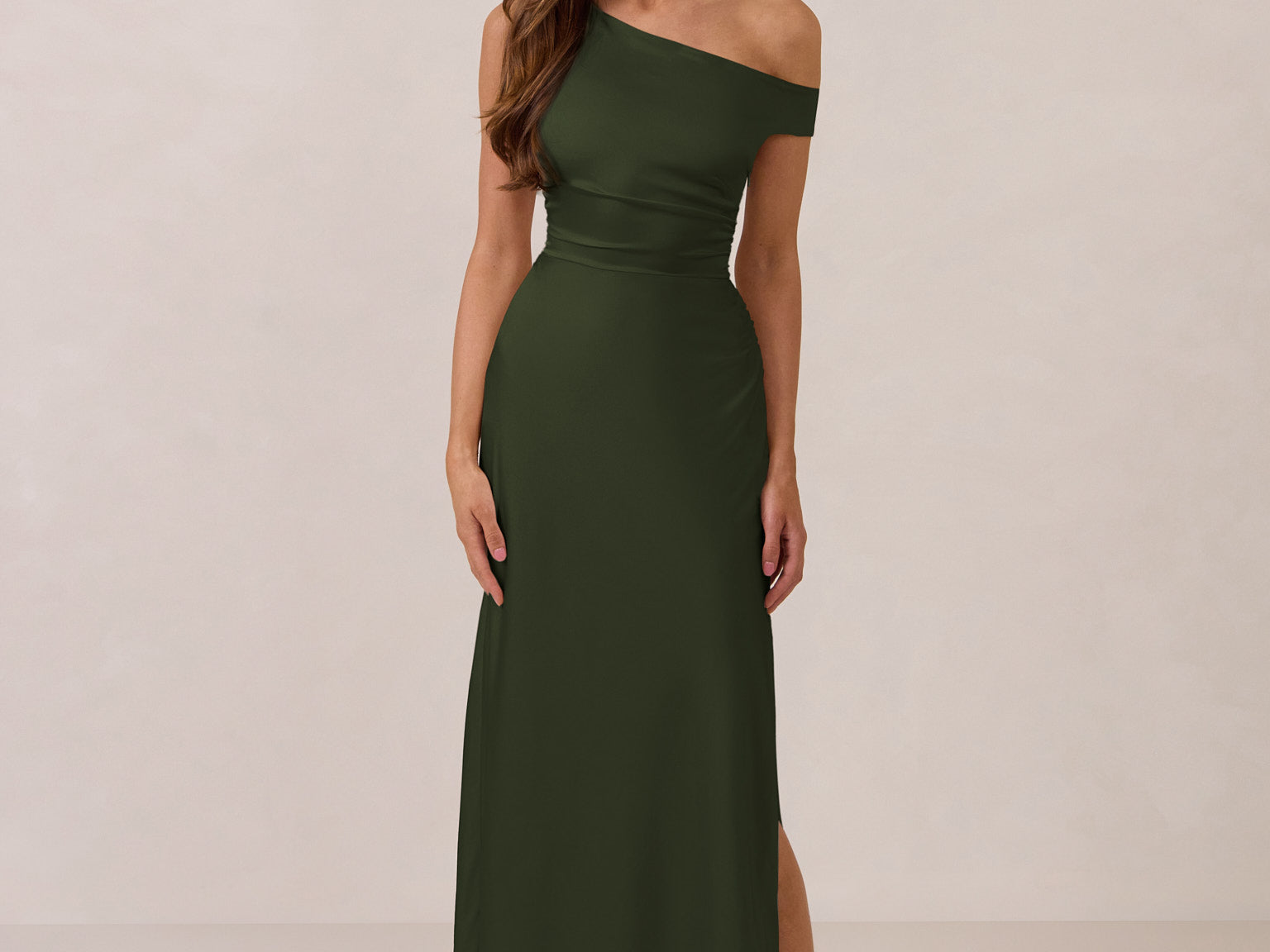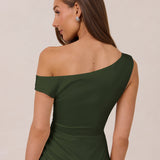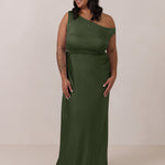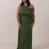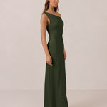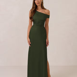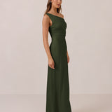 We love an asymmetrical neckline. This full-length dress strikes the perfect balance between modern sophistication and a flattering fit with its elegant silhouette, slightly gathered bodice, and a stylish side slit for a touch of effortless elegance.