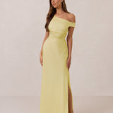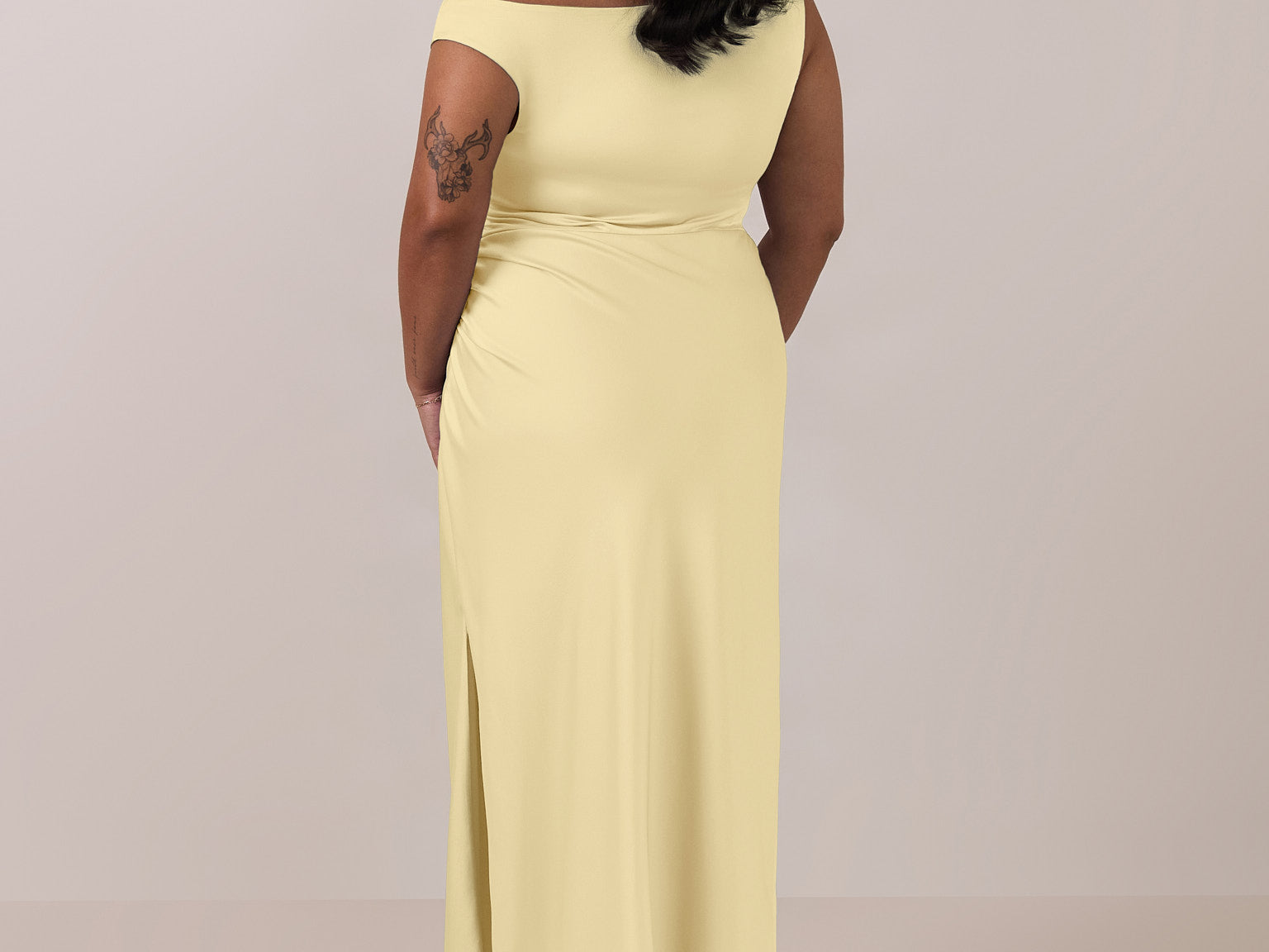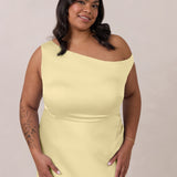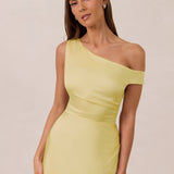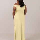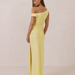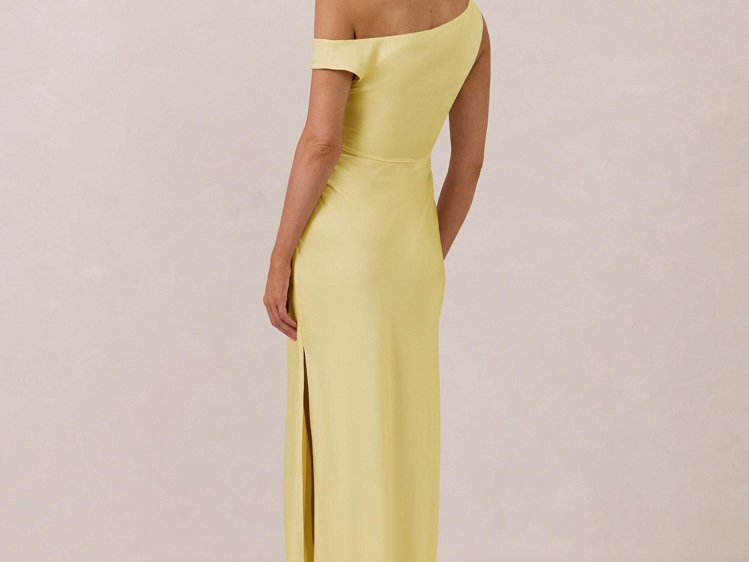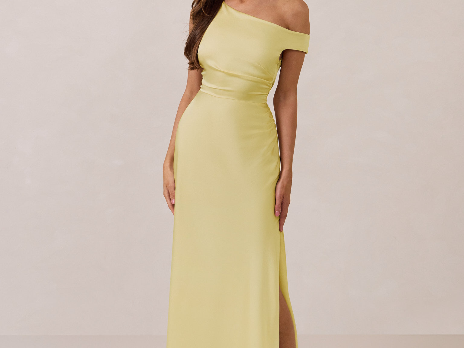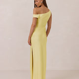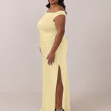 We love an asymmetrical neckline. This full-length dress strikes the perfect balance between modern sophistication and a flattering fit with its elegant silhouette, slightly gathered bodice, and a stylish side slit for a touch of effortless elegance.