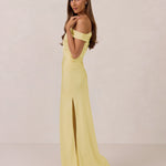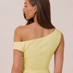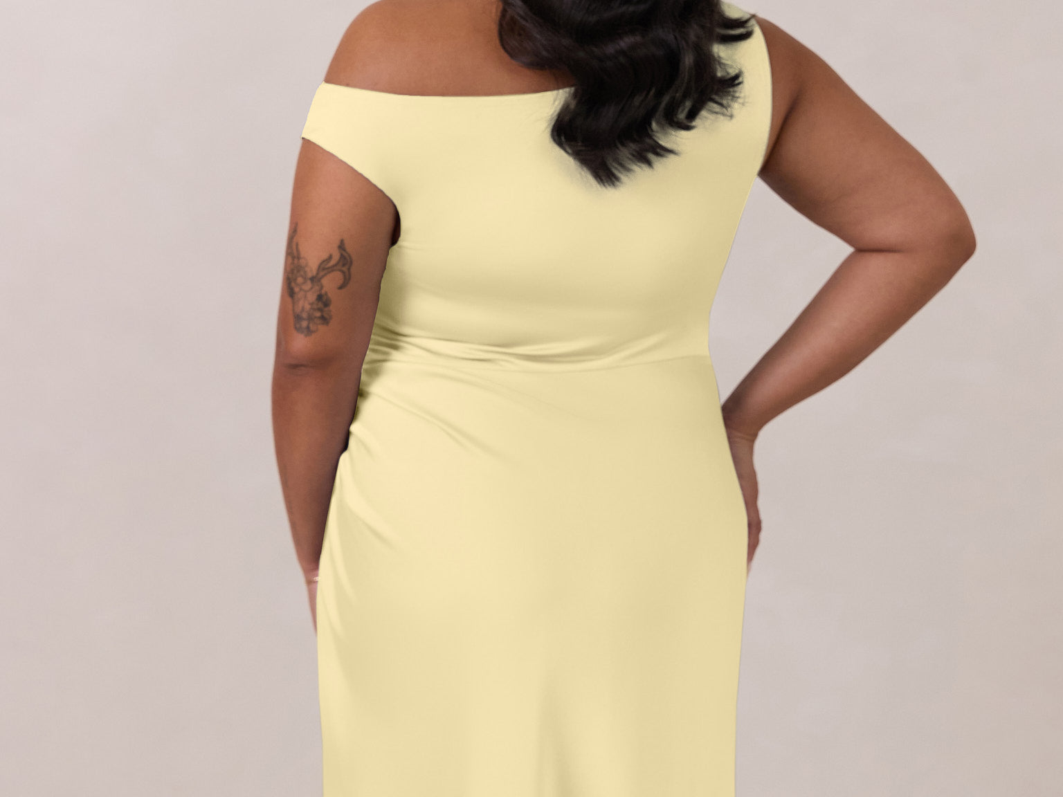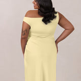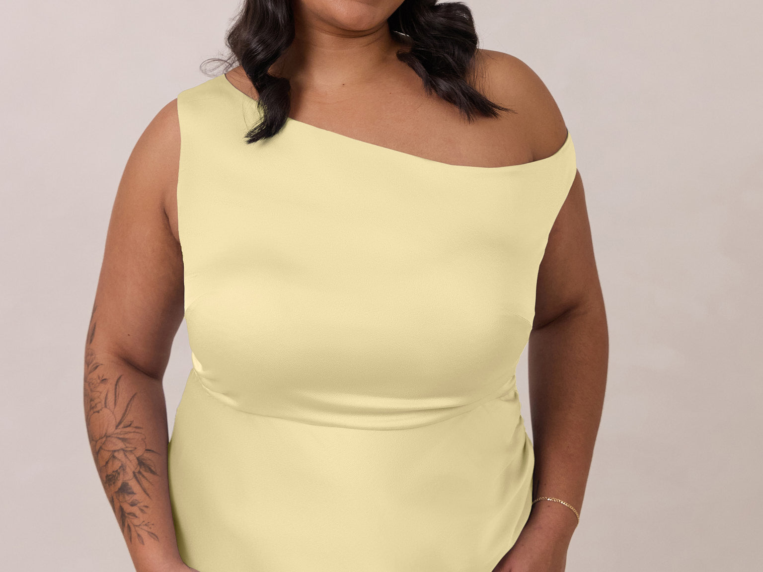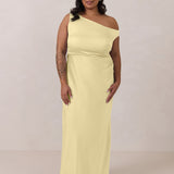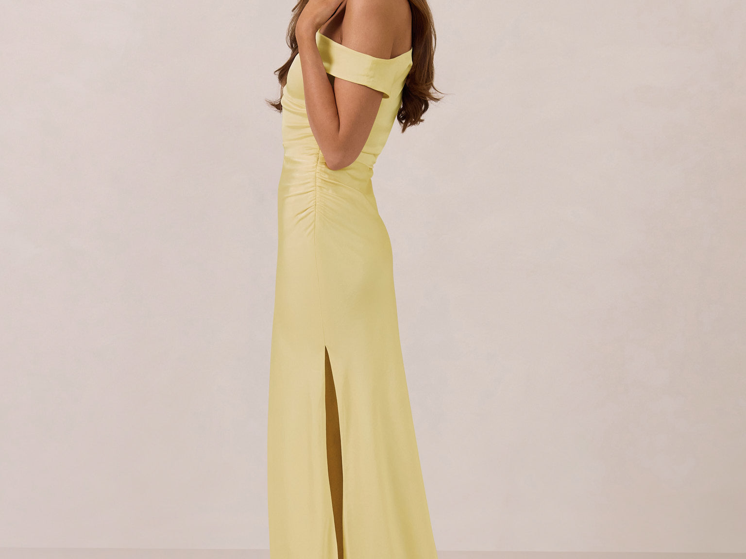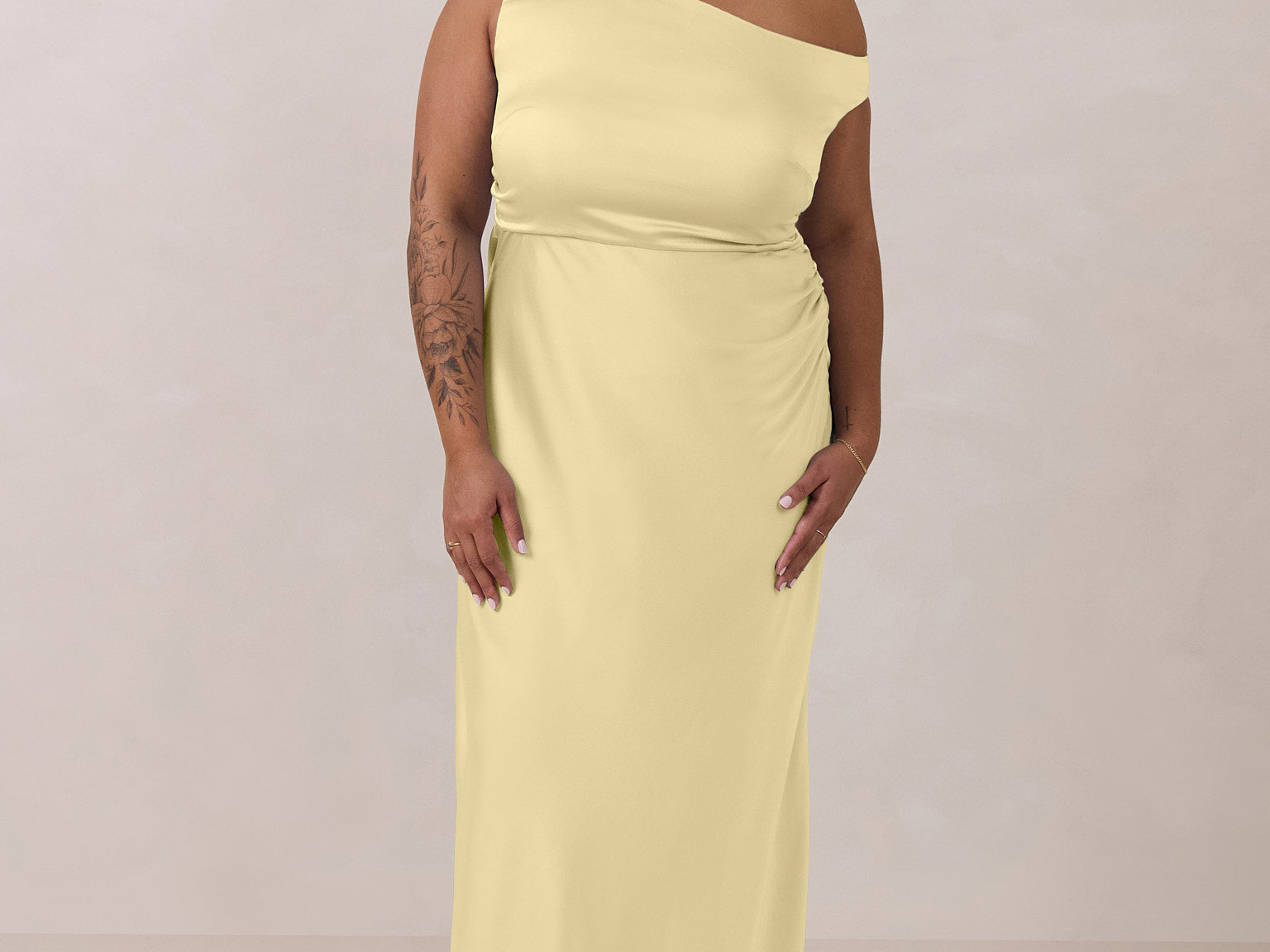 We love an asymmetrical neckline. This full-length dress strikes the perfect balance between modern sophistication and a flattering fit with its elegant silhouette, slightly gathered bodice, and a stylish side slit for a touch of effortless elegance.