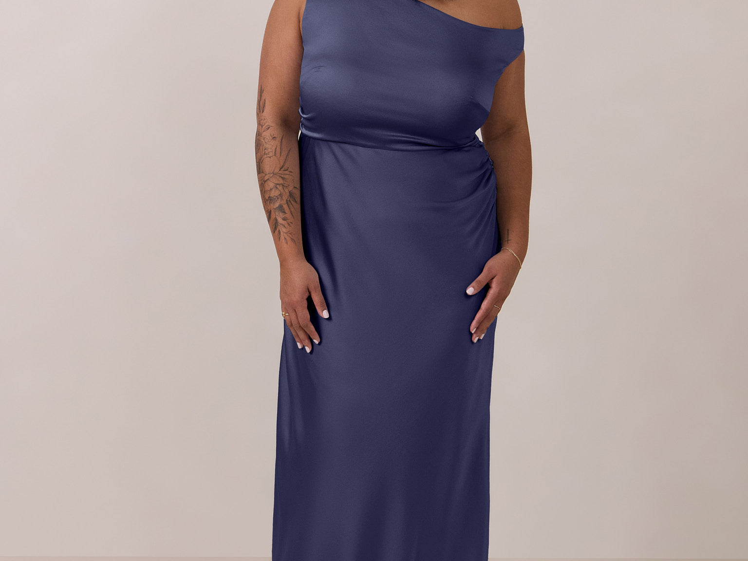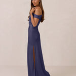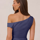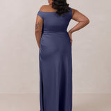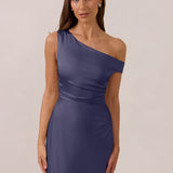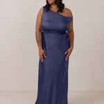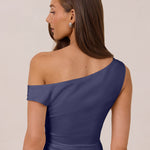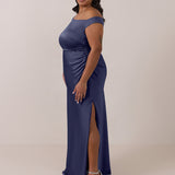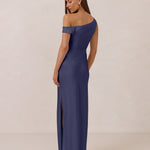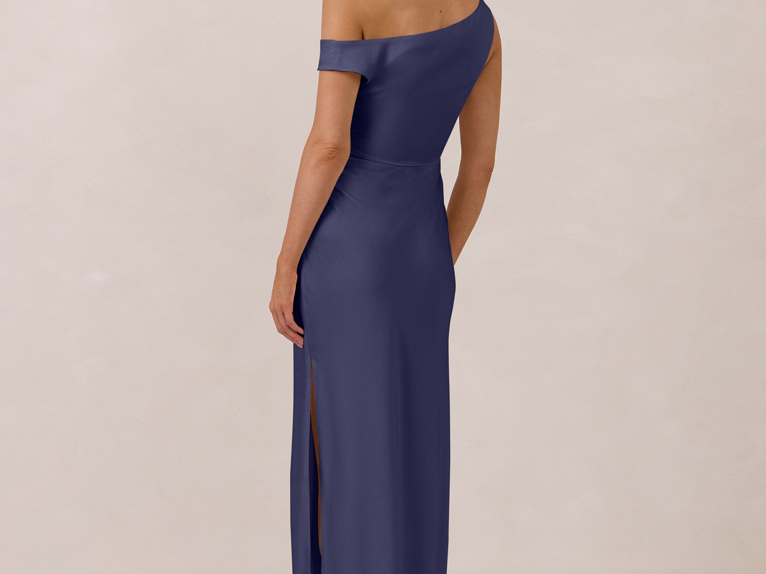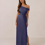 We love an asymmetrical neckline. This full-length dress strikes the perfect balance between modern sophistication and a flattering fit with its elegant silhouette, slightly gathered bodice, and a stylish side slit for a touch of effortless elegance.