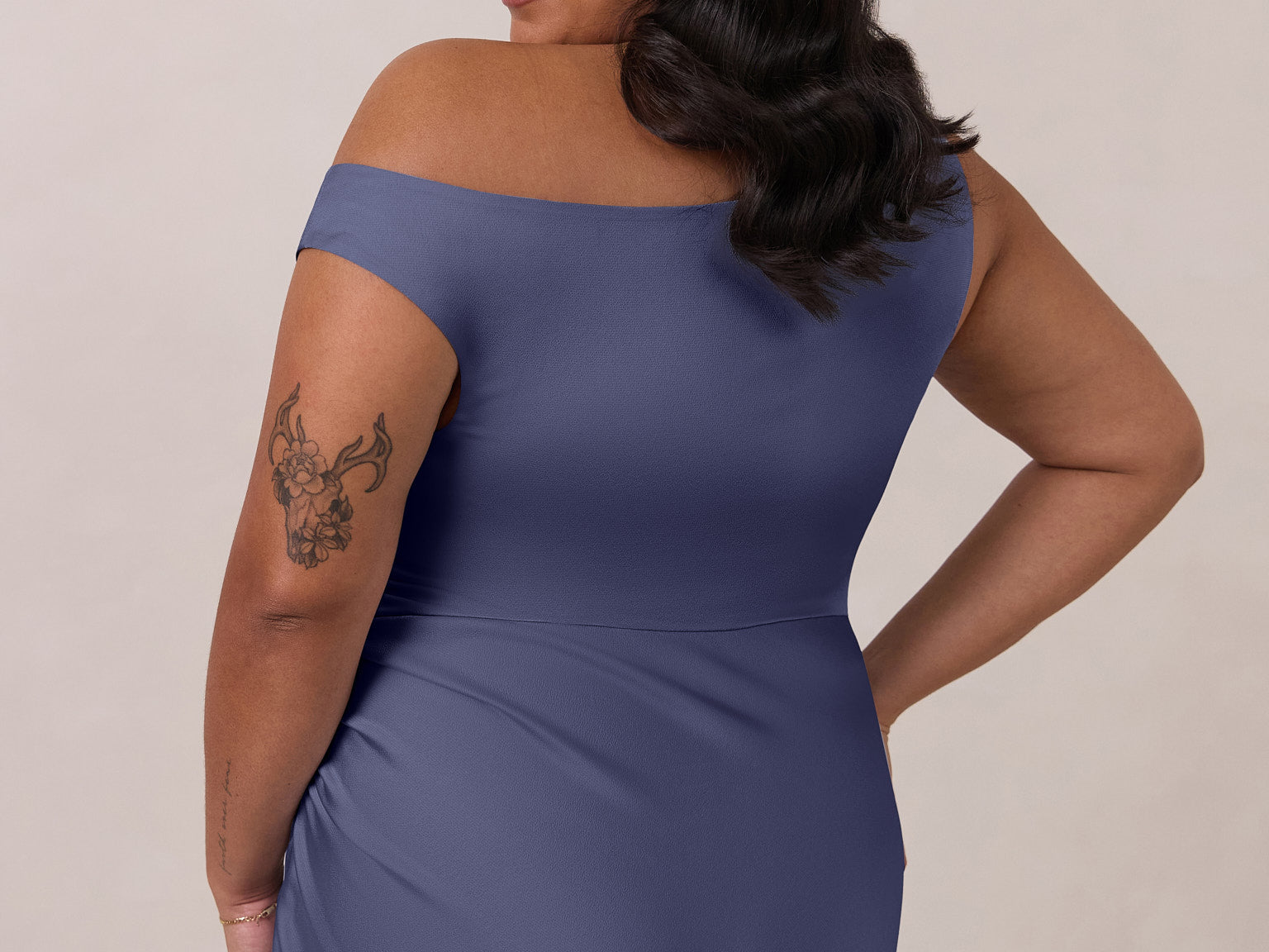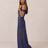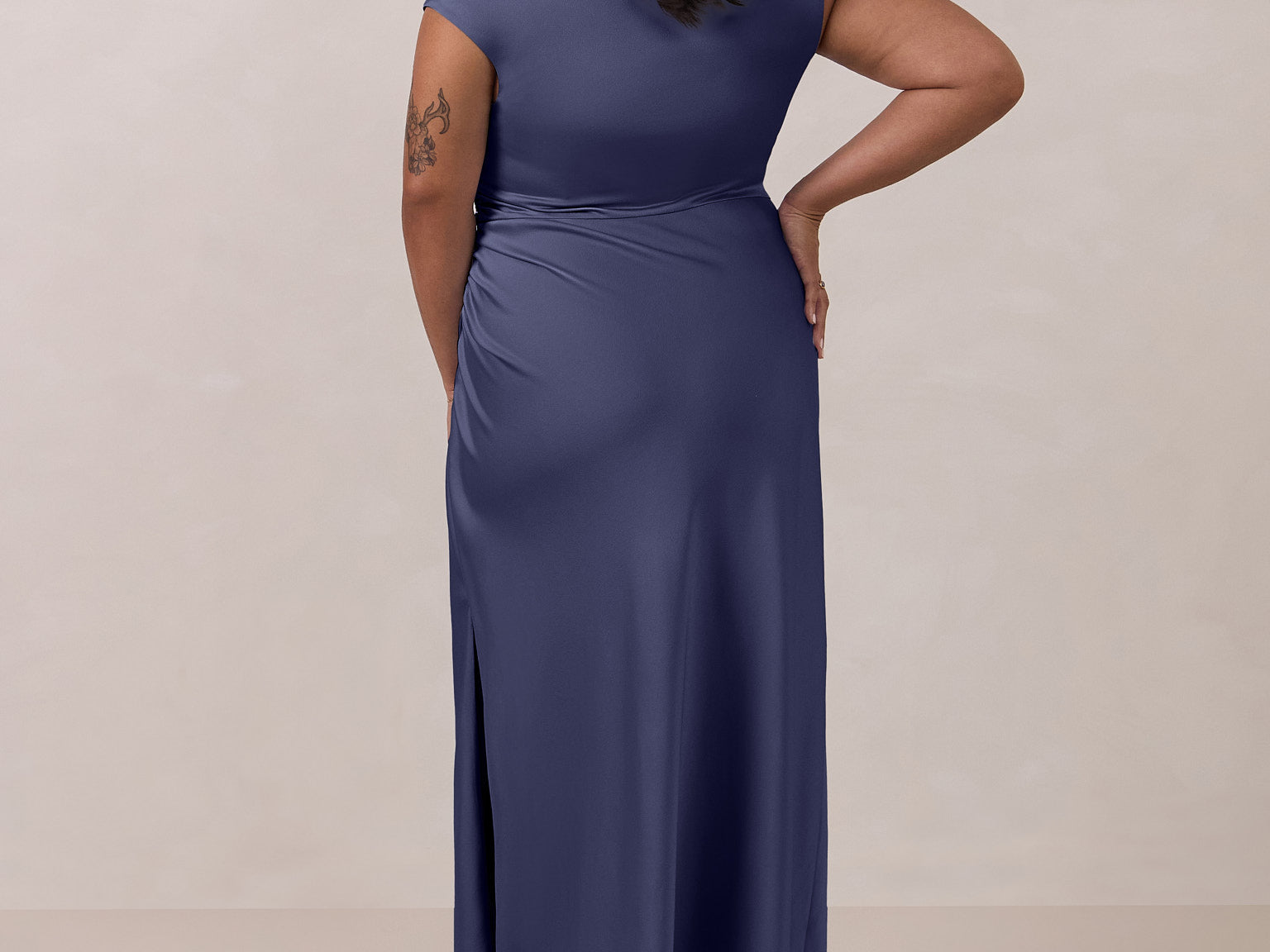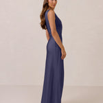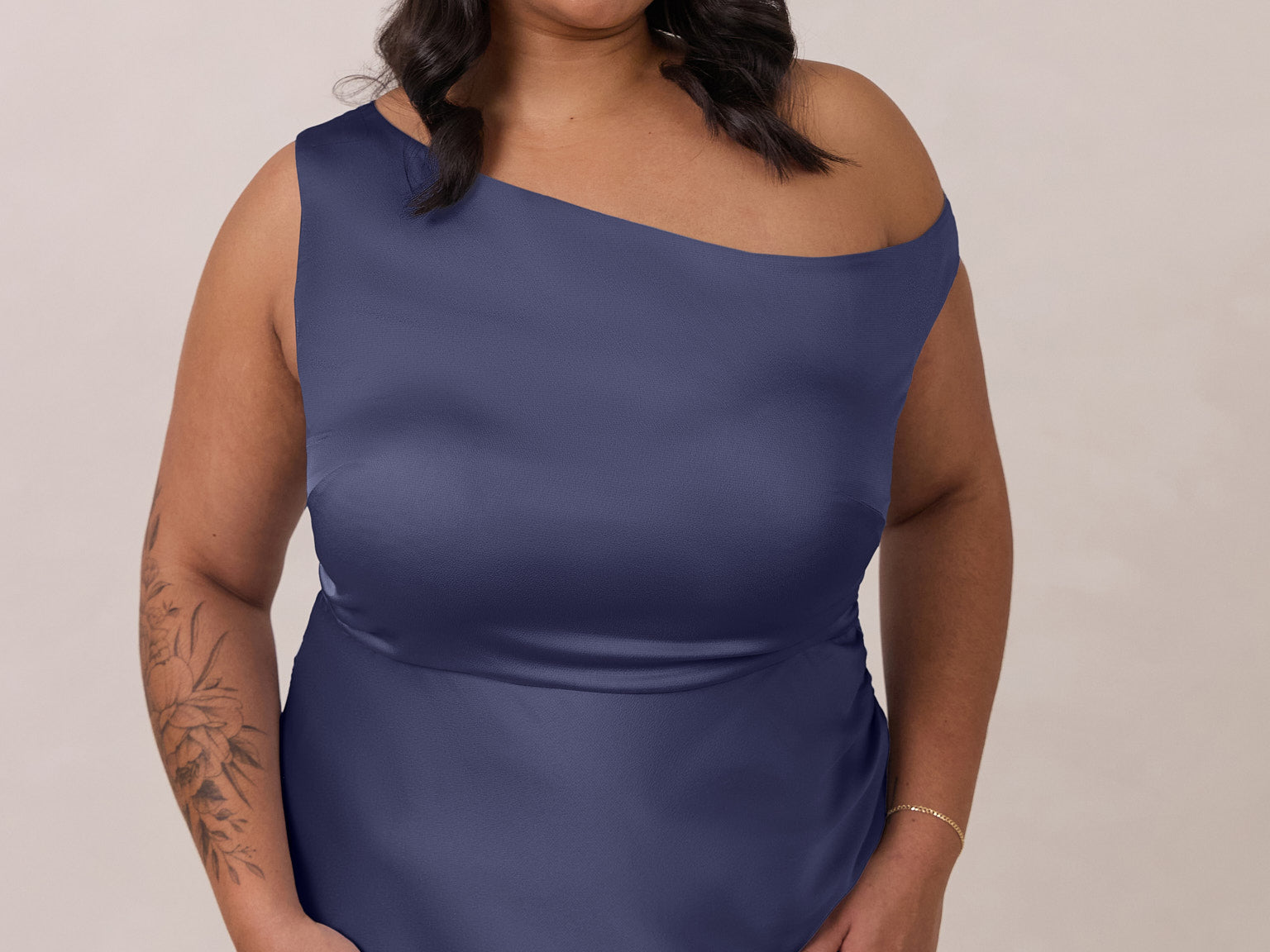 We love an asymmetrical neckline. This full-length dress strikes the perfect balance between modern sophistication and a flattering fit with its elegant silhouette, slightly gathered bodice, and a stylish side slit for a touch of effortless elegance.
