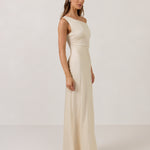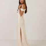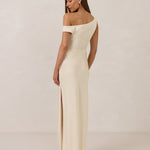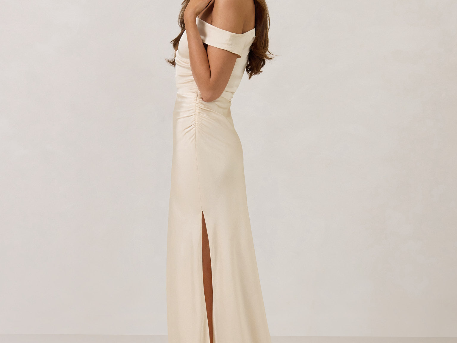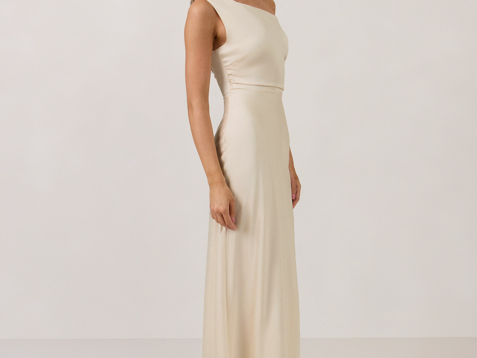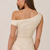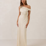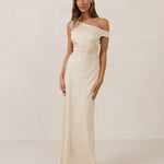 We love an asymmetrical neckline. This full-length dress strikes the perfect balance between modern sophistication and a flattering fit with its elegant silhouette, slightly gathered bodice, and a stylish side slit for a touch of effortless elegance.