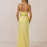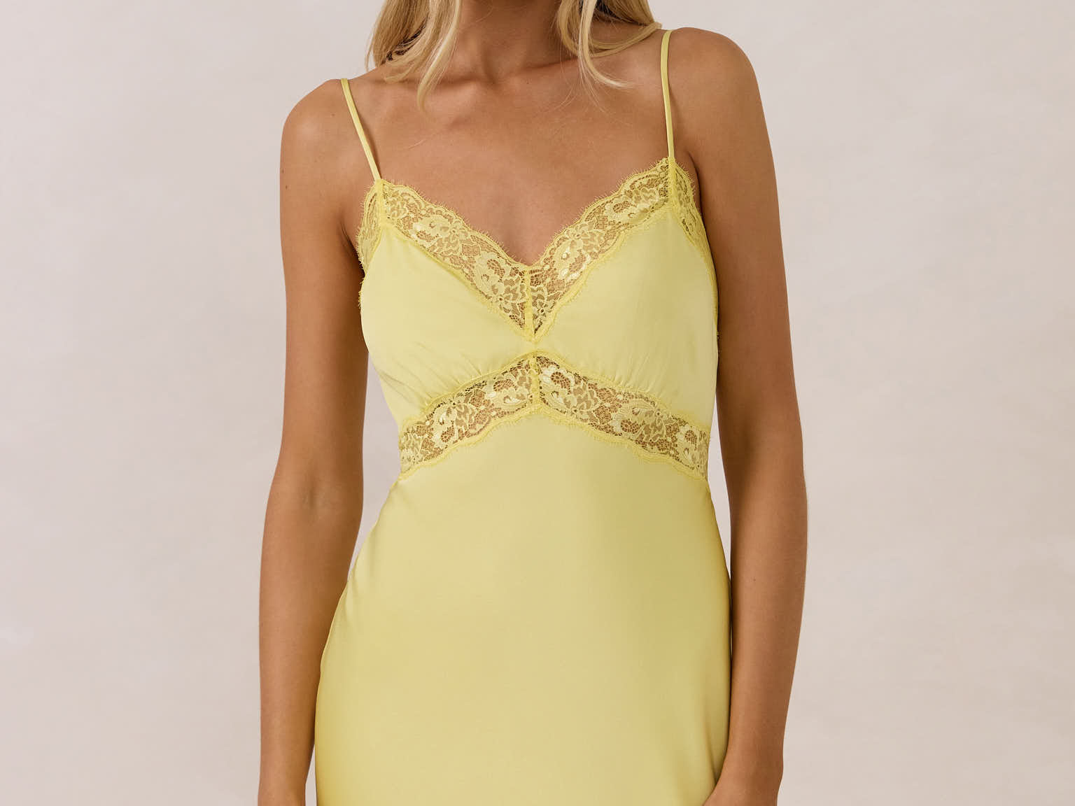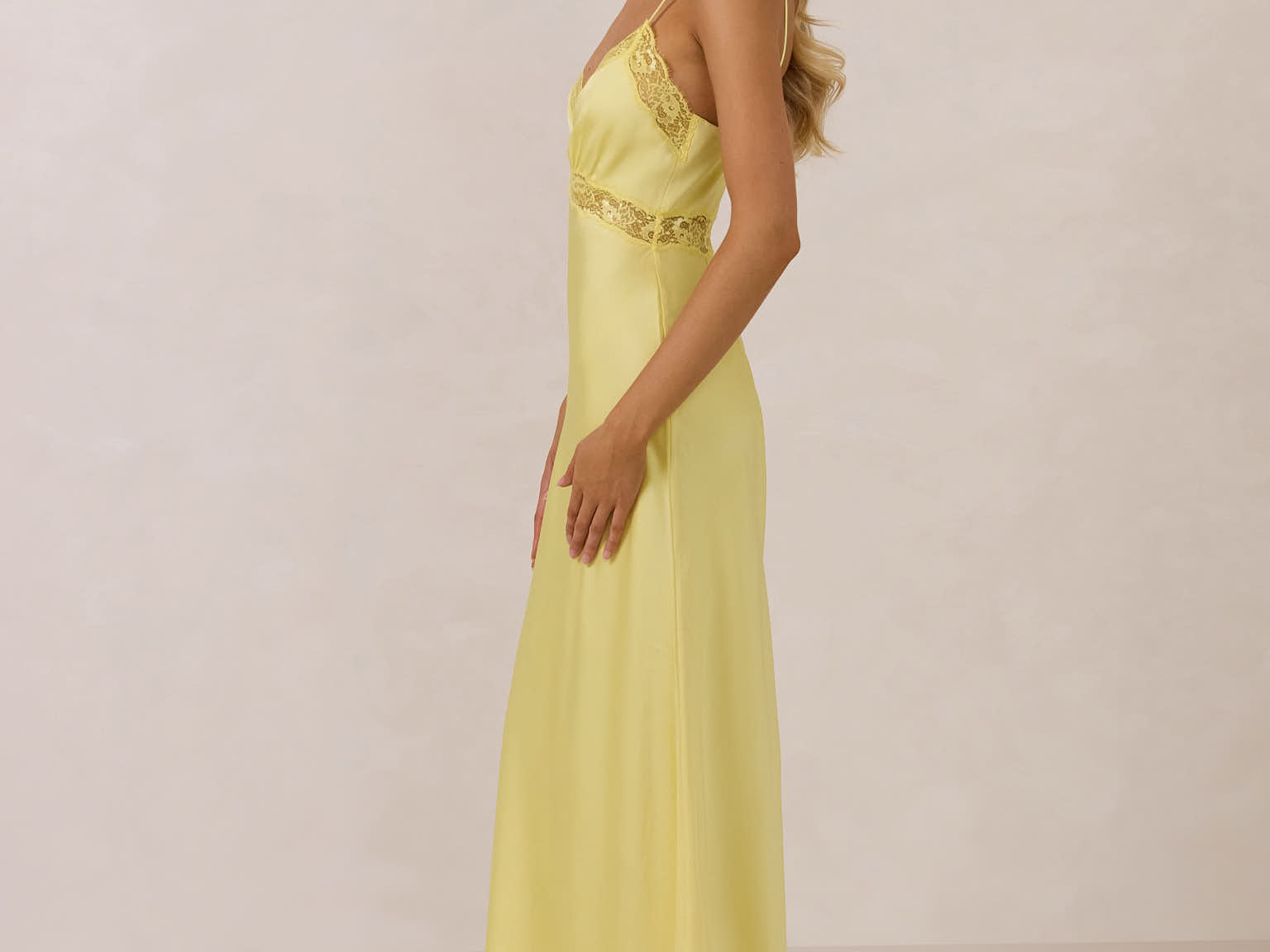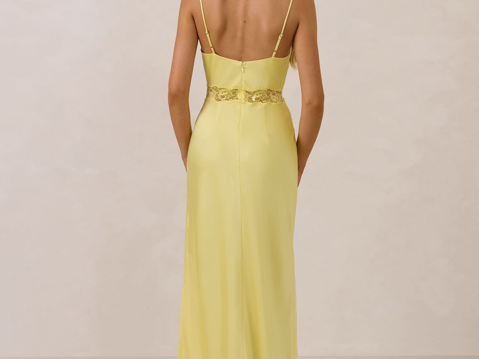 The Theodora is an elevated take on the classic slip dress, made from satin and cut on a bias for an elegant drape. It features a deep lace-trimmed neckline for a romantic touch. This full-length dress offers a fitted silhouette with adjustable straps and a discreet side zip, creating an effortlessly impactful look.
